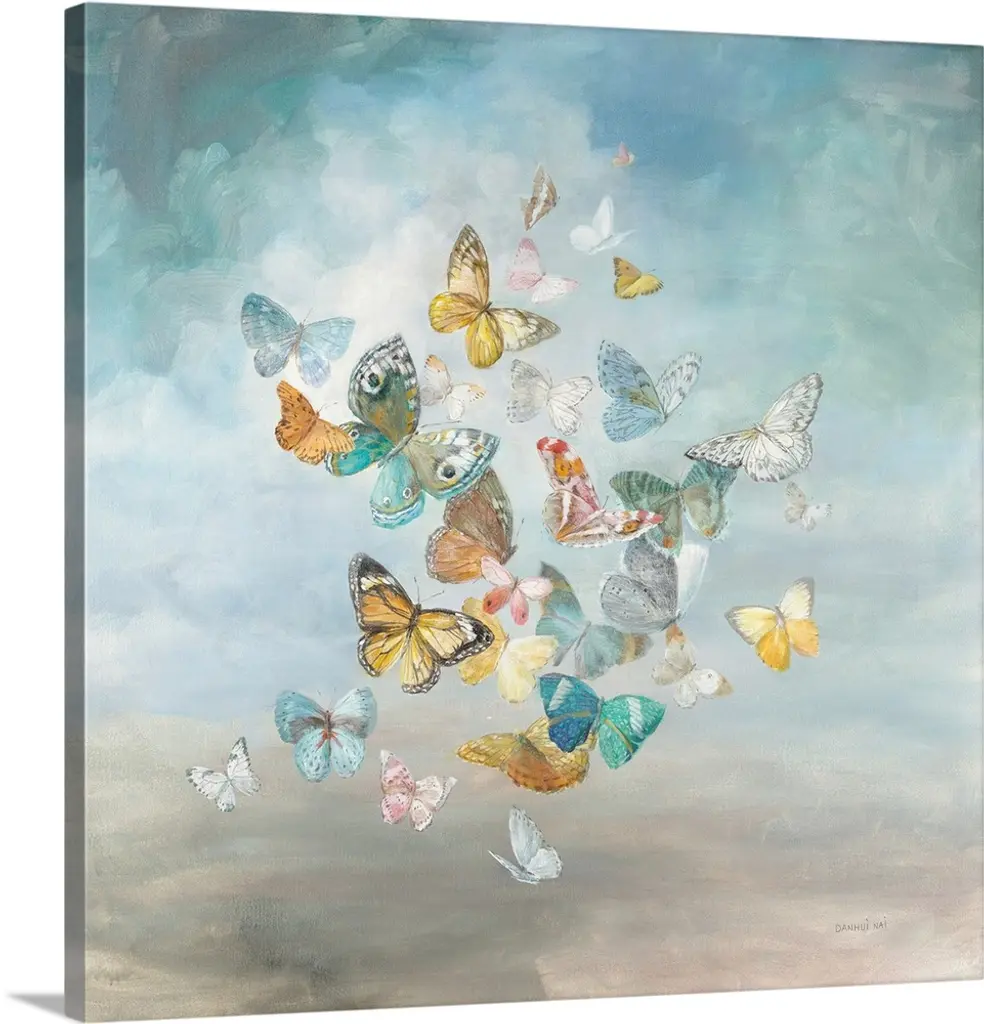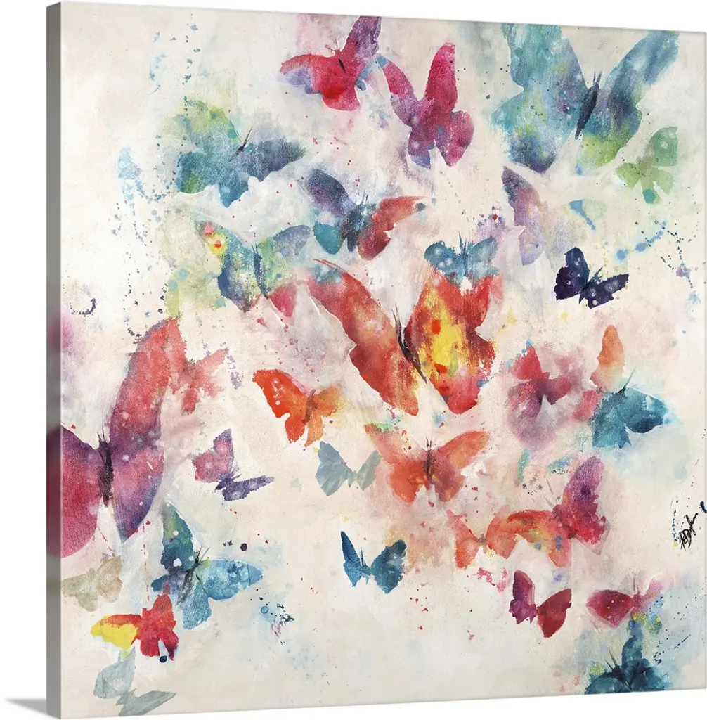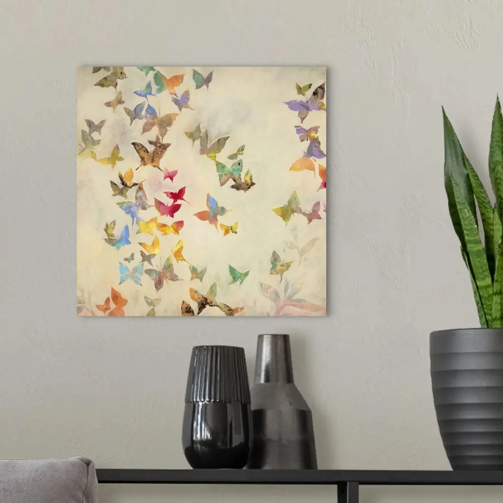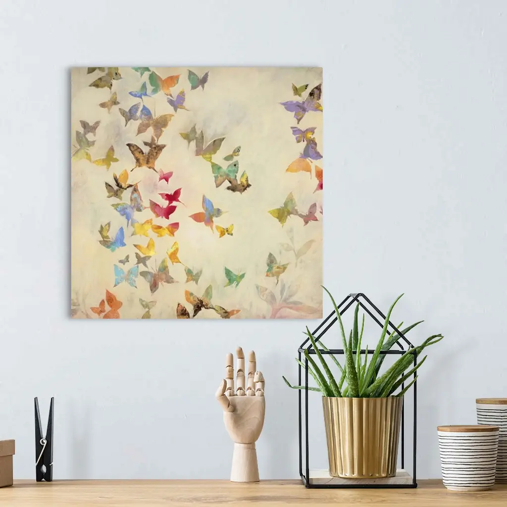 Contemporary painting of fluttering butterflies in a spectrum of colors against a cream background.