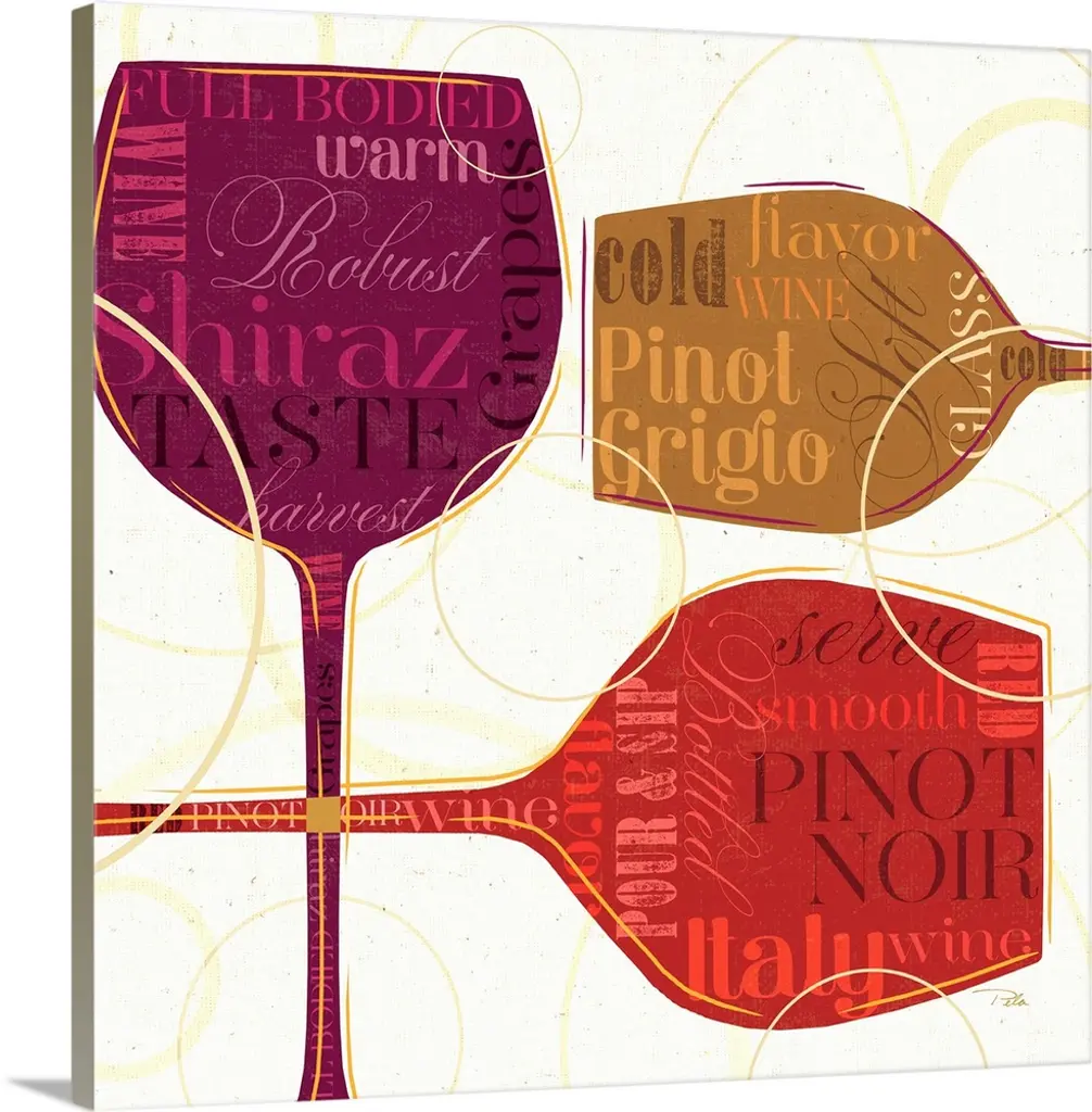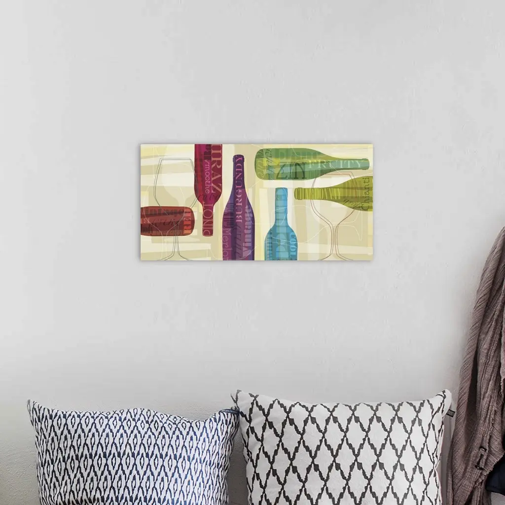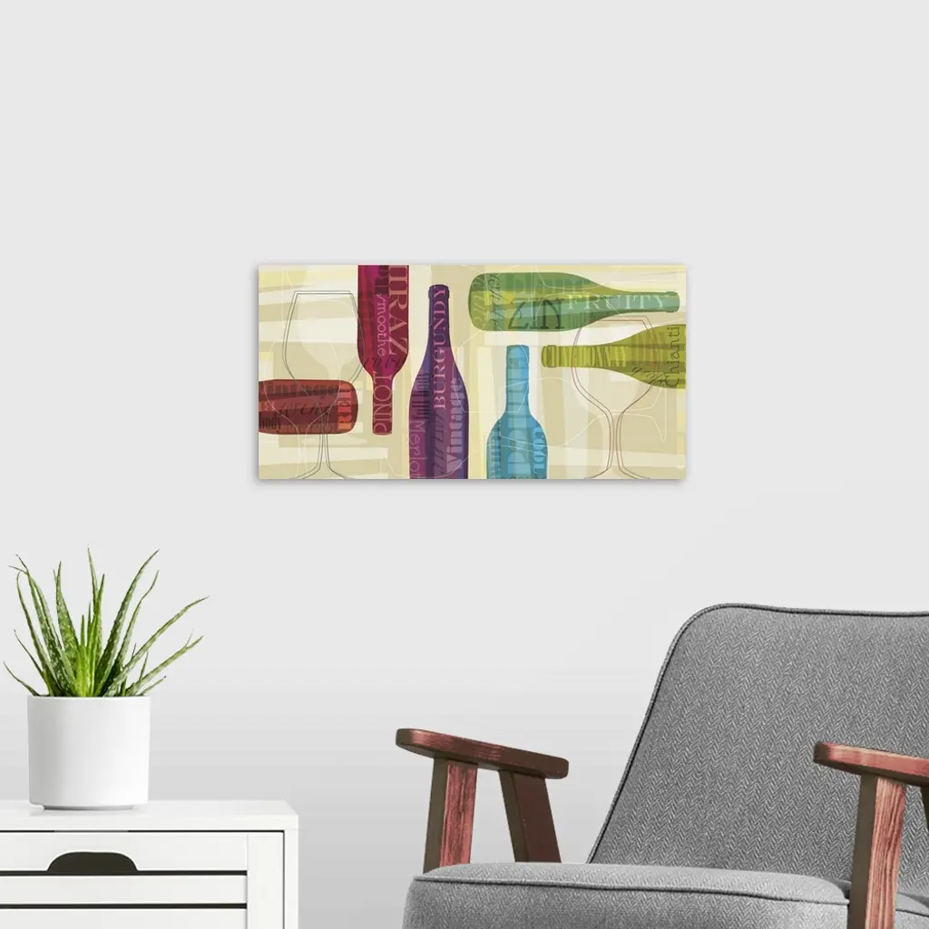 Horizontal artwork of multi-colored wine bottles with words associated with wine on them on a beige background with geometric shapes.