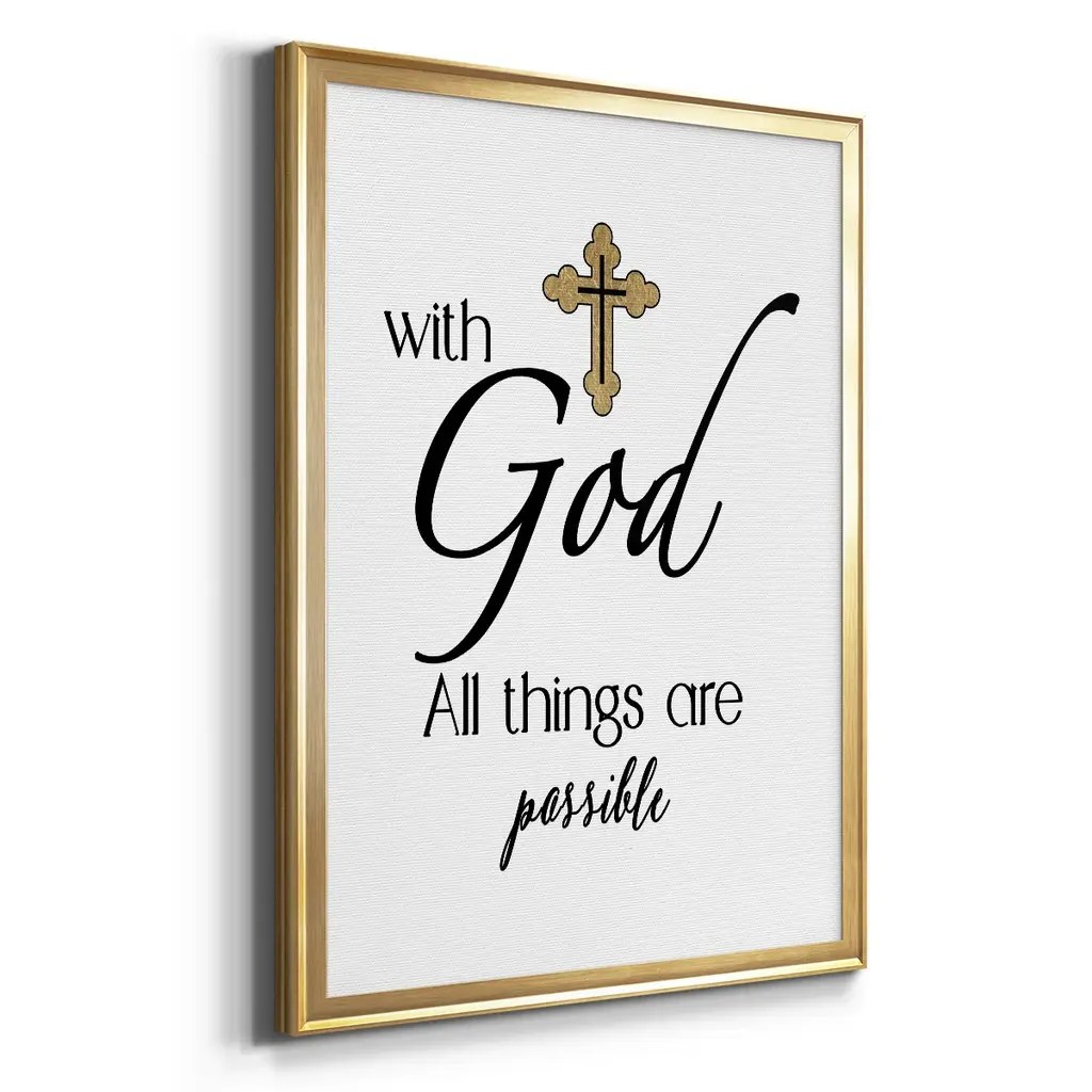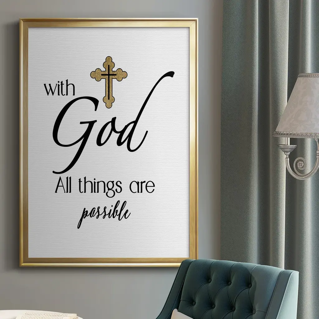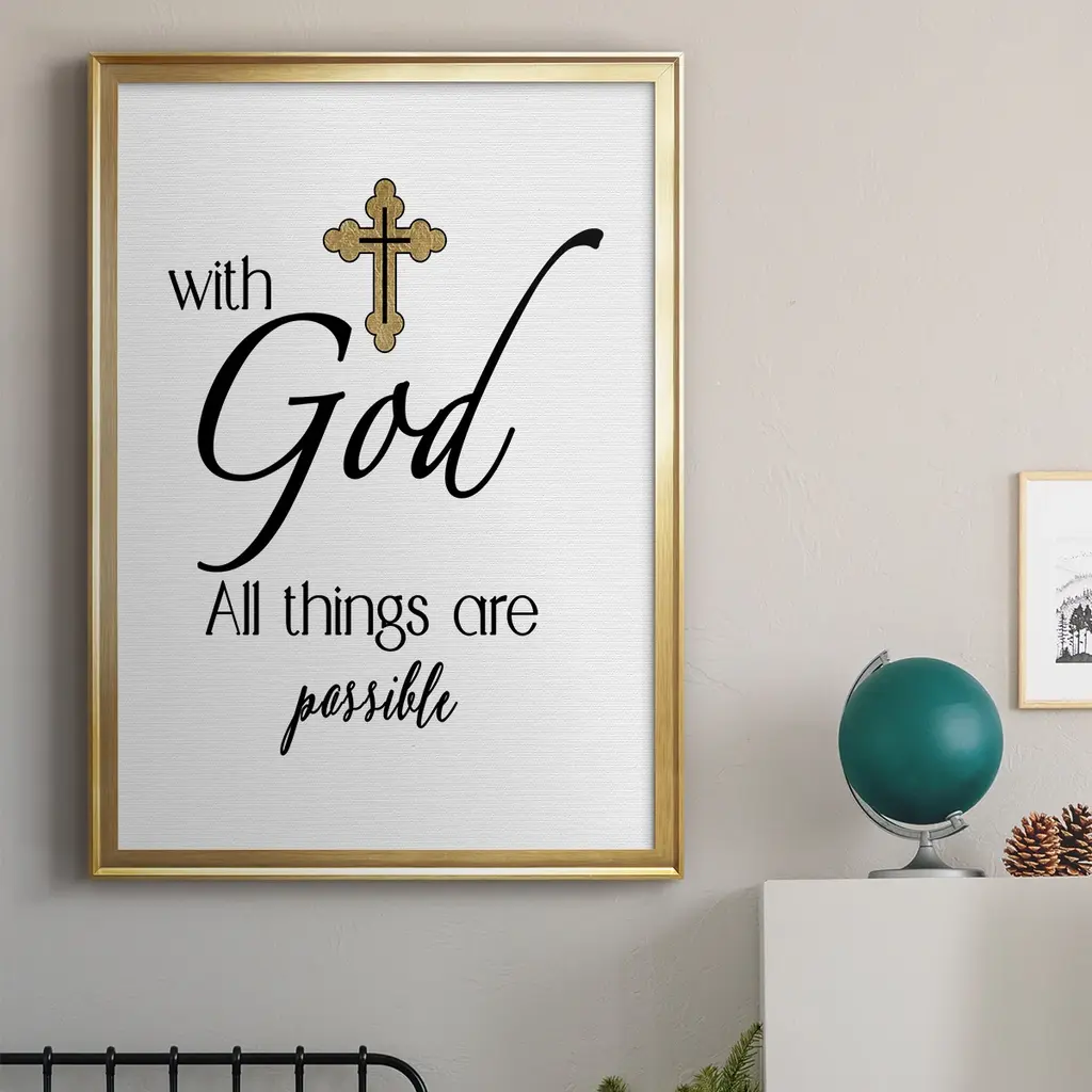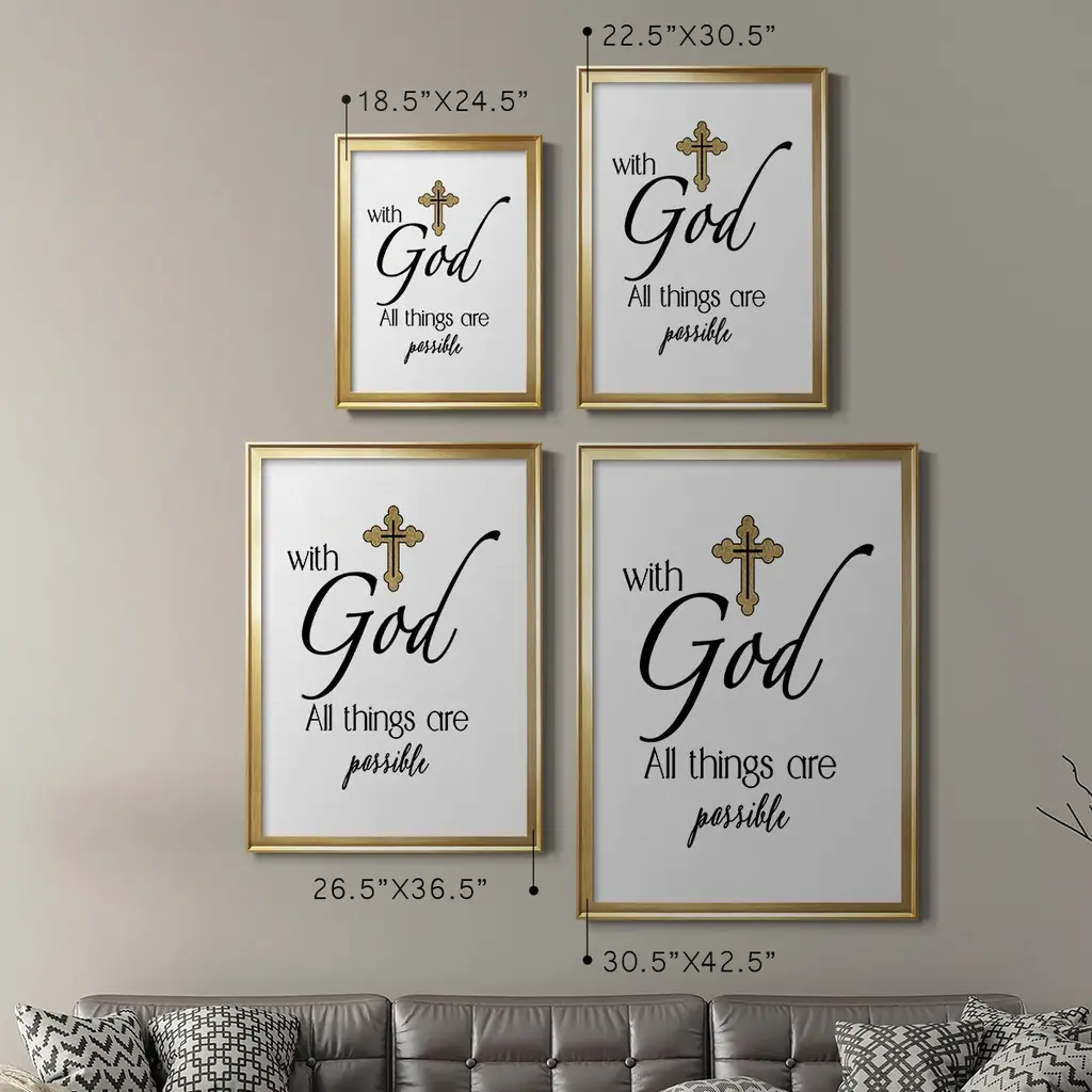 All Things Possible Gold Premium Framed Print - Ready to Hang A Premium Framed Print created to last. Framed in distressed wood and available in an array of sizes and colors Featuring a beveled a solid wood stretcher bar, each piece comes ready to hand 4 SIZES AVAILABLE 30.5''X42.5'' - Overall Size 26.5'X36.5'' - Overall Size 22.5''x30.5'' - Overall Size 18.5''x24.5'' - Overall Size Each piece is made to order. Each piece comes with hanging hardware. Made in the USA Ready to Hang