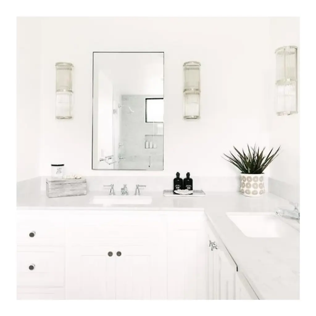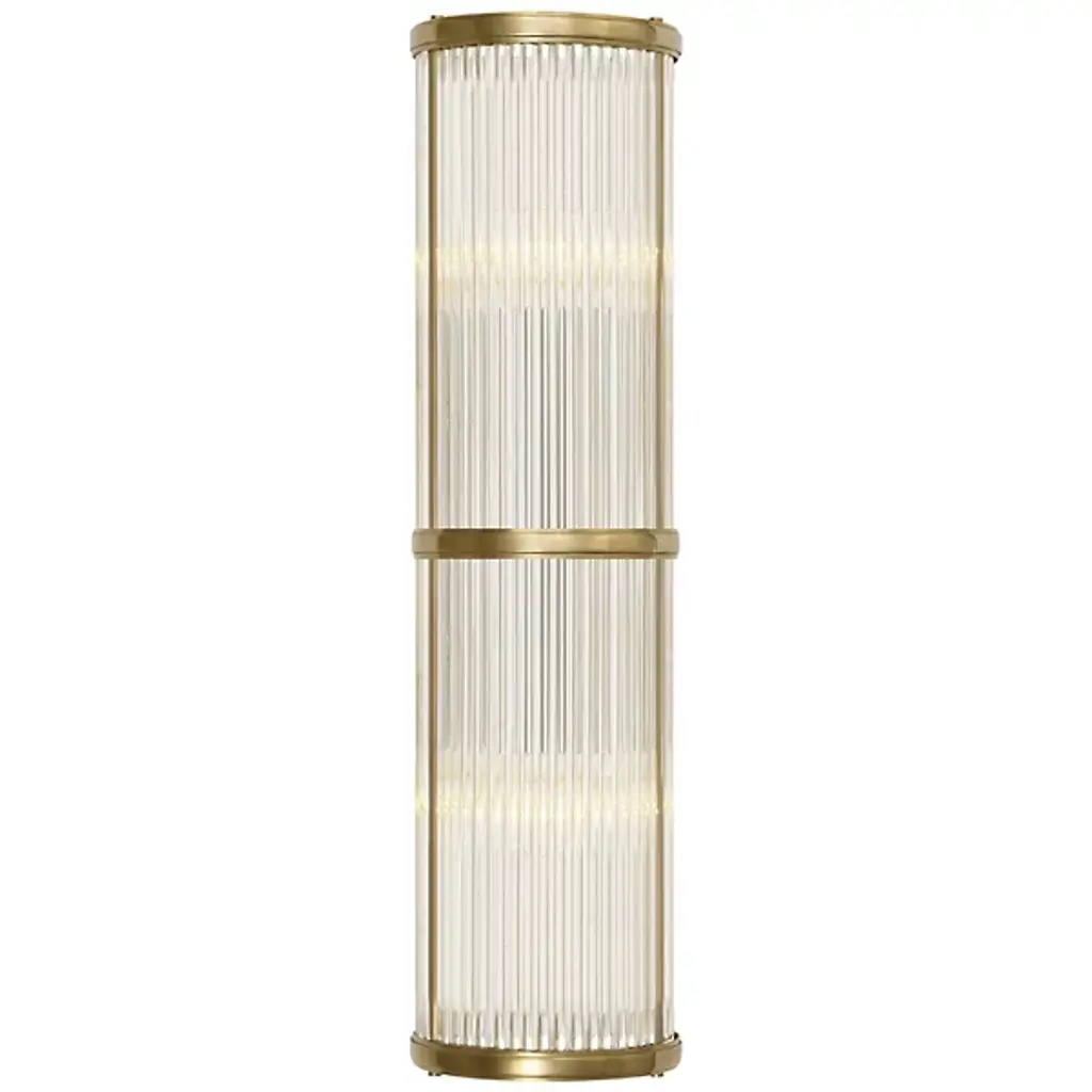 Elegantly balancing form and function, the Allen Vanity Light by Visual Comfort Signature, formerly known as Visual Comfort, brings practical illumination to a bath of vanity space while enhancing its aesthetic. Designed by Ralph Lauren, this cylindrical bath bar is composed of a series of clear glass rods running the length of its frame. Contrasting metal banding caps each end and adorns its center, lending smoothness to the textural glass shade. Incandescent bulbs deliver ample illumination through a warm glow.