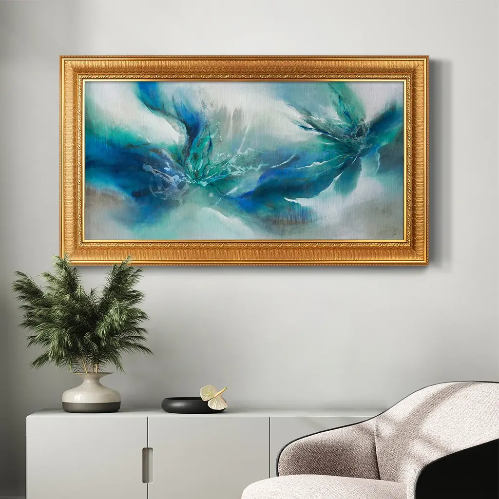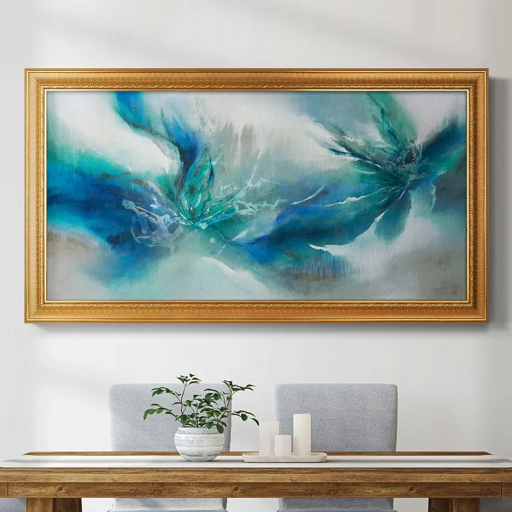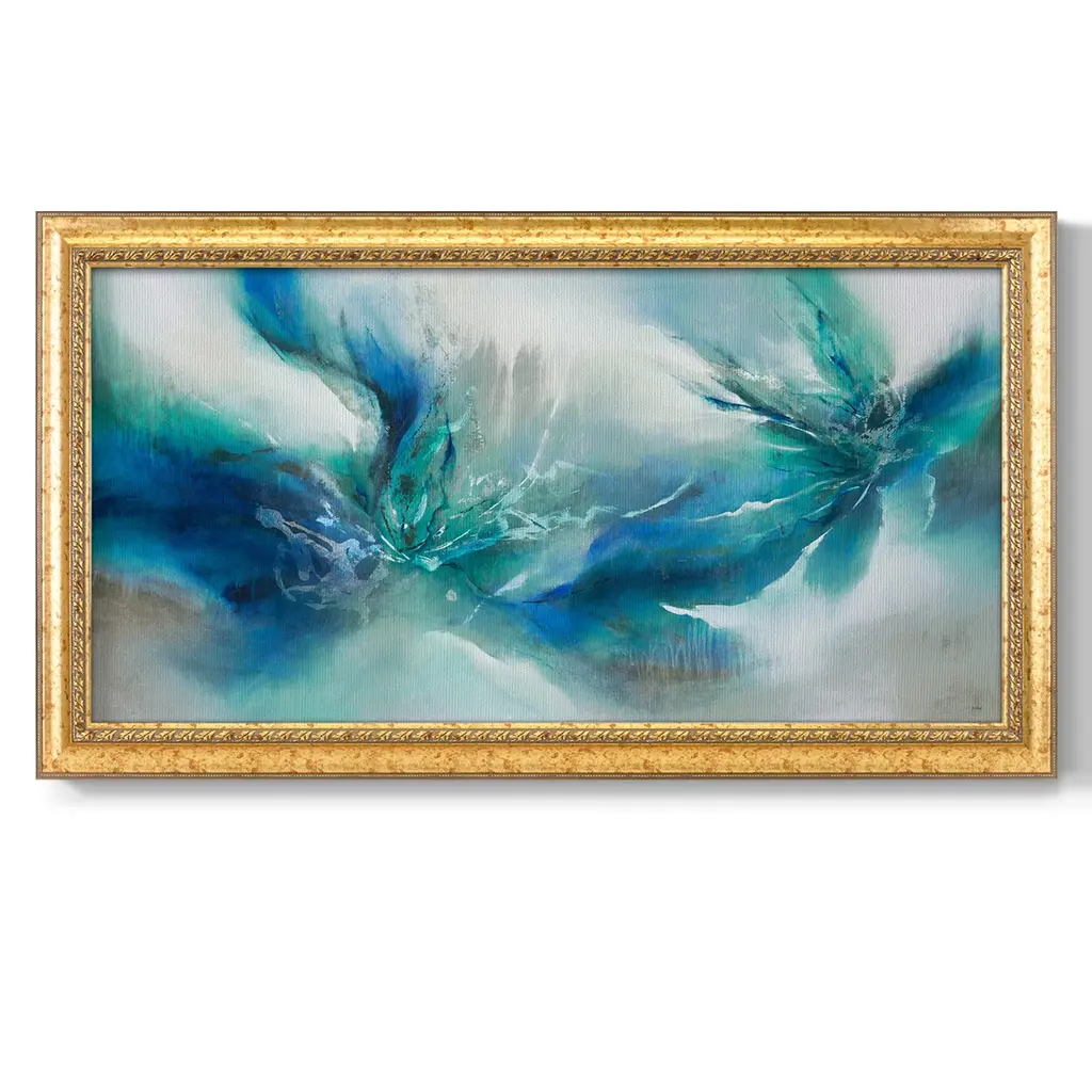 Allure Flickers II Premium Framed Canvas- Ready to Hang A Premium Framed Canvas created to last. Framed in distressed wood and available in an array of sizes and colors Featuring a beveled a solid wood stretcher bar, each piece comes ready to hand 3 SIZES AVAILABLE 21''X37'' - Overall Size 25''X45'' - Overall Size 29''x53'' - Overall Size Each piece is made to order. Each piece comes with hanging hardware. Made in the USA Ready to Hang Giclee Paper Print Acrylic Glass Beveled Matt Board