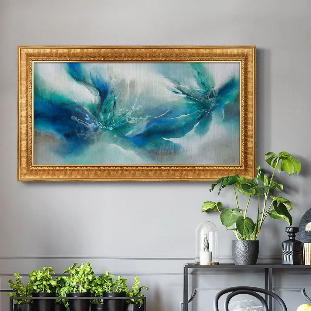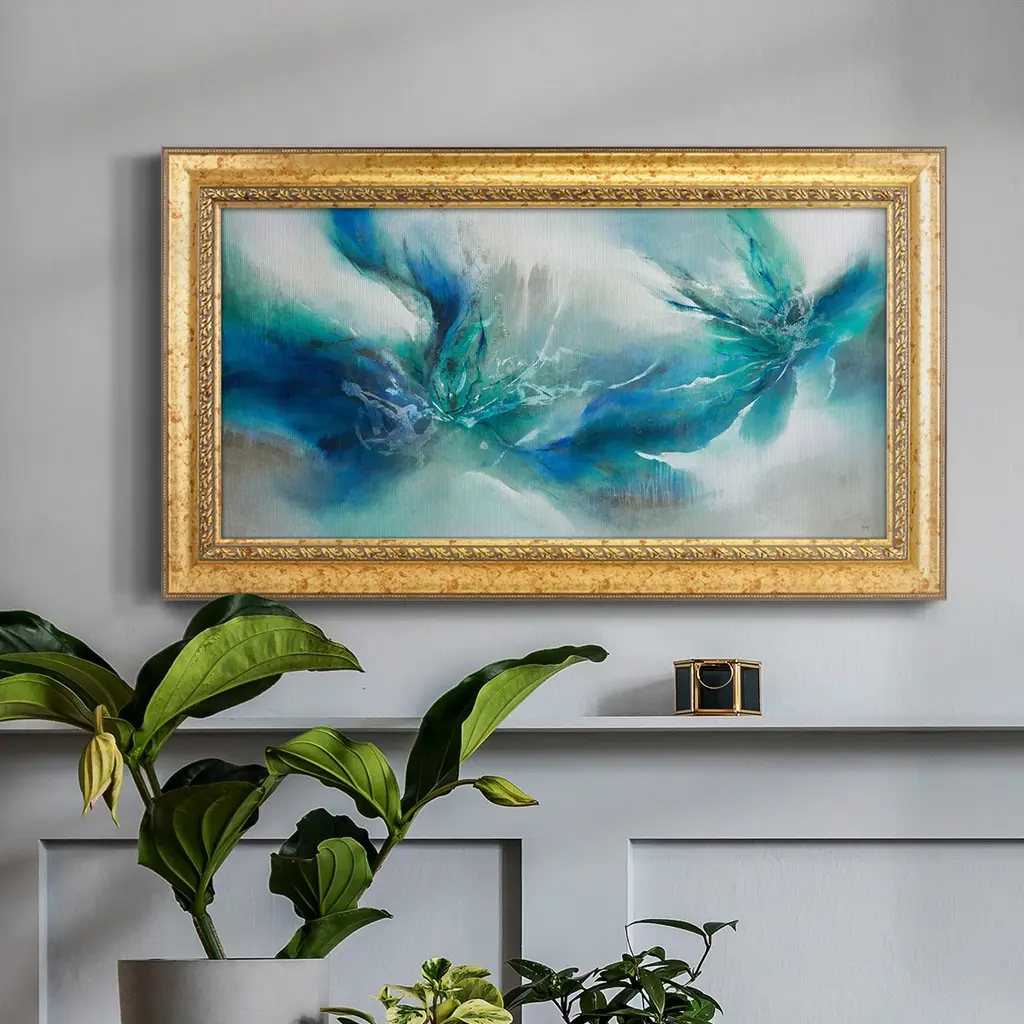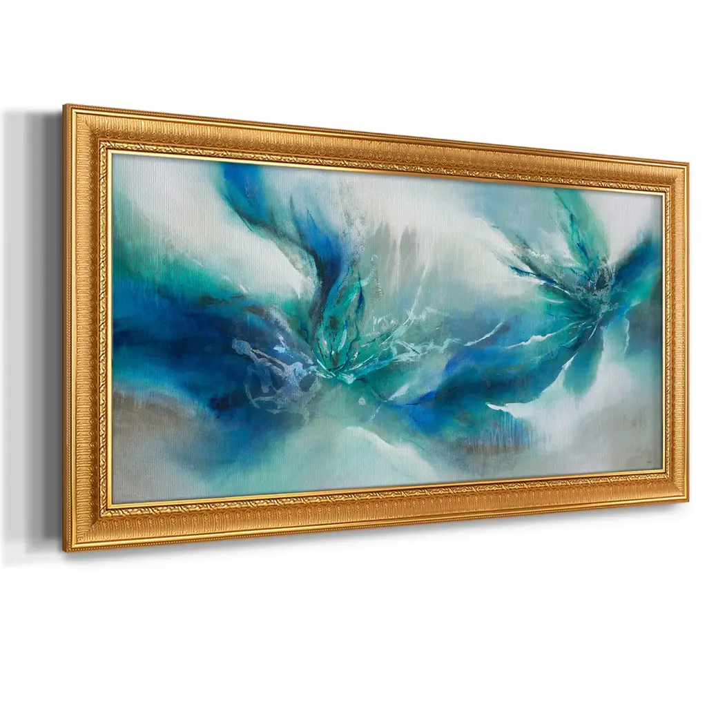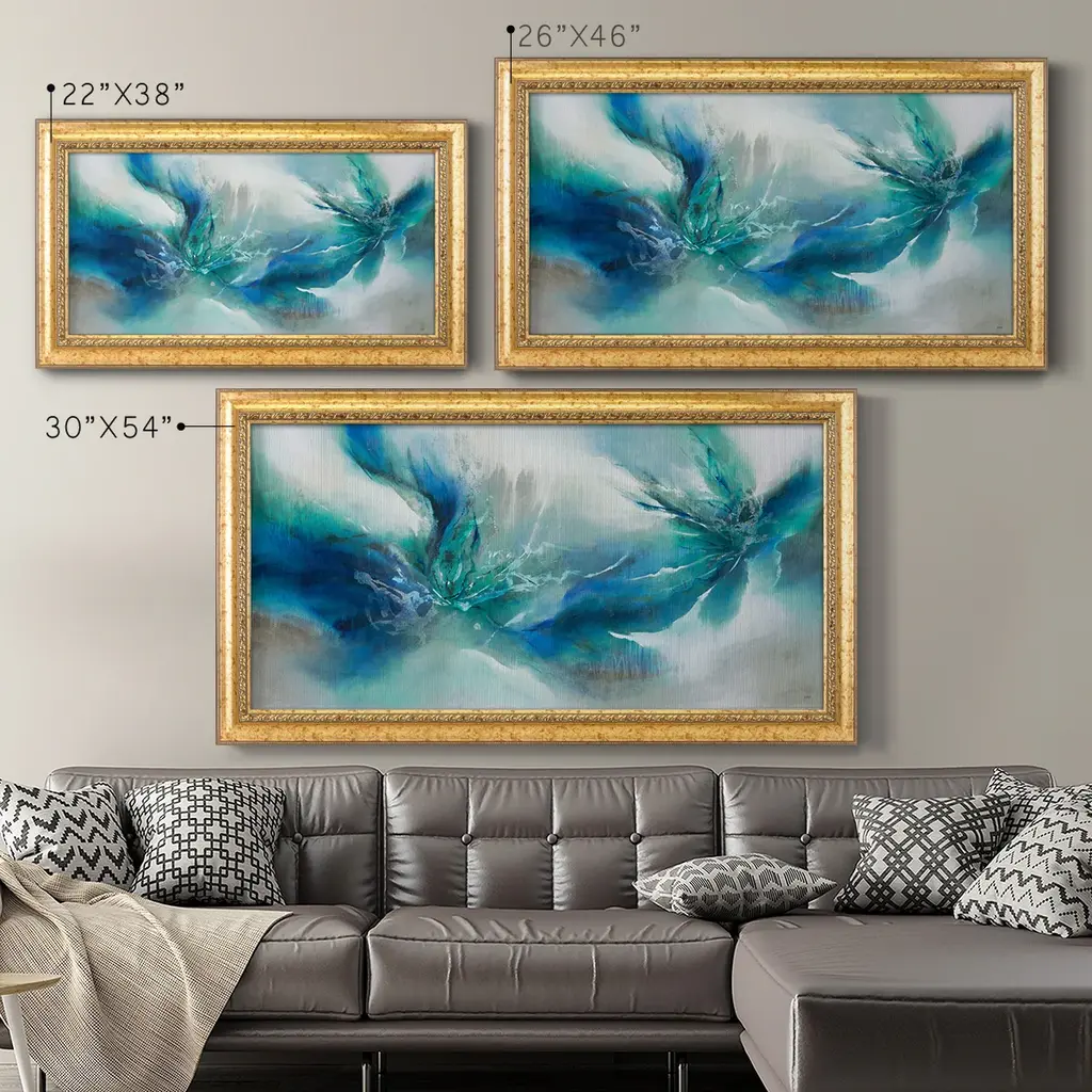 Allure Flickers II Premium Framed Canvas- Ready to Hang A Premium Framed Canvas created to last. Framed in distressed wood and available in an array of sizes and colors Featuring a beveled a solid wood stretcher bar, each piece comes ready to hand 3 SIZES AVAILABLE 21''X37'' - Overall Size 25''X45'' - Overall Size 29''x53'' - Overall Size Each piece is made to order. Each piece comes with hanging hardware. Made in the USA Ready to Hang Giclee Paper Print Acrylic Glass Beveled Matt Board