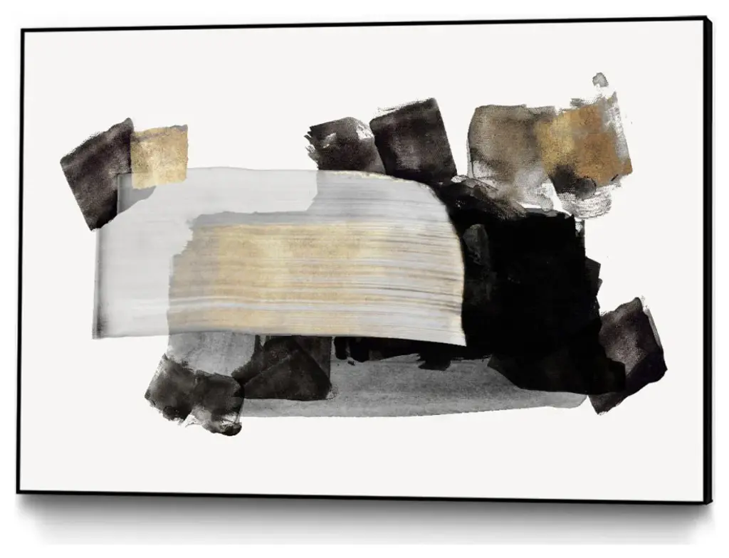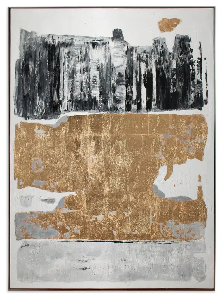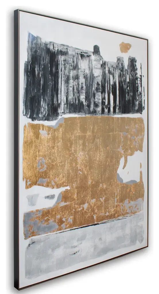 Make a statement with this over-sized color block abstract. Hand painted with heavy gold leafing adds an impressive luster to your spaceHand PaintedFrame Color: Black & SilverPS FrameHanging Hardware Included