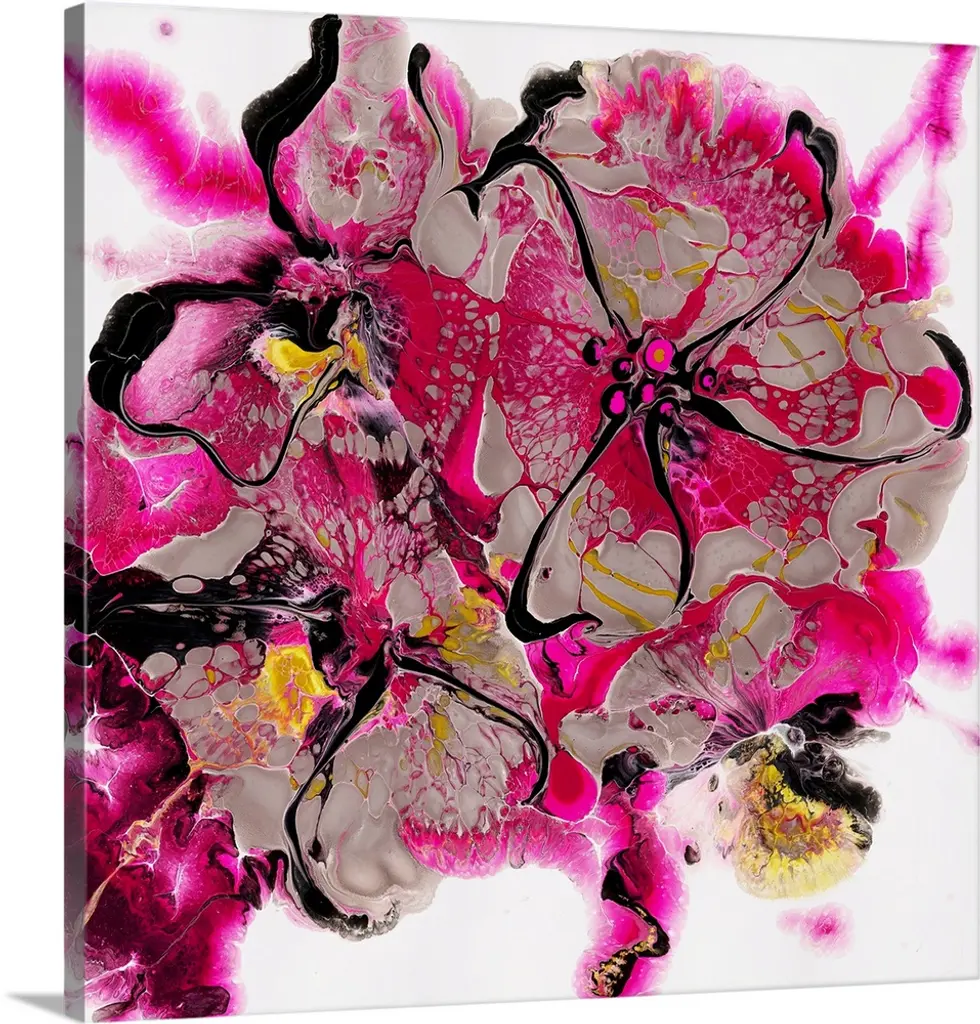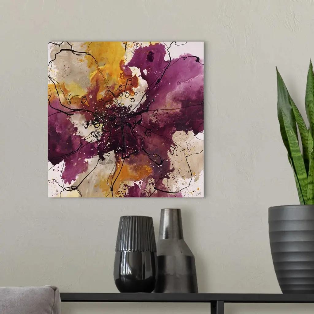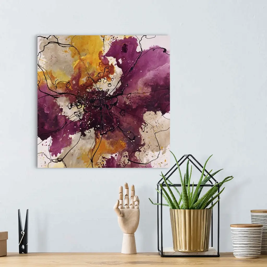 Abstract painting using bright purple and gold colors in radial splashes almost appearing ad flowers.