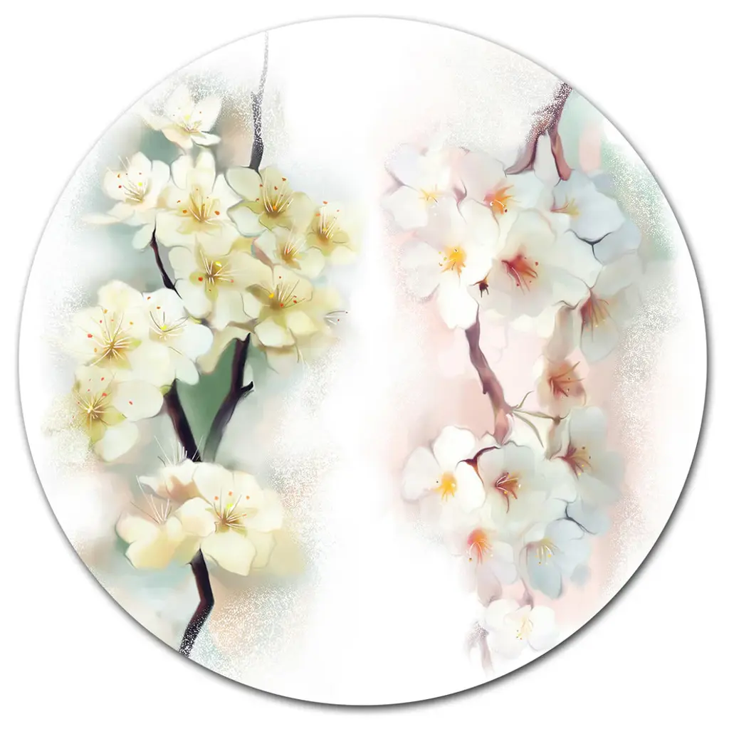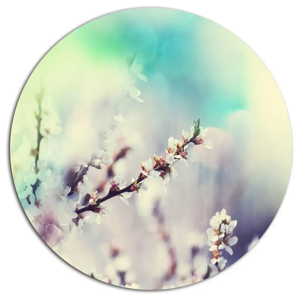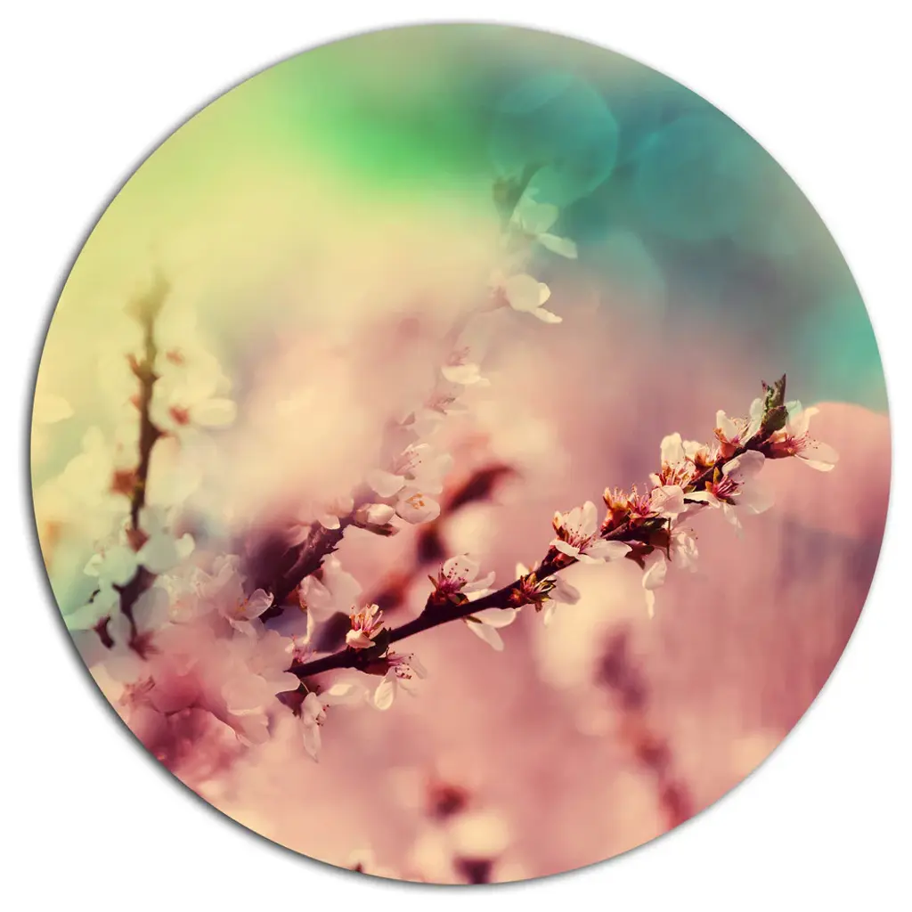 Bring Contemporary Abstraction to your home with this large Circle Metal wall art. This Almond Tree Pink Flowers Metal Artwork makes it the focal point of any room or office. - White Gloss Coating ensures colors are extra vibrant with light reflection.- Aluminum grade Sheet Metal with 1 inch mounting frame on the back giving the illusion that the artwork is floating on the wall..- Mounting Brackets are included along with instructions.- High Quality Digital images are created directly into a glossy aluminum panel producing a stunning and captivating print into the glossy finish of the metal.- Water, Fire and Scratch resistant HD Aluminum panels.- Looks better than any photo paper and guaranteed to last at least 20 years- Easy to clean with a microfiber cloth. Colors are far superior to regular Canvas Art. - Easy to Hang