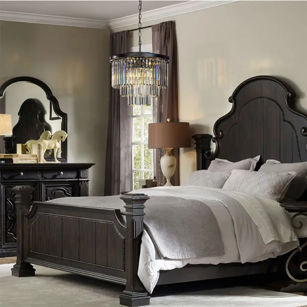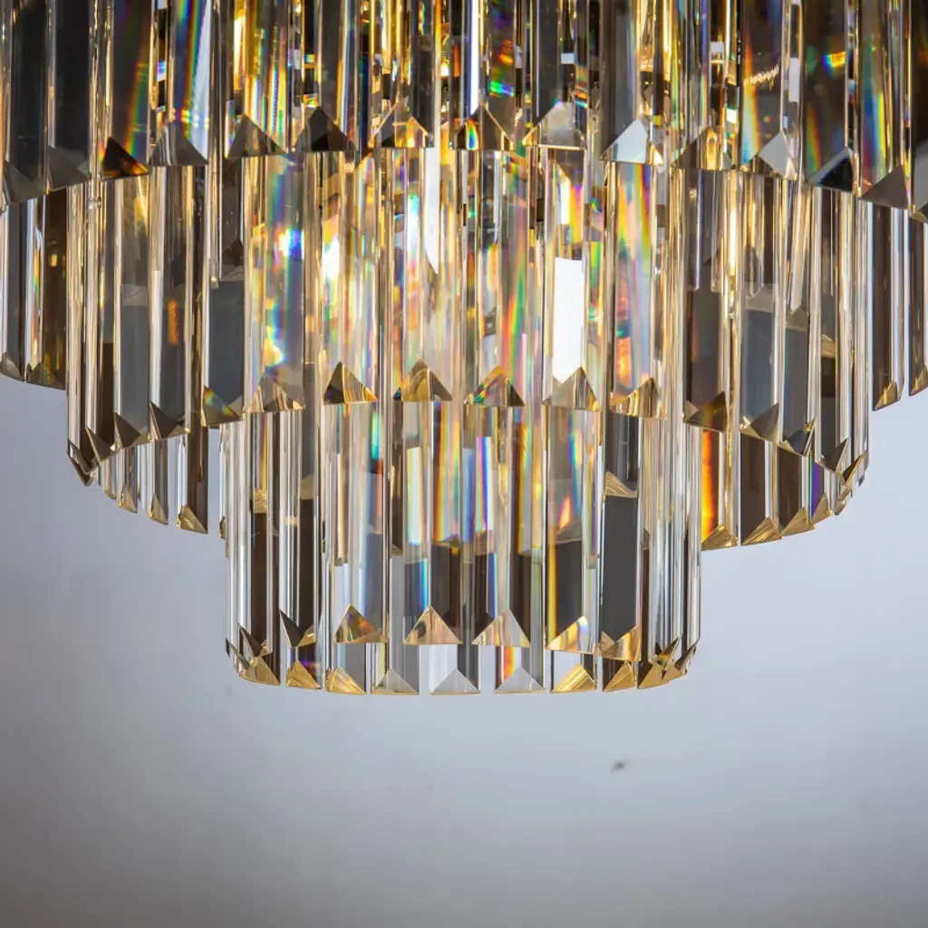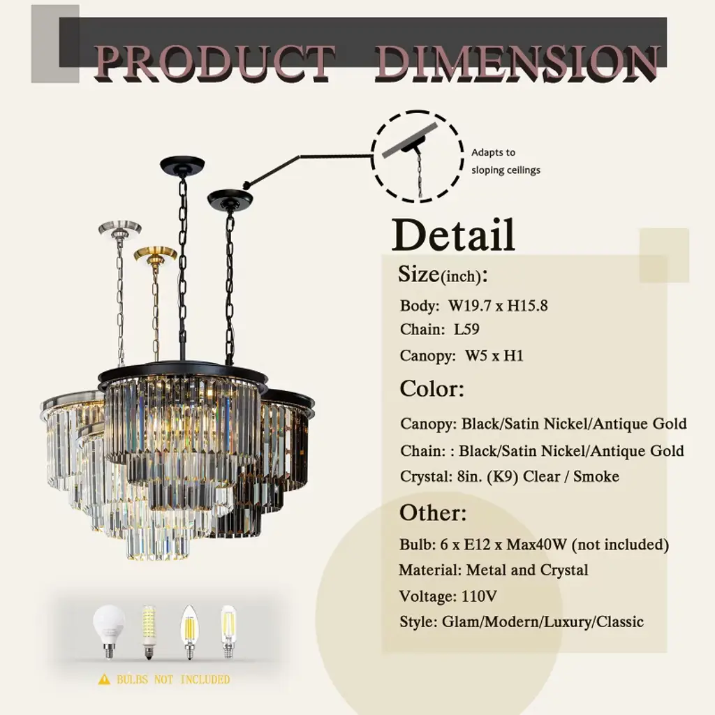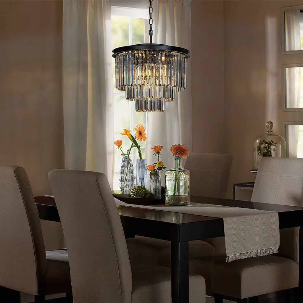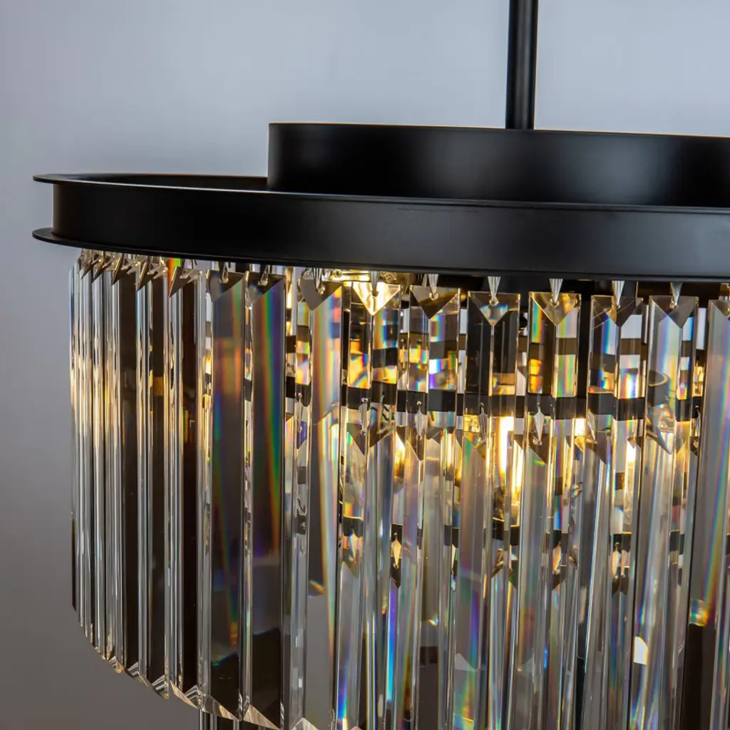 Contemporary crystal chandeliers features the classic matte black metal frame with premium painting process and 111 pieces of crystal prism form 3 layers of chic cake shape as crystal shade, masterfully refracting the light, dynamic prisms evoke the allure of the era. Nothing is quite as stunning as the fine crystal chandeliers that gave sparkle to brilliant evenings when you open the light. You could use in any suitable space like hallway, kitchen, living room, dining room, entryway bar, corridor and hotel.
