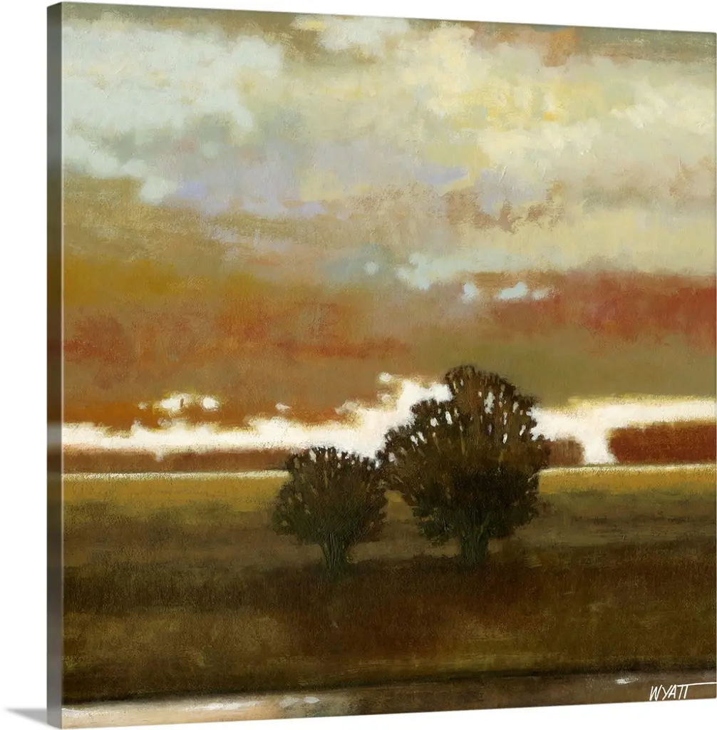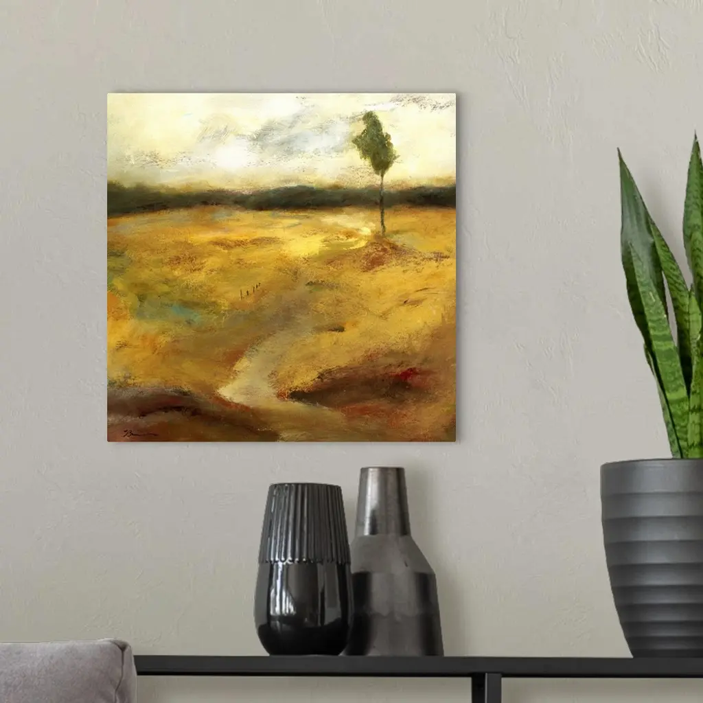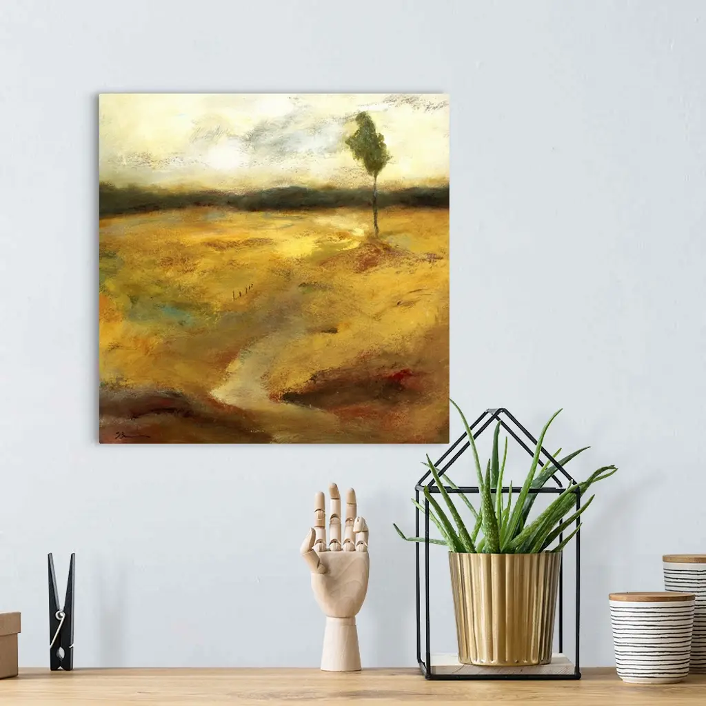 Contemporary painting of a golden earthy toned landscape with a small lone tree in the distance.