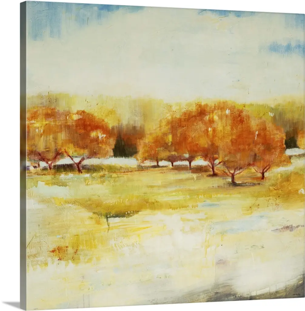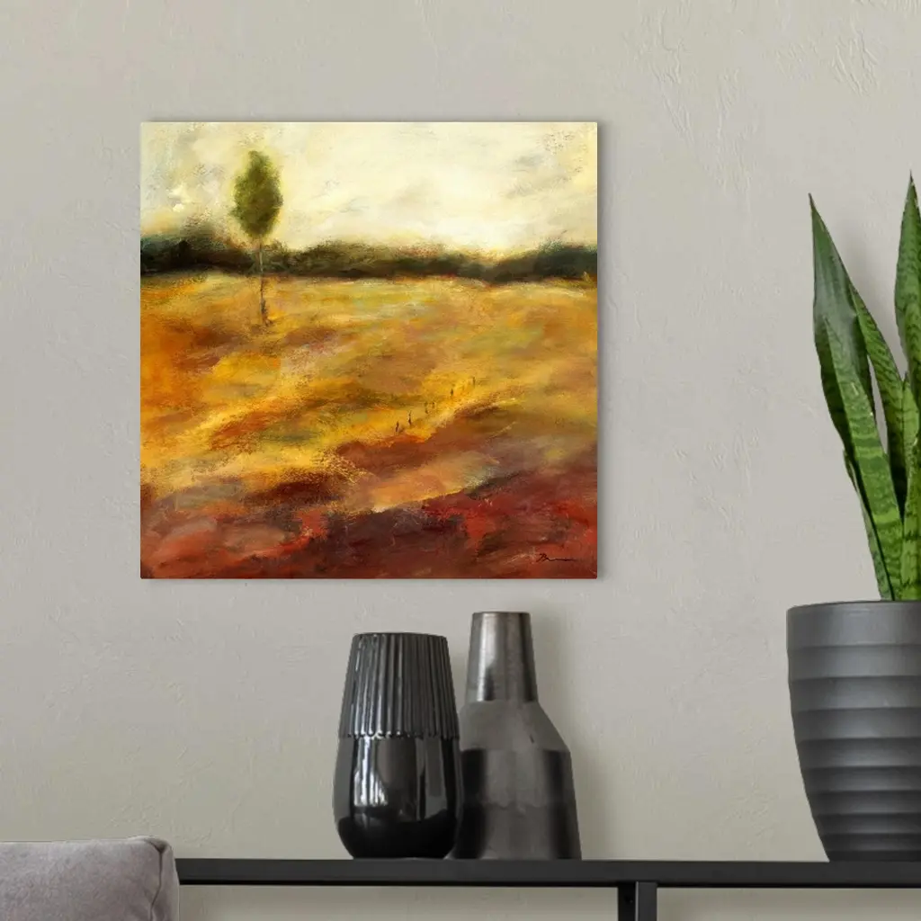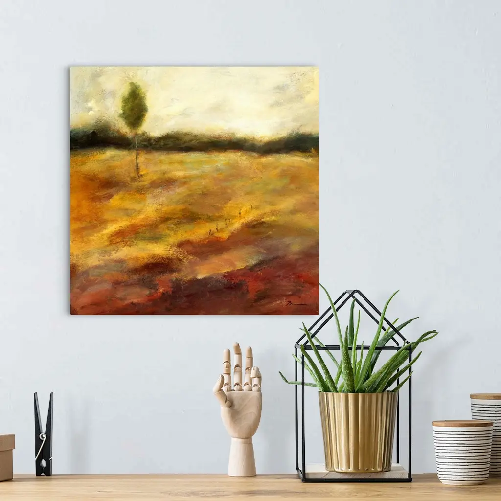 Contemporary painting of a golden earthy toned landscape with a small lone tree in the distance.
