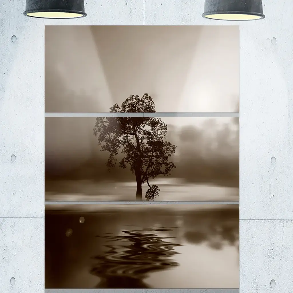 "Alone Tree On Island In Sepia" Metal Landscape, 3 Panels, 28"x36"