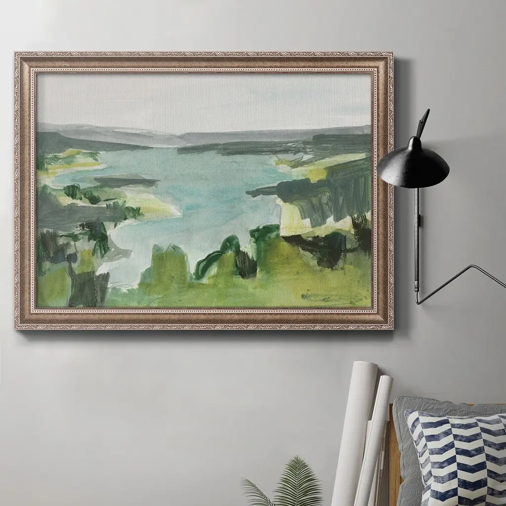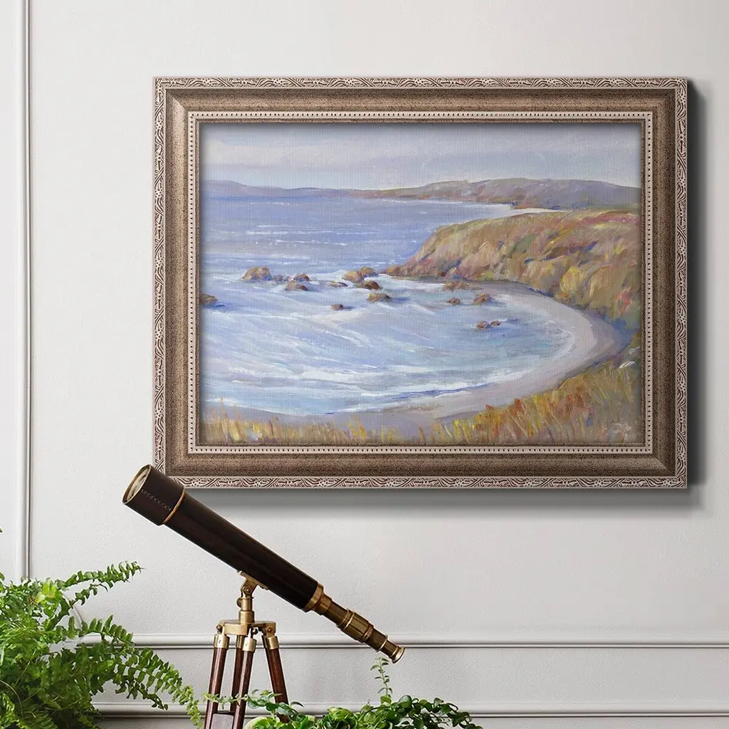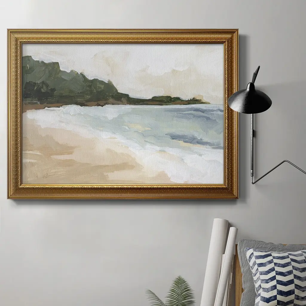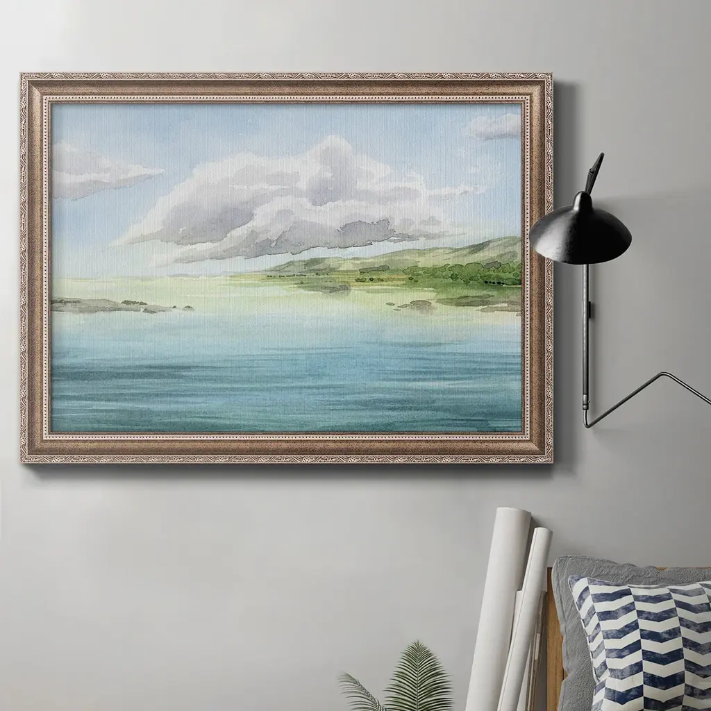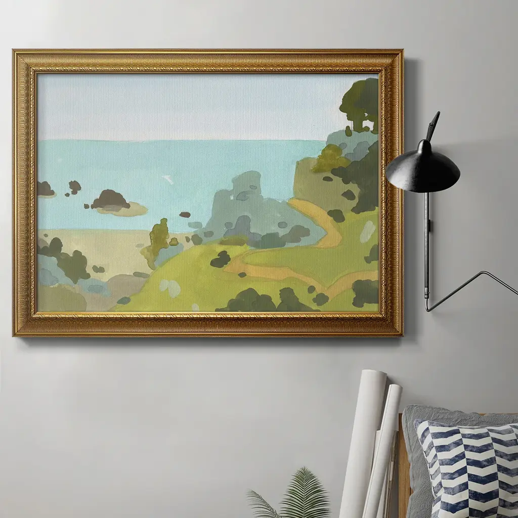 Along the Coast II Premium Framed Canvas- Ready to Hang A Premium Framed Canvas created to last. Framed in distressed wood and available in an array of sizes and colors Featuring a beveled a solid wood stretcher bar, each piece comes ready to hand 3 SIZES AVAILABLE 16''X20'' - Overall Size 18'X27'' - Overall Size 24''x36'' - Overall Size Each piece is made to order. Each piece comes with hanging hardware. Made in the USA Ready to Hang Giclee Paper Print Acrylic Glass Beveled Matt Board
