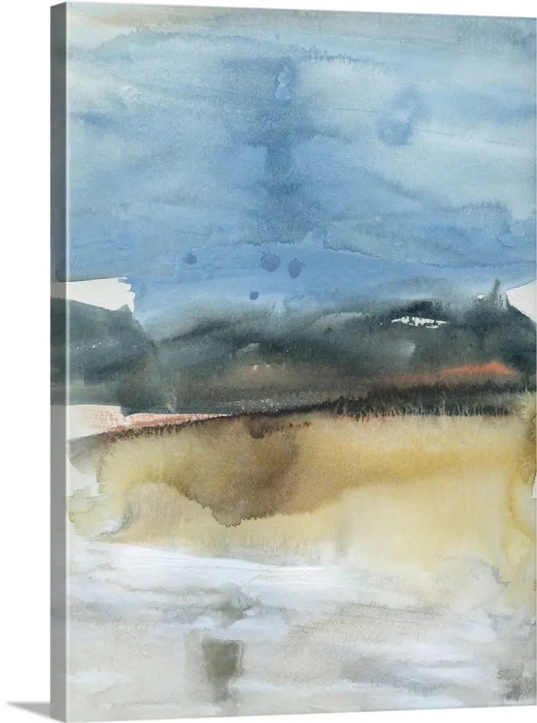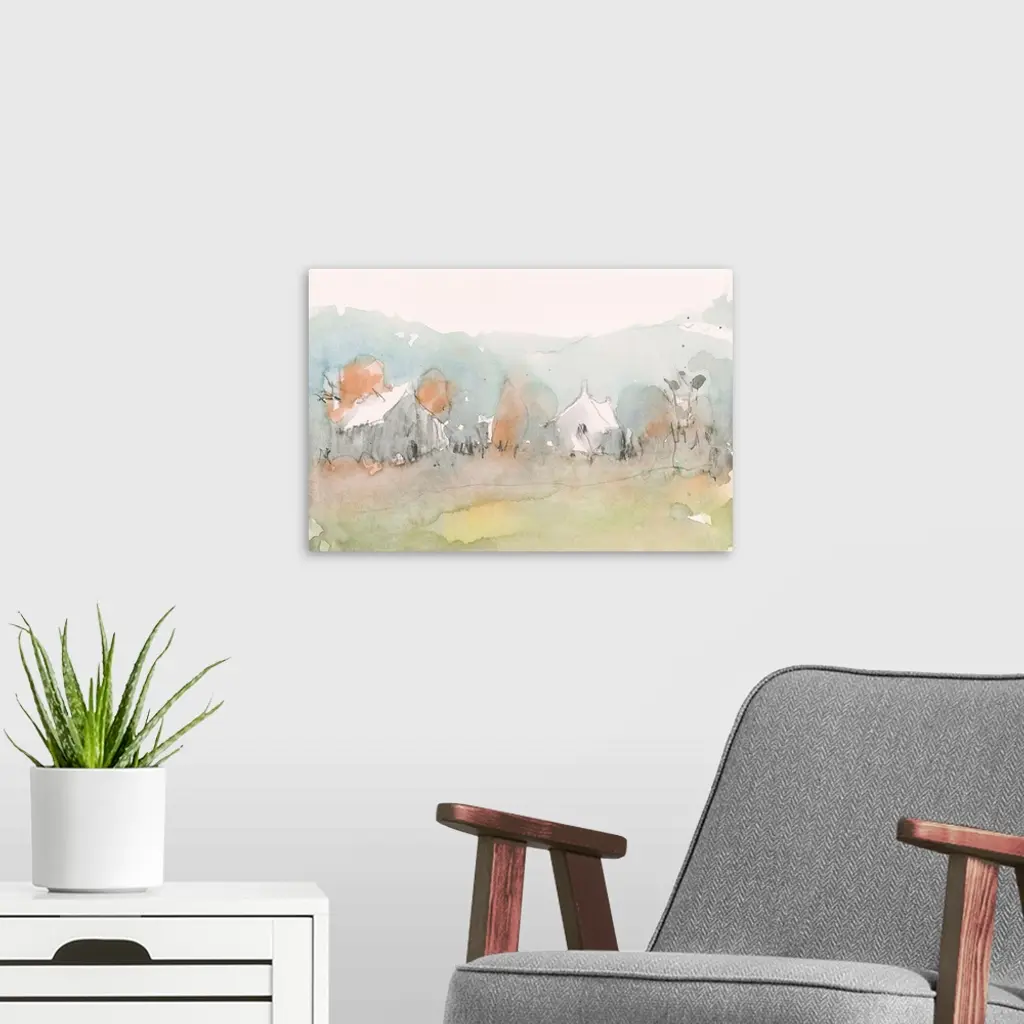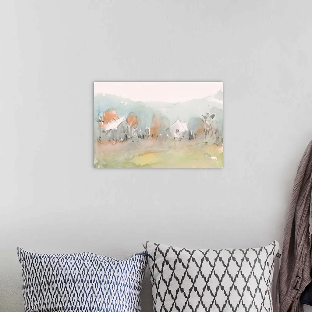 An abstracted watercolor painting of farm buildings with trees and foliage in the foreground