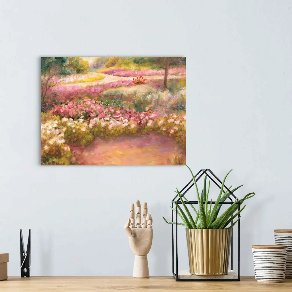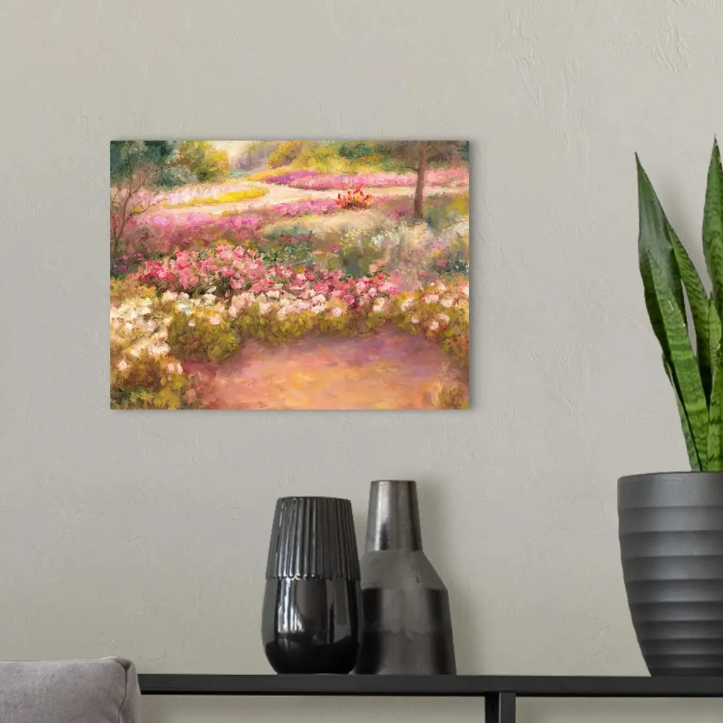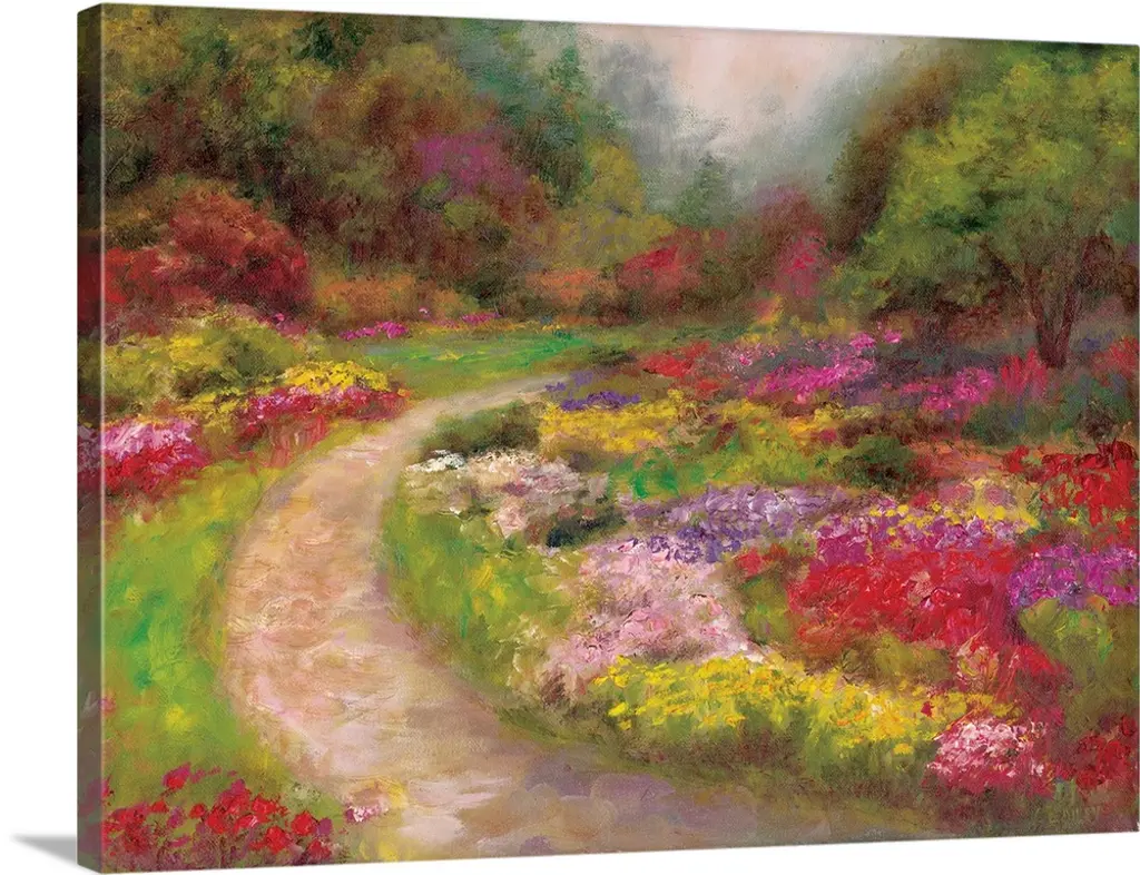Contemporary artwork of a path in a garden surrounded by flowers.