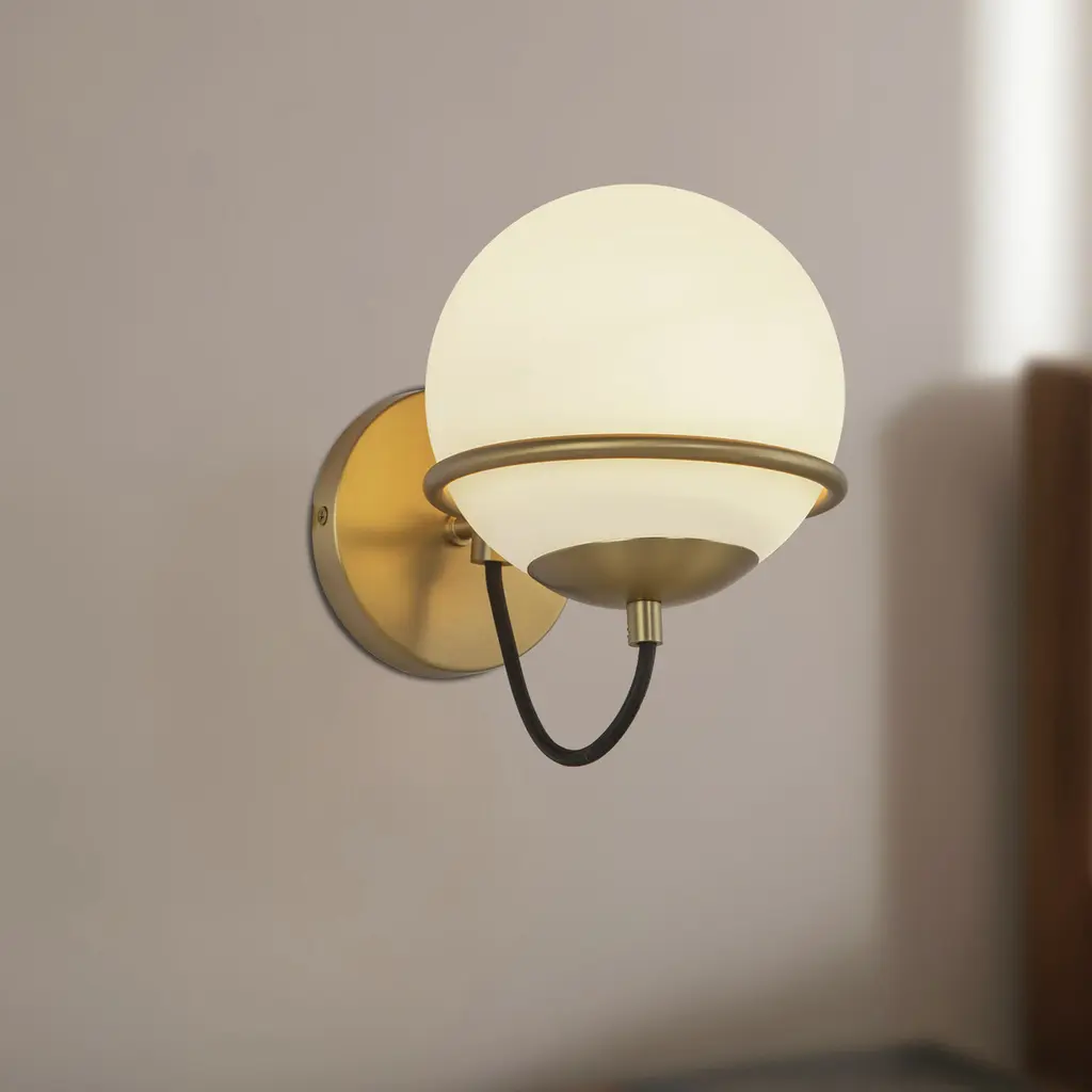 Alba is a mystical mix of Italian modern and 50's whimsy. With seemingly floating orbs of Matte Opal Glass dancing around a minimal frame, this collection seems to float effortlessly through any space. Featuring a stunning mix of Matte Black and Aged Gold details.
