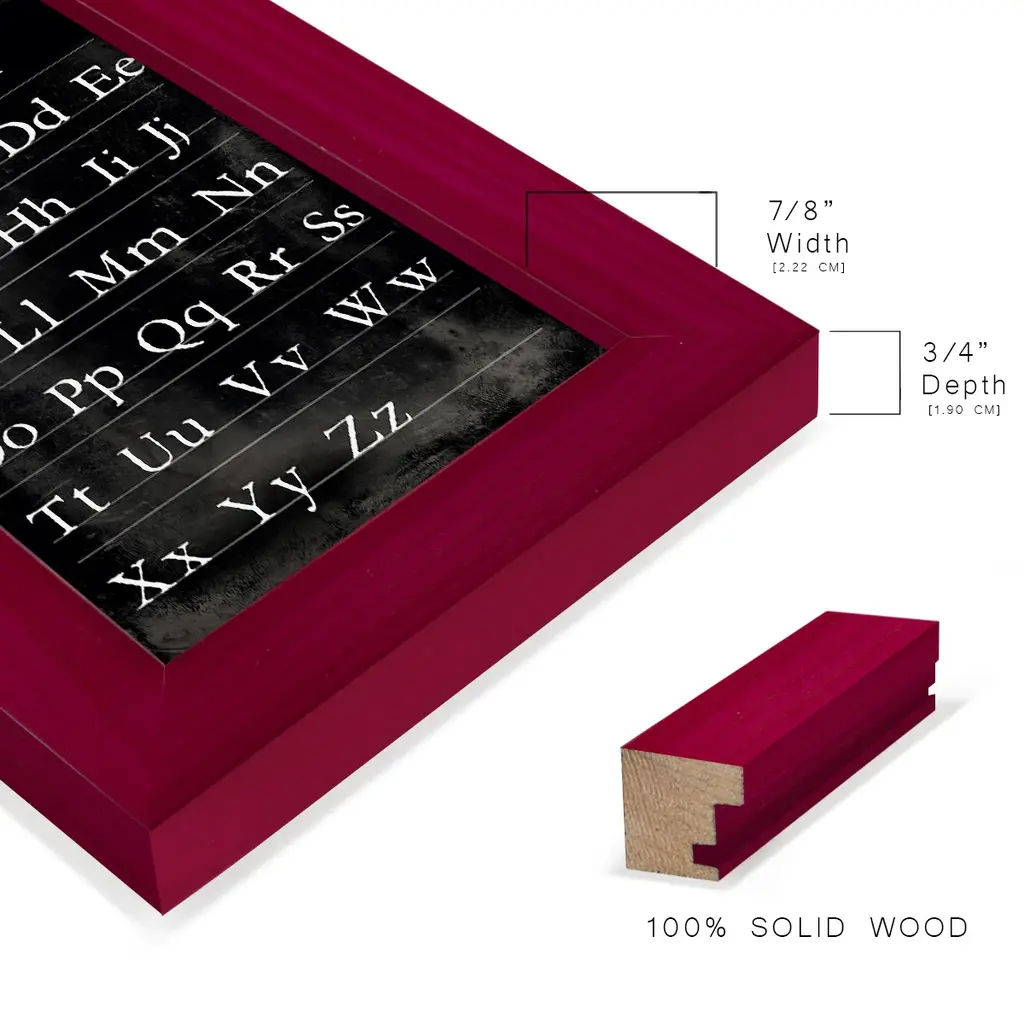 Alphabet Chart -EZ SWITCH Framed Print w/glass-Cherry Red A delightful, framed print. Featuring a solid wood frame with real wood glass. This premium print is giclee quality. In addition, every frame features a removable back and table top stand. This allows you to change your art in the future or to just stand the art on a table for a new look. We are sure you'll enjoy our new series of EZ SWITCH Framed Art. Solid Wood Frame Real Glass Removable / Replaceable Art Built in Tabletop Stand Sizes range from 4x6 up to 12x15 - buy just one or pair them up as sets as you see fit.