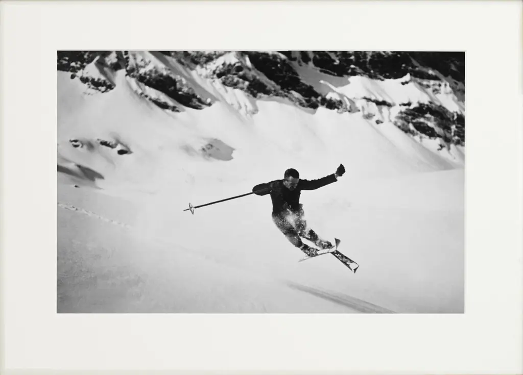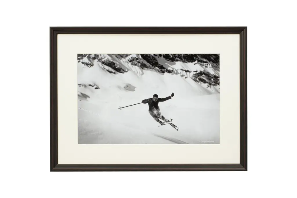 Alpine Ski photograph.'QUERSPRUNG', a new mounted black and white photographic image after an original 1930s skiing photograph. Prior to being a recreational activity skiing was purely a means of travelling from A to B through the snow, it only started to become the sport it is today in the mid-1800s. Quersprung is a manoeuvre for avoiding obstacles in skiing executed by turning at right angles in the air.The price displayed is for the mounted photo only.Image size 25.5cm x 40cm = 15 ½" X 10".The alpine photograph is also available in a wooden frame at £ 185. Images of the frame are shown.