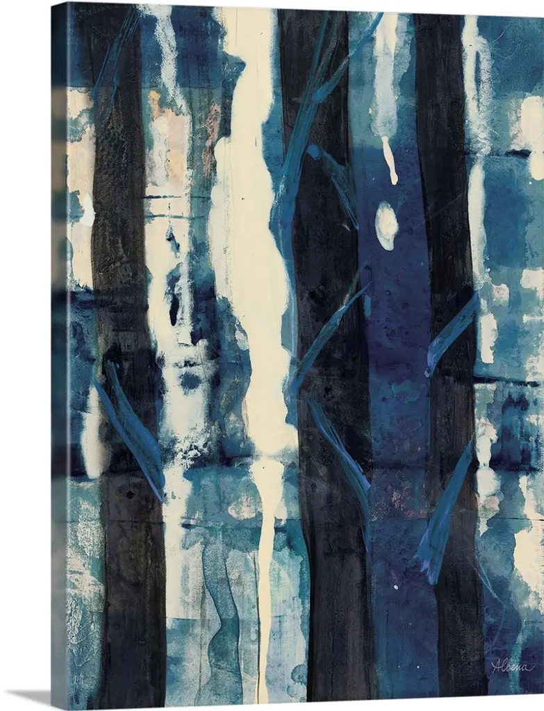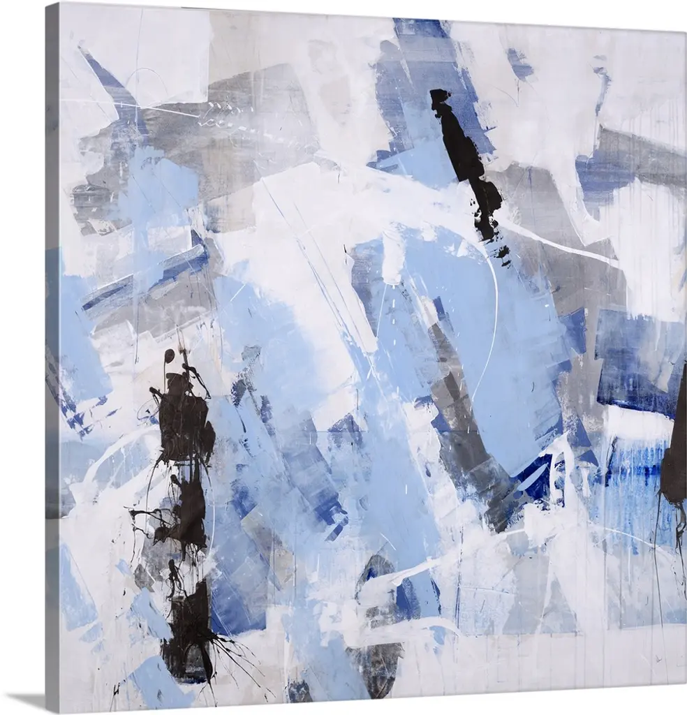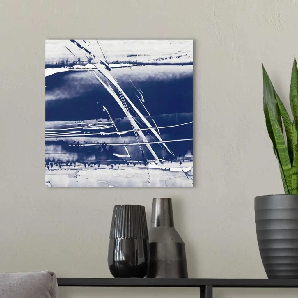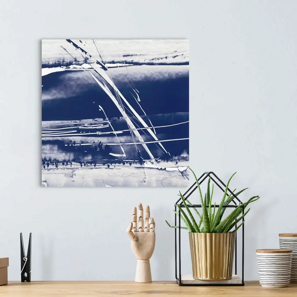 Square abstract painting in blue and white with lines scratched across.