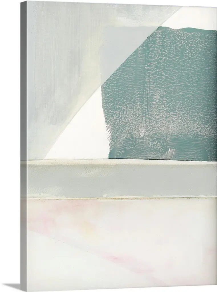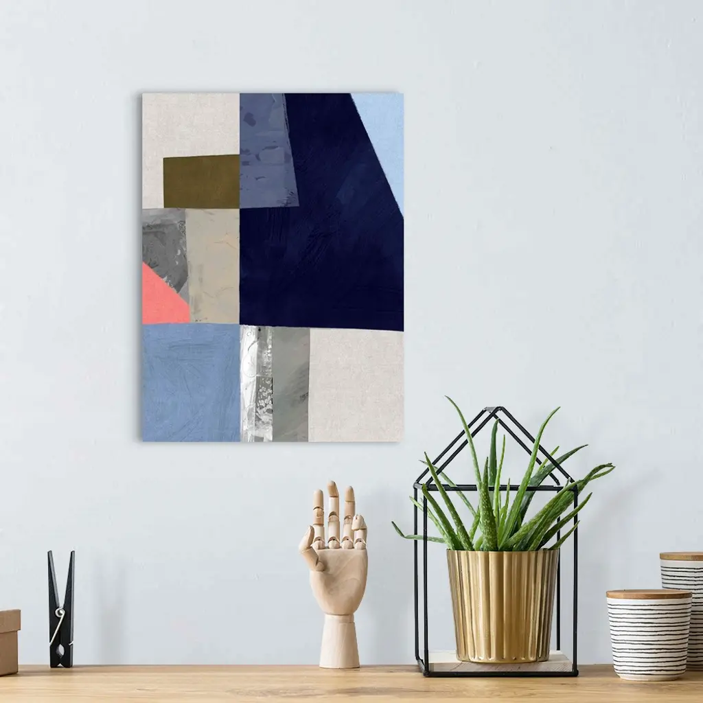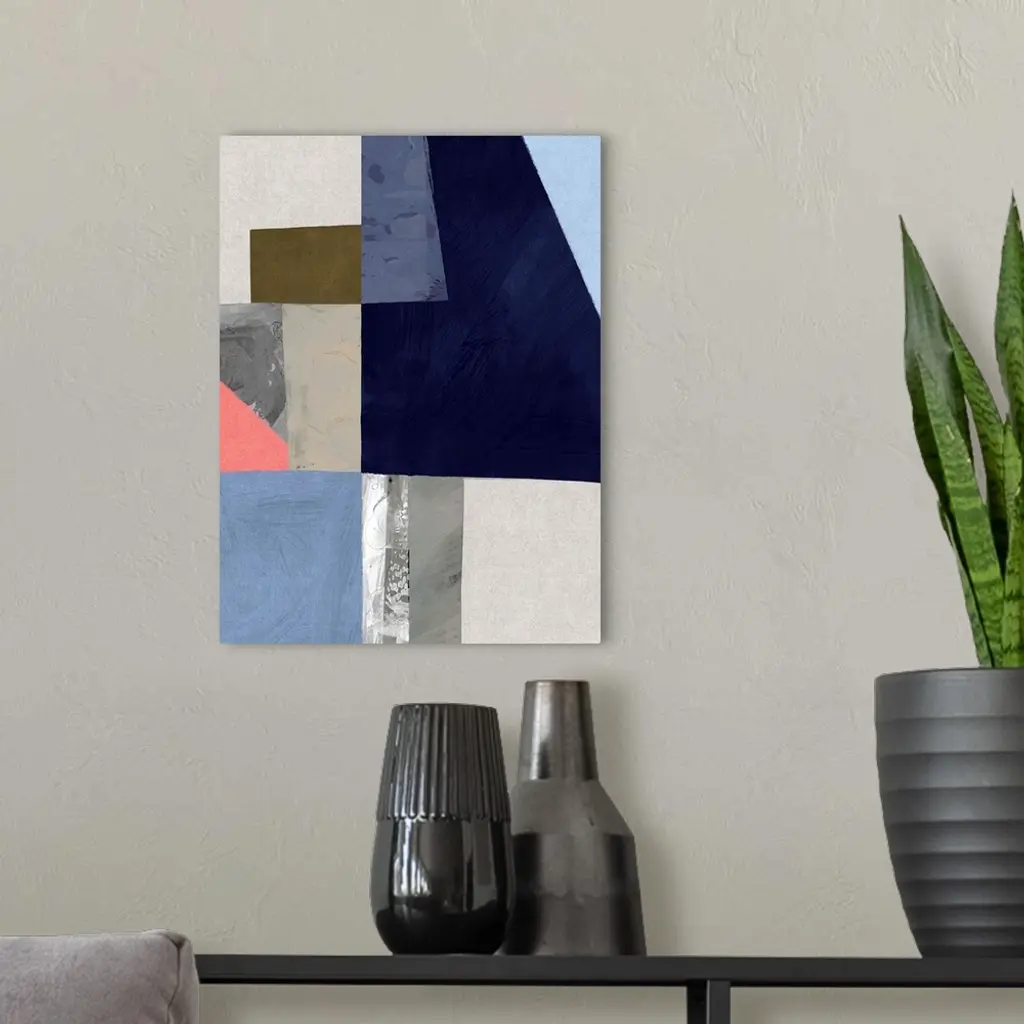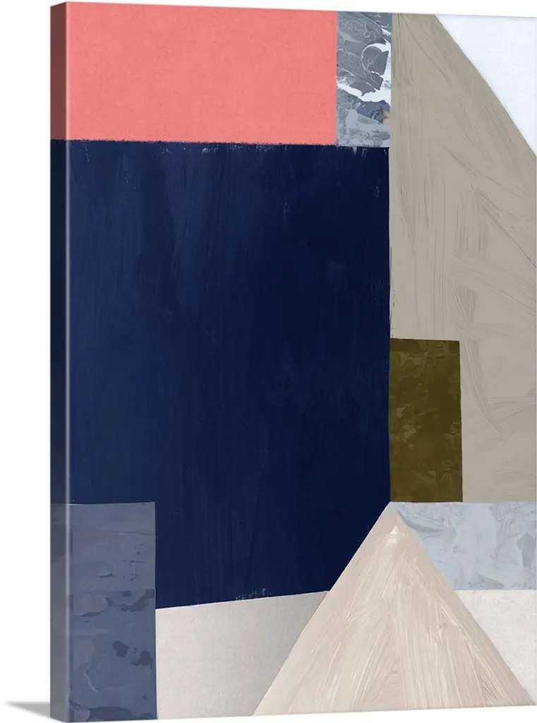 Color block abstract artwork with shades of navy blue and coral pink.