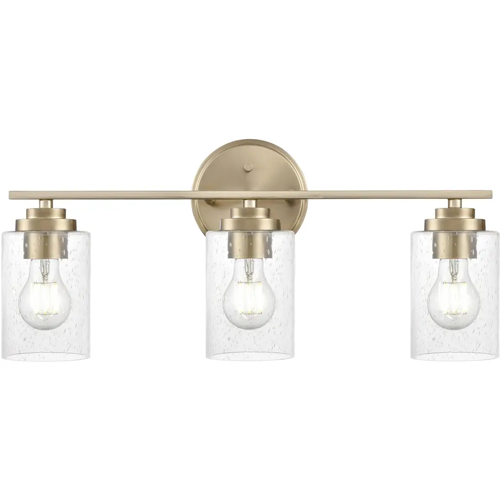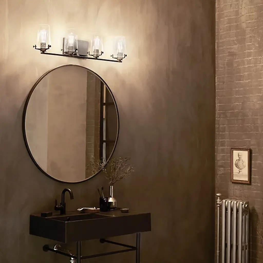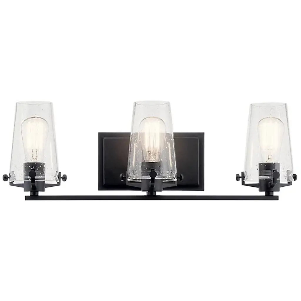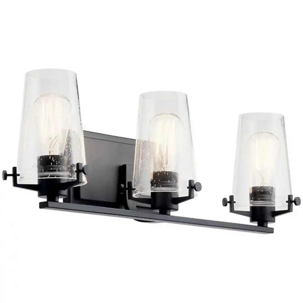 The Kichler Alton Vanity Light has a sophisticated presence that still exudes a modern aesthetic. A long thin rod supports clear glass shades, each hosting their own bulb. The seeded glass takes on a unique texture when the fixture is lit, the air bubbles adding a small dose of complexity to this simple fixture. The exposed hardware adds the final detail, completing the piece with a subtle industrial flair.