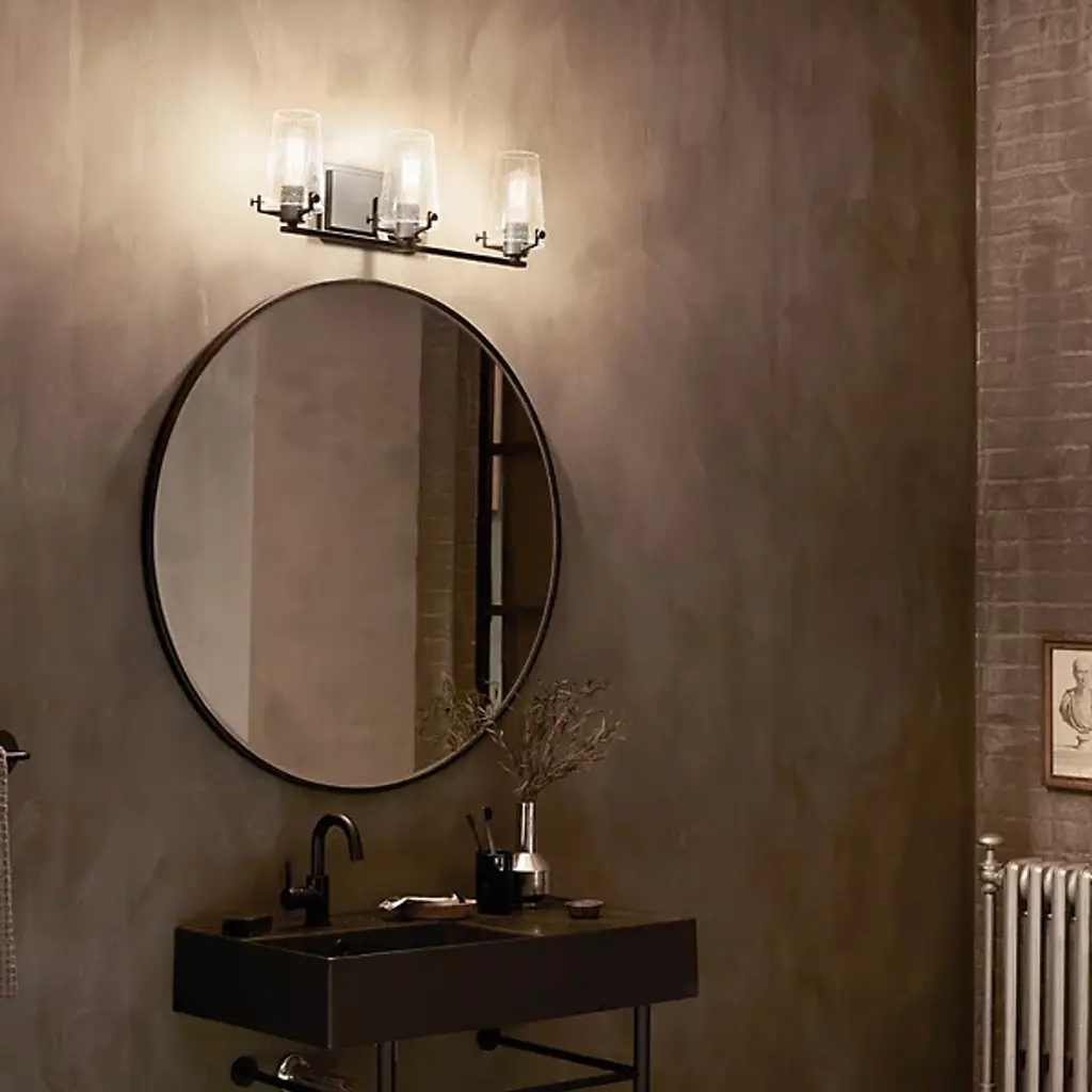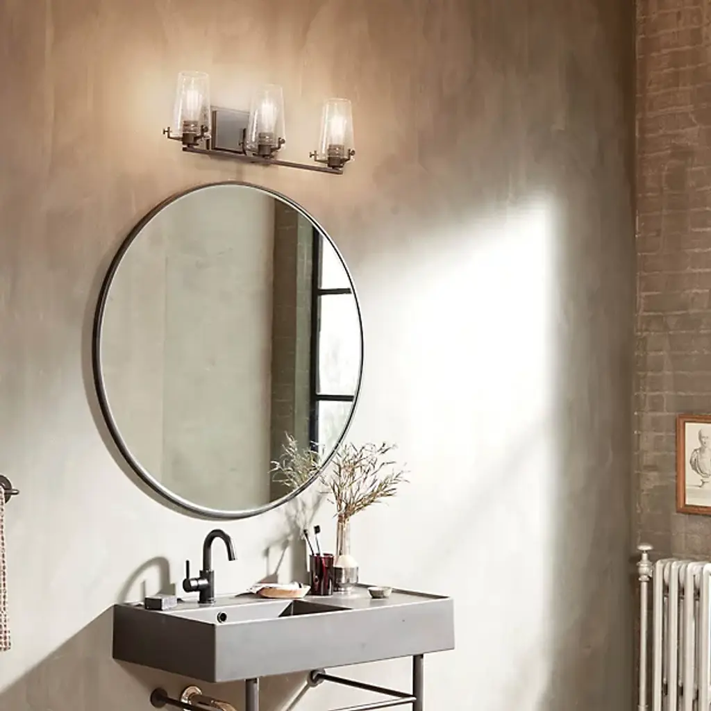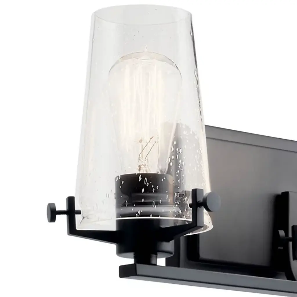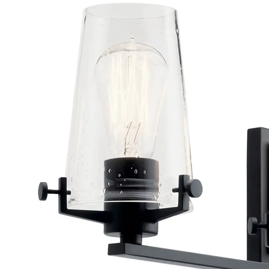 The Kichler Alton Vanity Light has a sophisticated presence that still exudes a modern aesthetic. A long thin rod supports clear glass shades, each hosting their own bulb. The seeded glass takes on a unique texture when the fixture is lit, the air bubbles adding a small dose of complexity to this simple fixture. The exposed hardware adds the final detail, completing the piece with a subtle industrial flair.