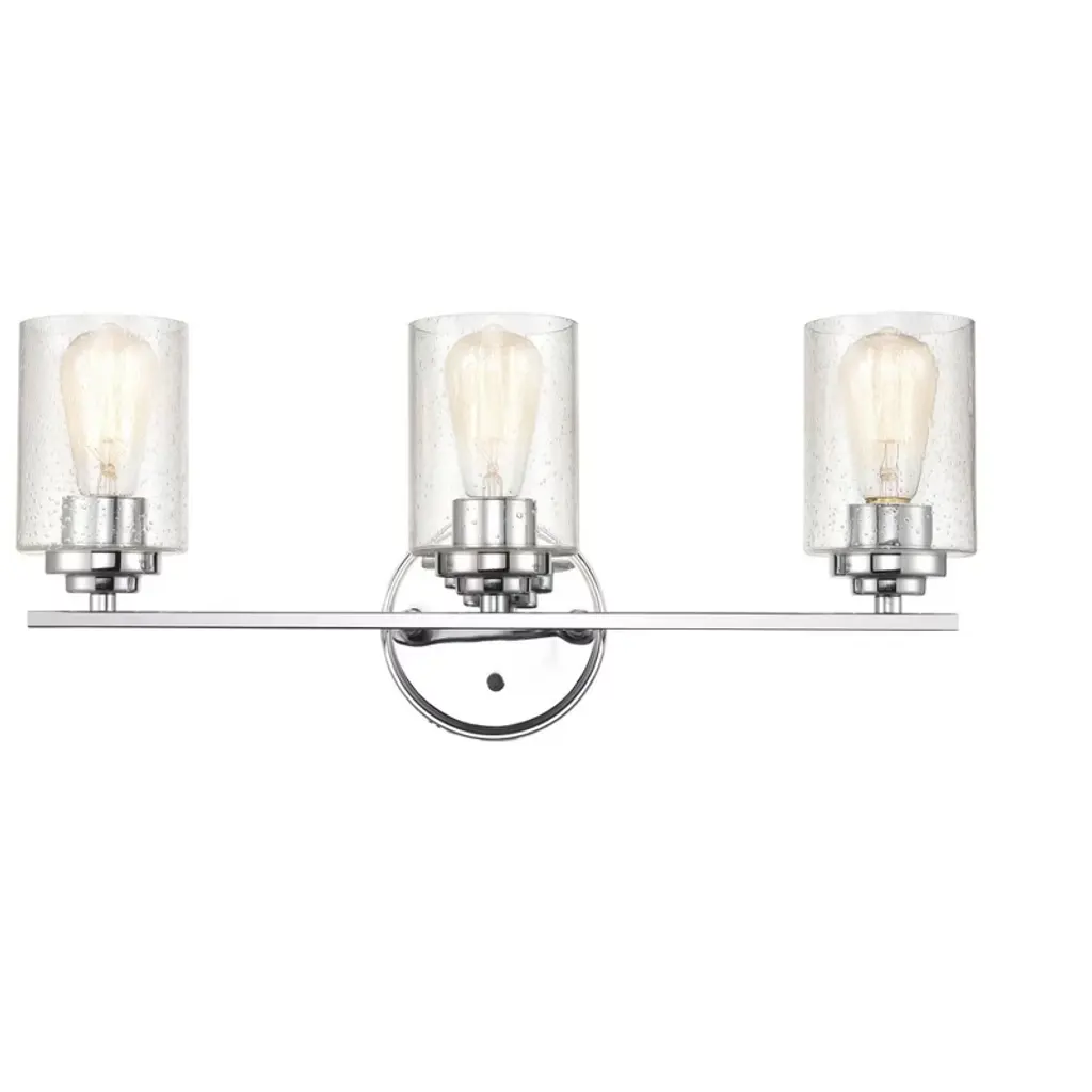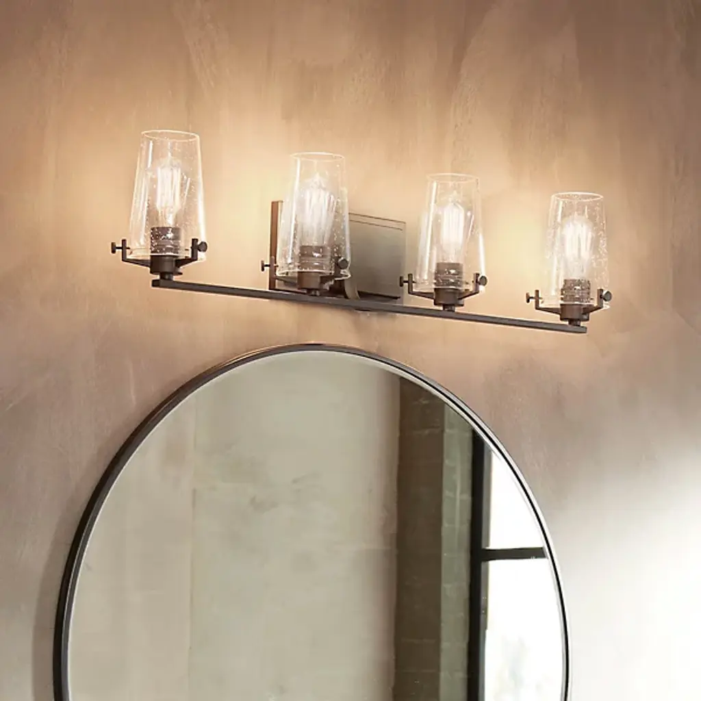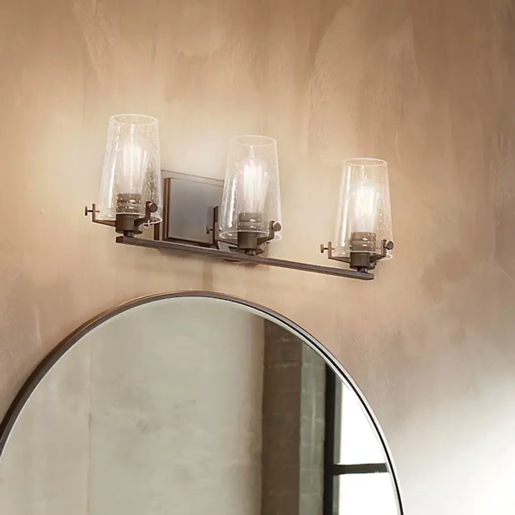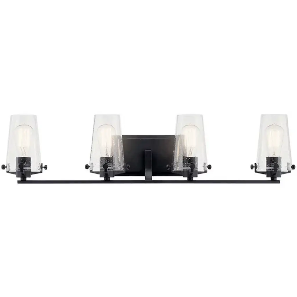 The Kichler Alton Vanity Light has a sophisticated presence that still exudes a modern aesthetic. A long thin rod supports clear glass shades, each hosting their own bulb. The seeded glass takes on a unique texture when the fixture is lit, the air bubbles adding a small dose of complexity to this simple fixture. The exposed hardware adds the final detail, completing the piece with a subtle industrial flair.