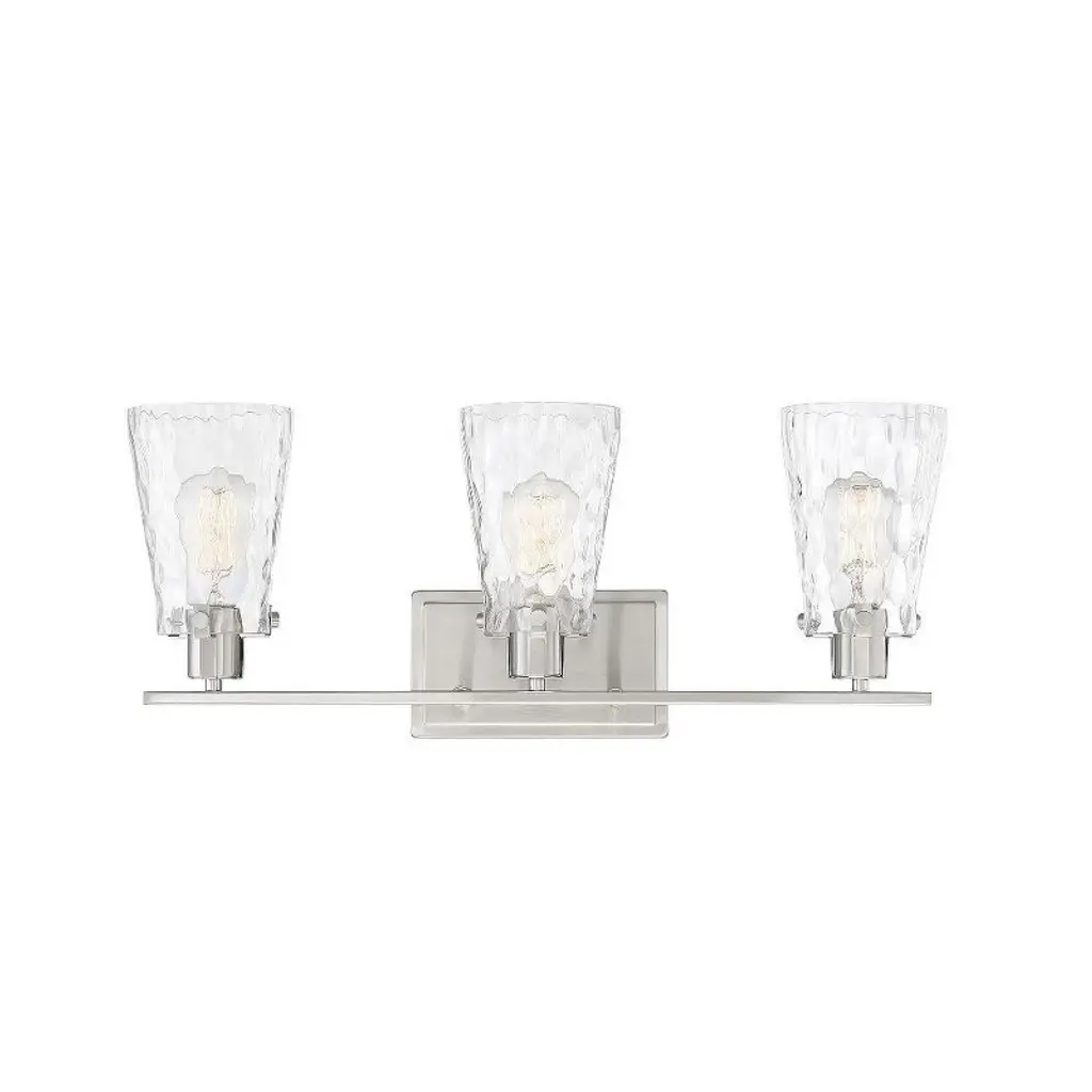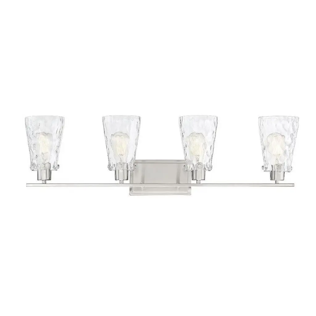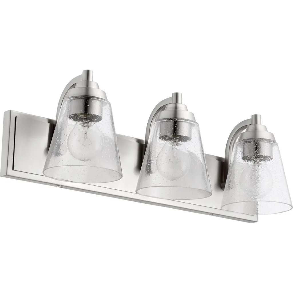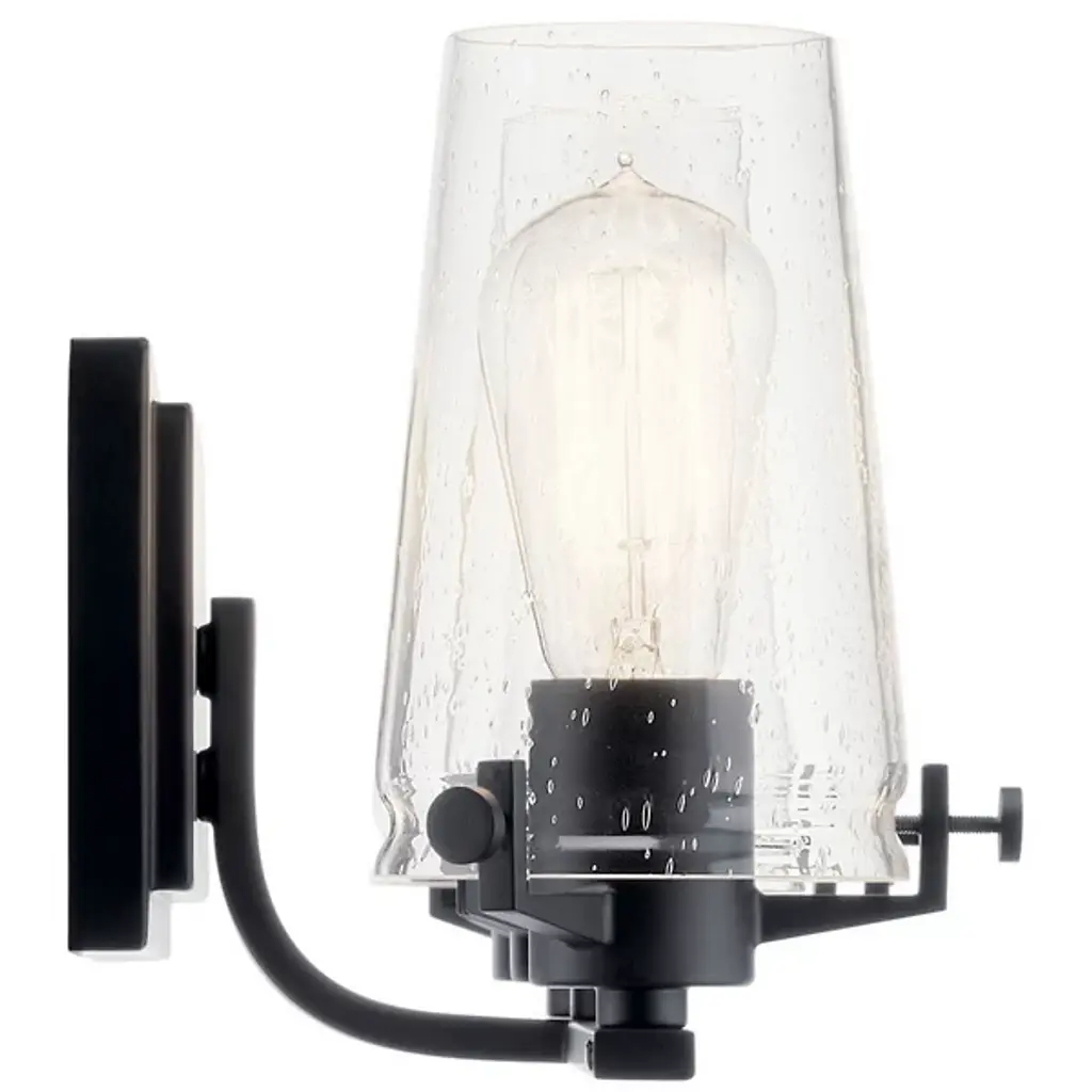 The Kichler Alton Vanity Light has a sophisticated presence that still exudes a modern aesthetic. A long thin rod supports clear glass shades, each hosting their own bulb. The seeded glass takes on a unique texture when the fixture is lit, the air bubbles adding a small dose of complexity to this simple fixture. The exposed hardware adds the final detail, completing the piece with a subtle industrial flair.