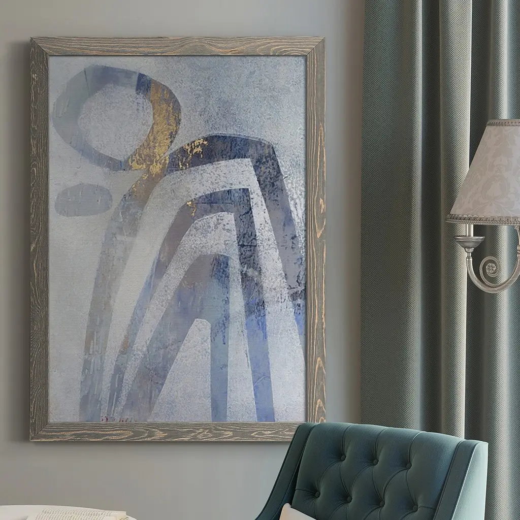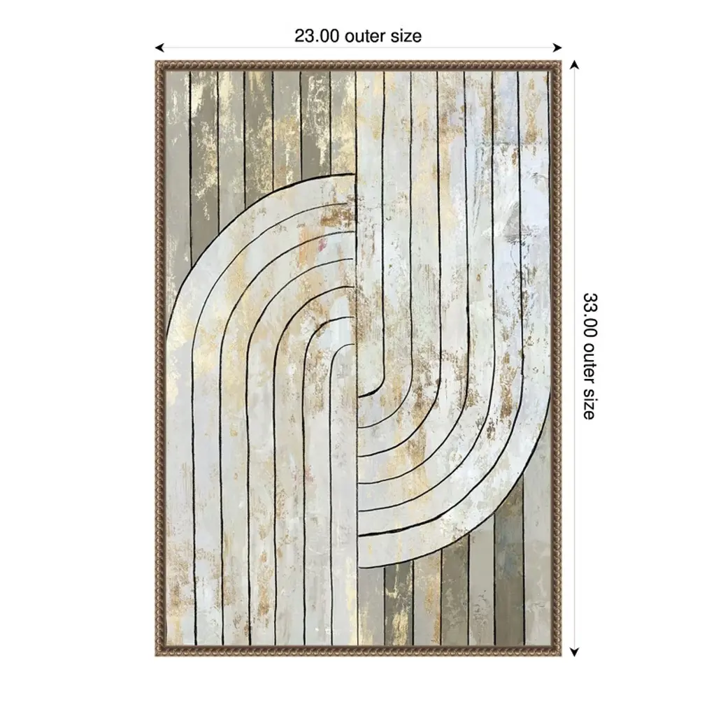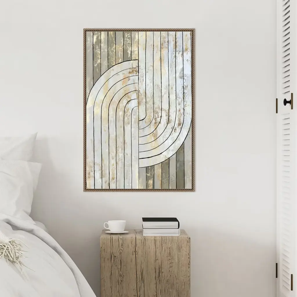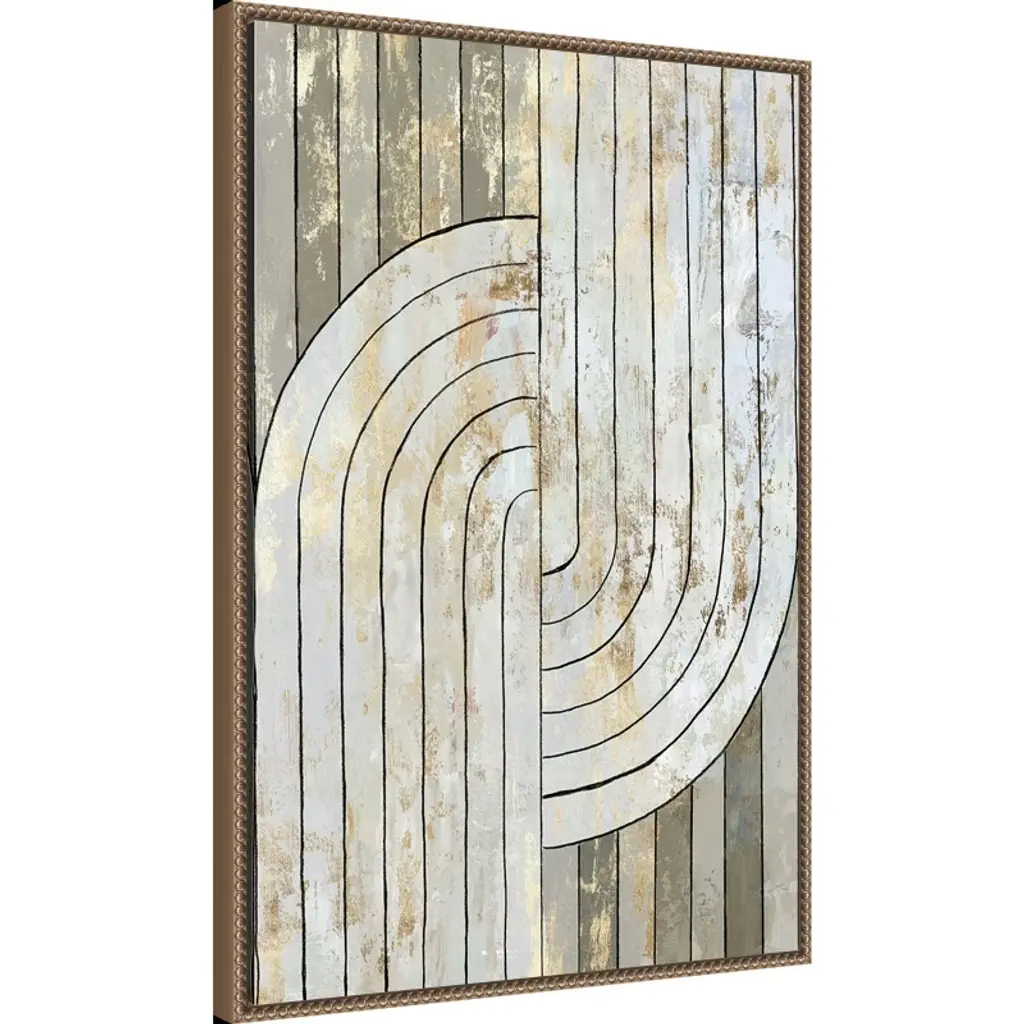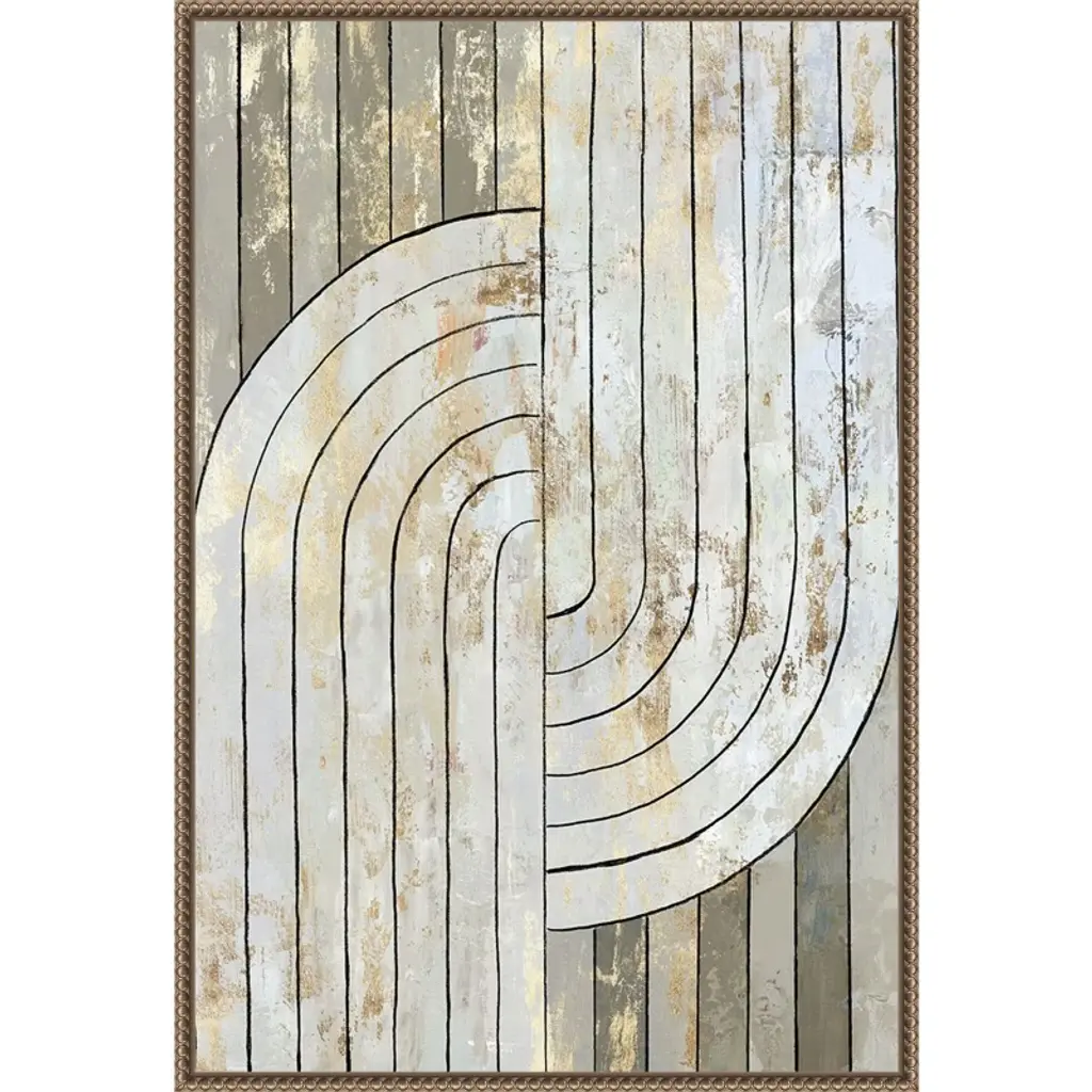 The artwork features a series of vertical lines intersected by curved arcs, creating a geometric pattern. It uses a neutral color palette with subtle textures and metallic hues. The overall composition combines modern minimalism with an abstract design. This canvas art print was created by Tom Reeves and printed in Waunakee, WI. It is stretched across a solid surface to resist sagging. We use only premium, high-tension canvas. Our exclusive stretching techniques hide corner folds and provide a taut canvas surface. The artwork is authentically licensed. The canvas appears as if it is floating in the frame because it has a narrow gap between the edge of the canvas and the frame. Our canvas items are individually made using traditional custom framing techniques, it has the quality you would expect from your local frame shop.