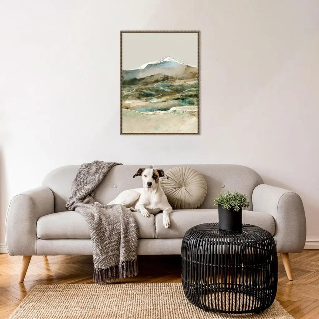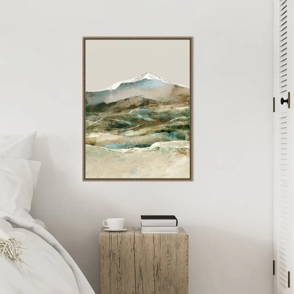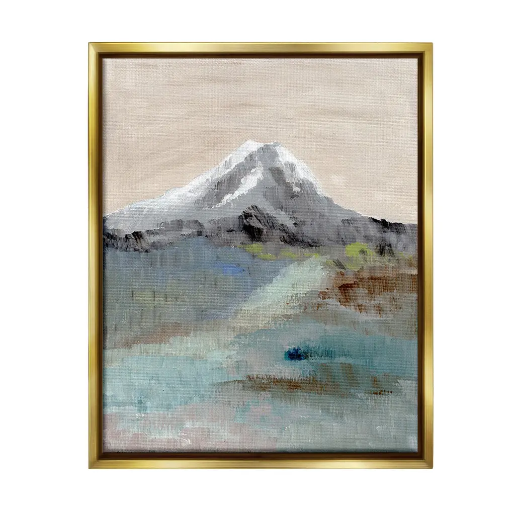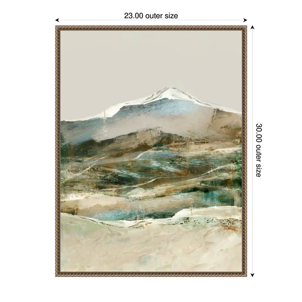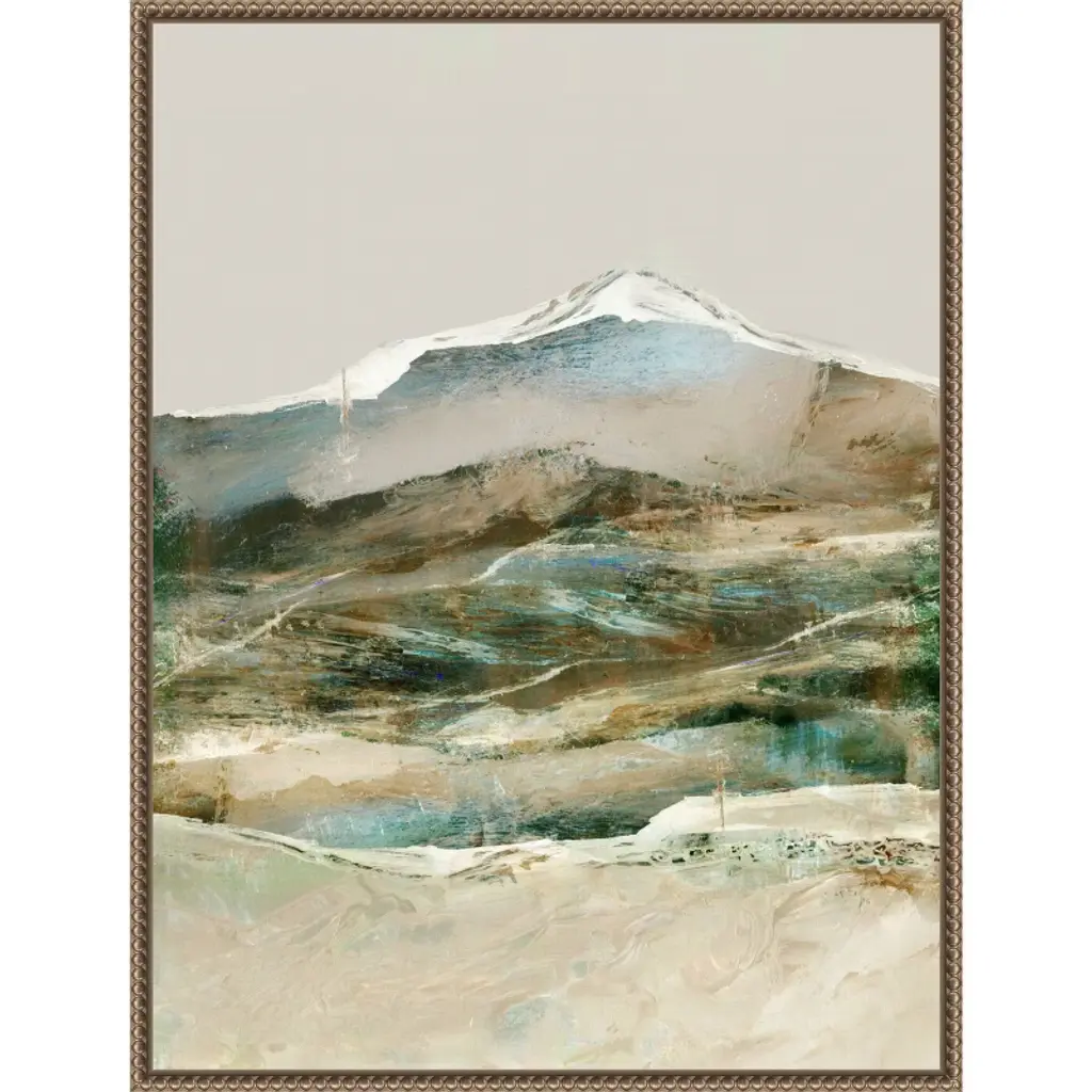 This artwork features an abstract landscape with a mountain under a light sky. The piece uses earthy tones and expressive brushstrokes to convey a serene and natural setting. The mountain is partly covered with snow, adding contrast and depth to the composition. This canvas art print was created by Dan Hobday and printed in Waunakee, WI. It is stretched across a solid surface to resist sagging. We use only premium, high-tension canvas. Our exclusive stretching techniques hide corner folds and provide a taut canvas surface. The artwork is authentically licensed. The canvas appears as if it is floating in the frame because it has a narrow gap between the edge of the canvas and the frame. Our canvas items are individually made using traditional custom framing techniques, it has the quality you would expect from your local frame shop.