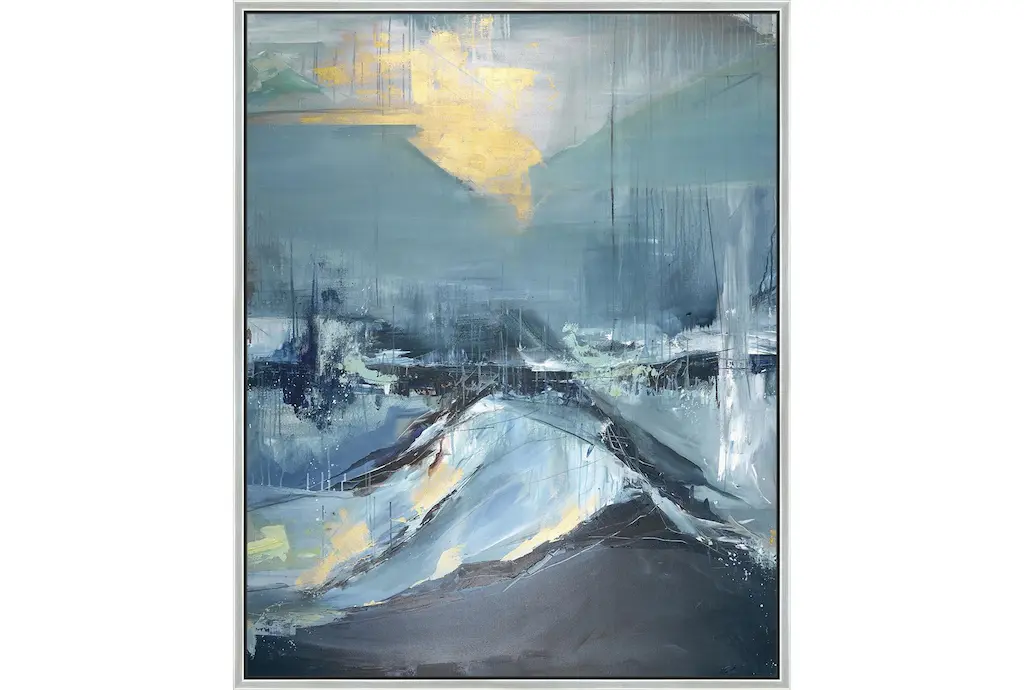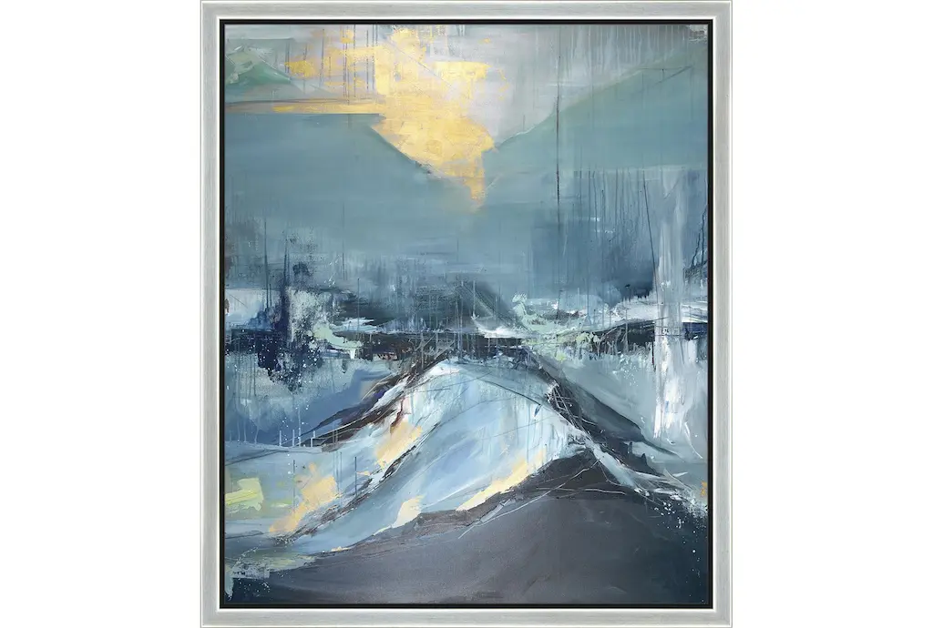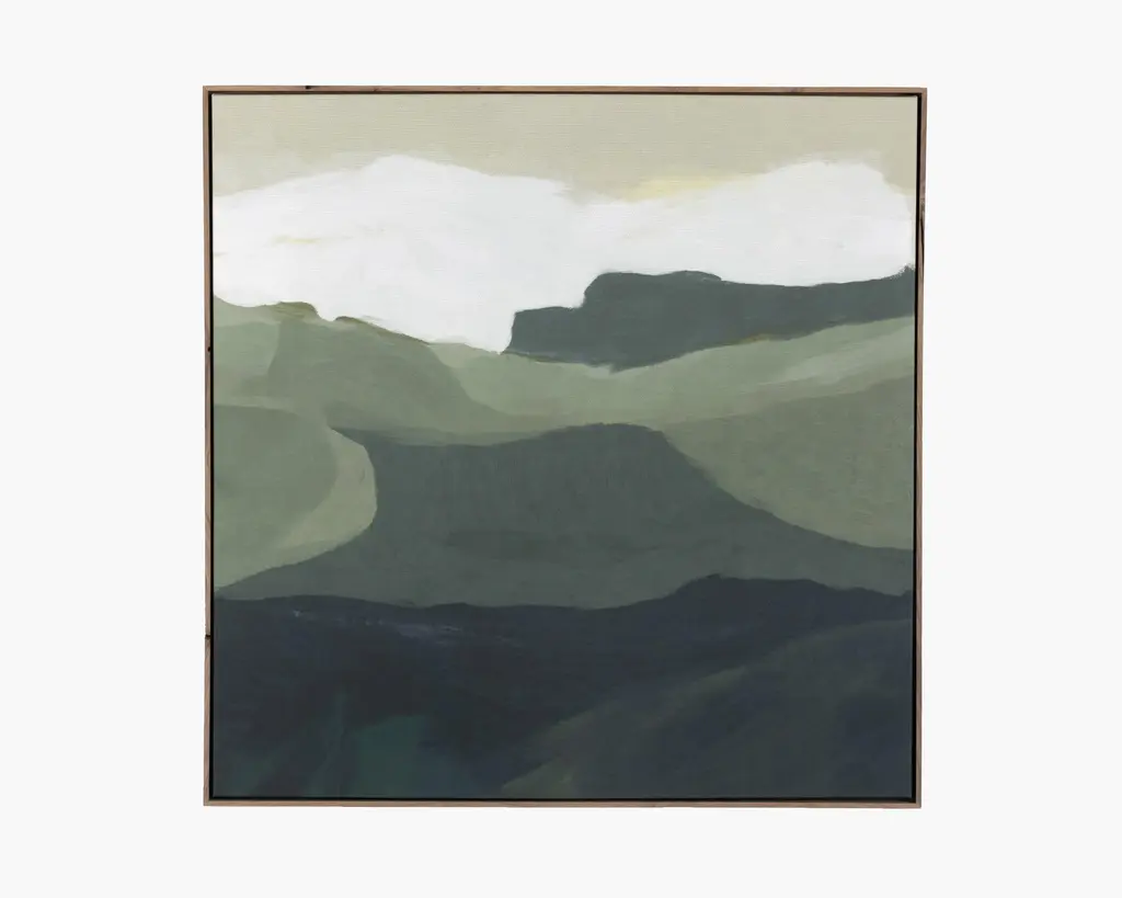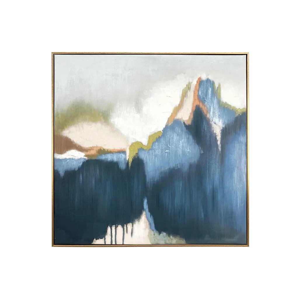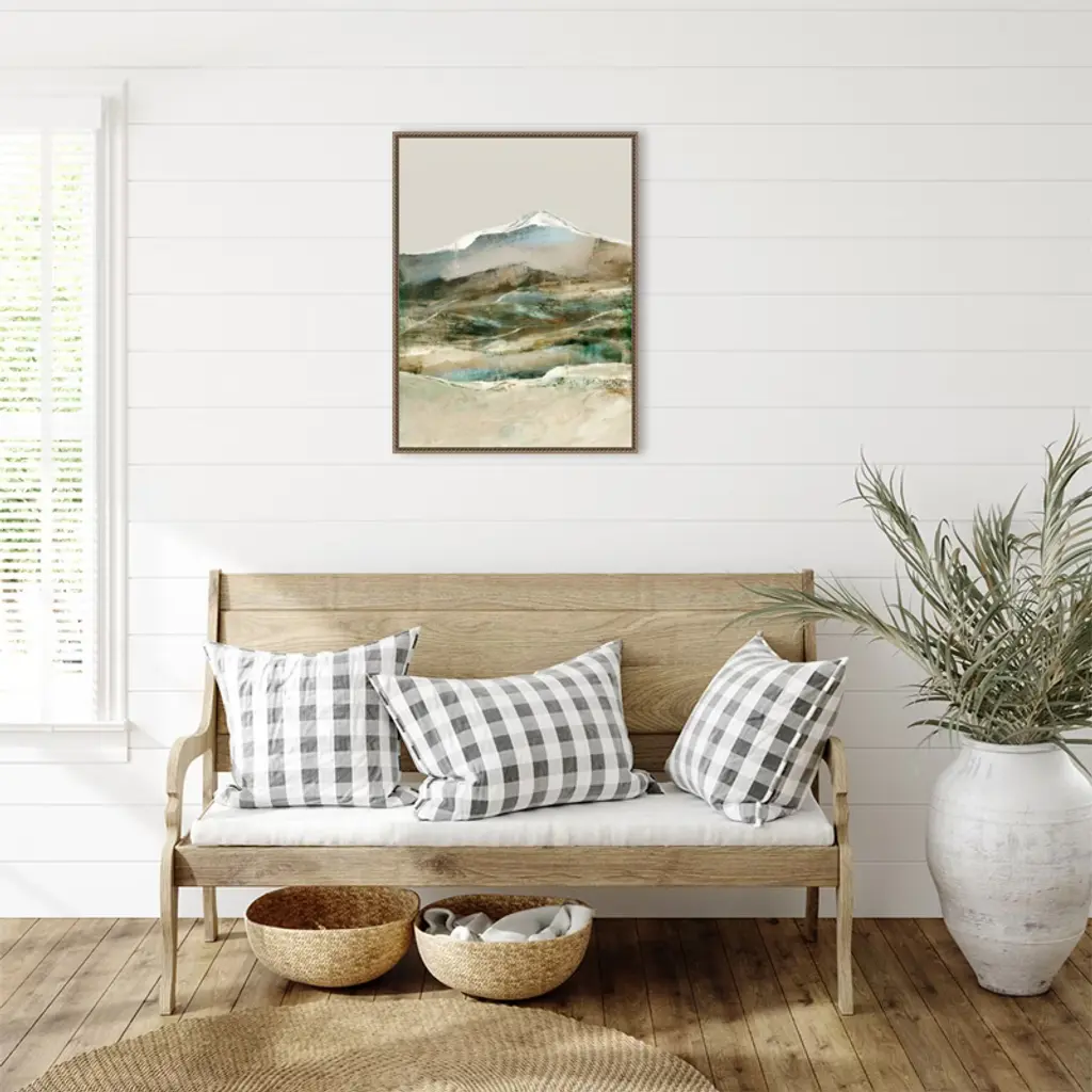 This artwork features an abstract landscape with a mountain under a light sky. The piece uses earthy tones and expressive brushstrokes to convey a serene and natural setting. The mountain is partly covered with snow, adding contrast and depth to the composition. This canvas art print was created by Dan Hobday and printed in Waunakee, WI. It is stretched across a solid surface to resist sagging. We use only premium, high-tension canvas. Our exclusive stretching techniques hide corner folds and provide a taut canvas surface. The artwork is authentically licensed. The canvas appears as if it is floating in the frame because it has a narrow gap between the edge of the canvas and the frame. Our canvas items are individually made using traditional custom framing techniques, it has the quality you would expect from your local frame shop.