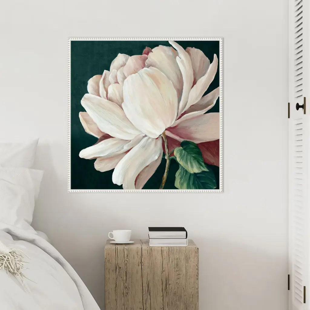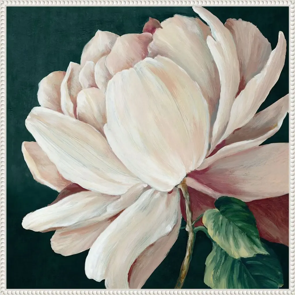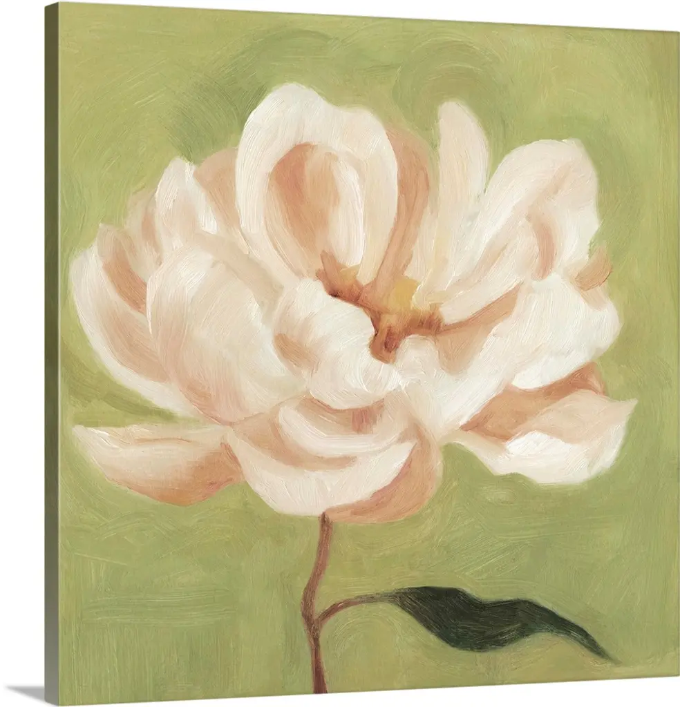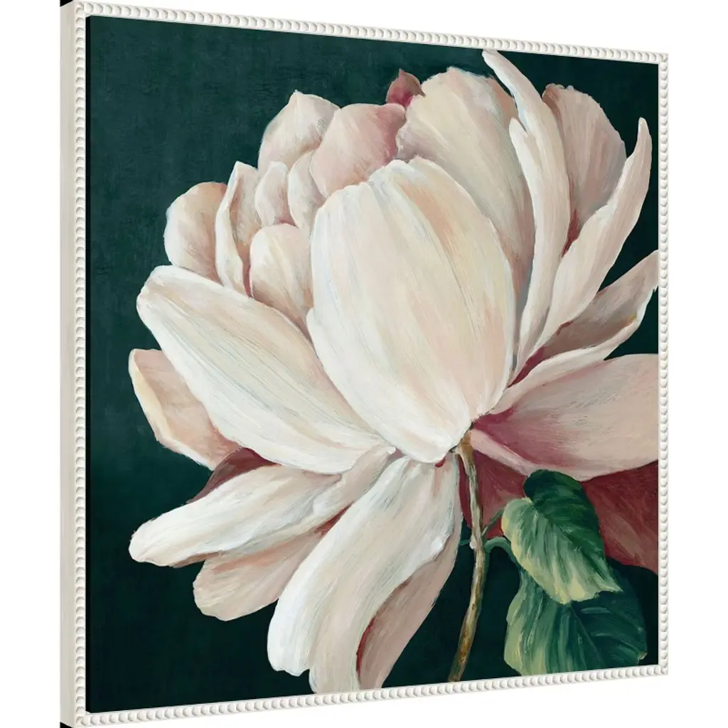 The artwork features a large, detailed peony bloom in soft pink and cream tones, set against a deep green background. The delicate petals are rendered with graceful brushstrokes that highlight their natural curves. A single green leaf accompanies the flower, adding a touch of contrast to the composition. This canvas art print was created by Alex Black and printed in Waunakee, WI. It is stretched across a solid surface to resist sagging. We use only premium, high-tension canvas. Our exclusive stretching techniques hide corner folds and provide a taut canvas surface. The artwork is authentically licensed. The canvas appears as if it is floating in the frame because it has a narrow gap between the edge of the canvas and the frame. Our canvas items are individually made using traditional custom framing techniques, it has the quality you would expect from your local frame shop.