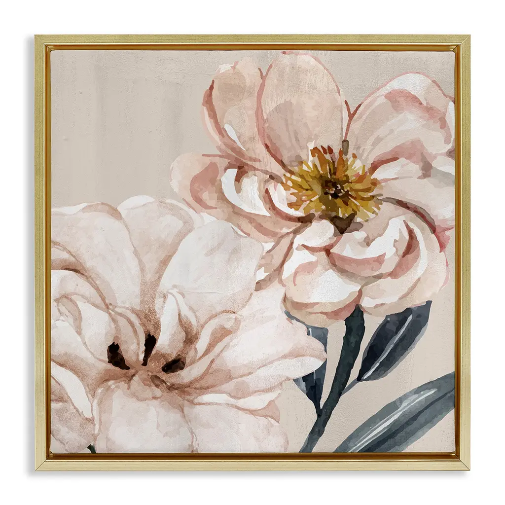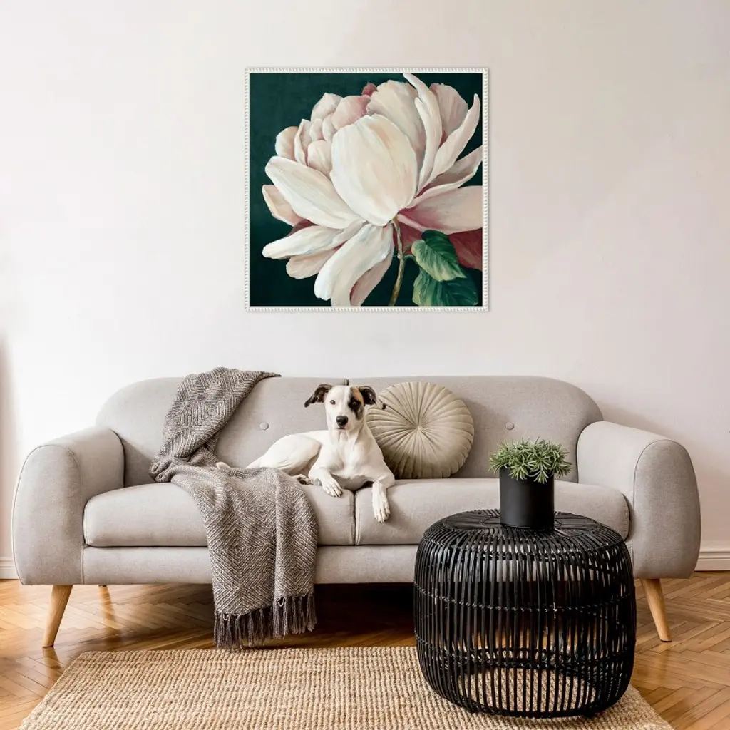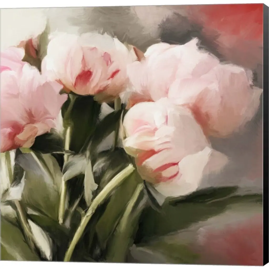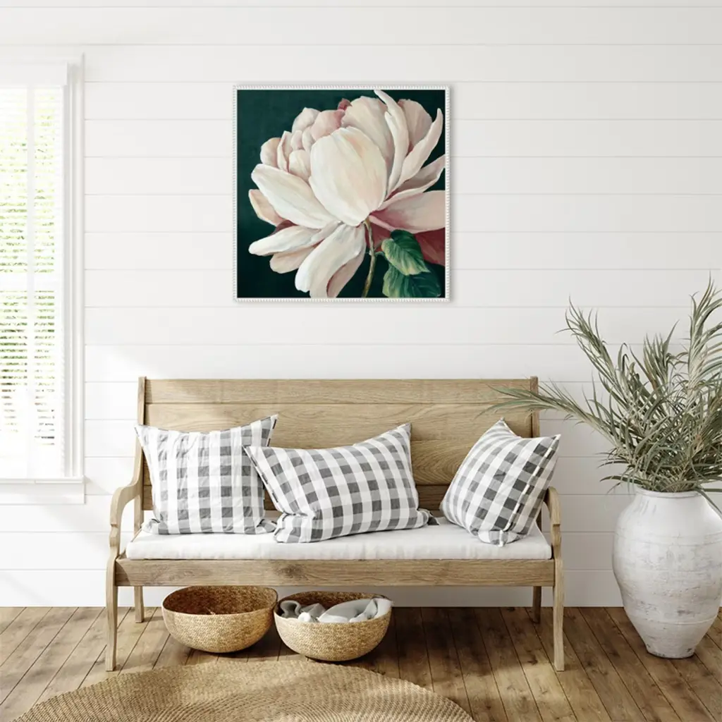 The artwork features a large, detailed peony bloom in soft pink and cream tones, set against a deep green background. The delicate petals are rendered with graceful brushstrokes that highlight their natural curves. A single green leaf accompanies the flower, adding a touch of contrast to the composition. This canvas art print was created by Alex Black and printed in Waunakee, WI. It is stretched across a solid surface to resist sagging. We use only premium, high-tension canvas. Our exclusive stretching techniques hide corner folds and provide a taut canvas surface. The artwork is authentically licensed. The canvas appears as if it is floating in the frame because it has a narrow gap between the edge of the canvas and the frame. Our canvas items are individually made using traditional custom framing techniques, it has the quality you would expect from your local frame shop.