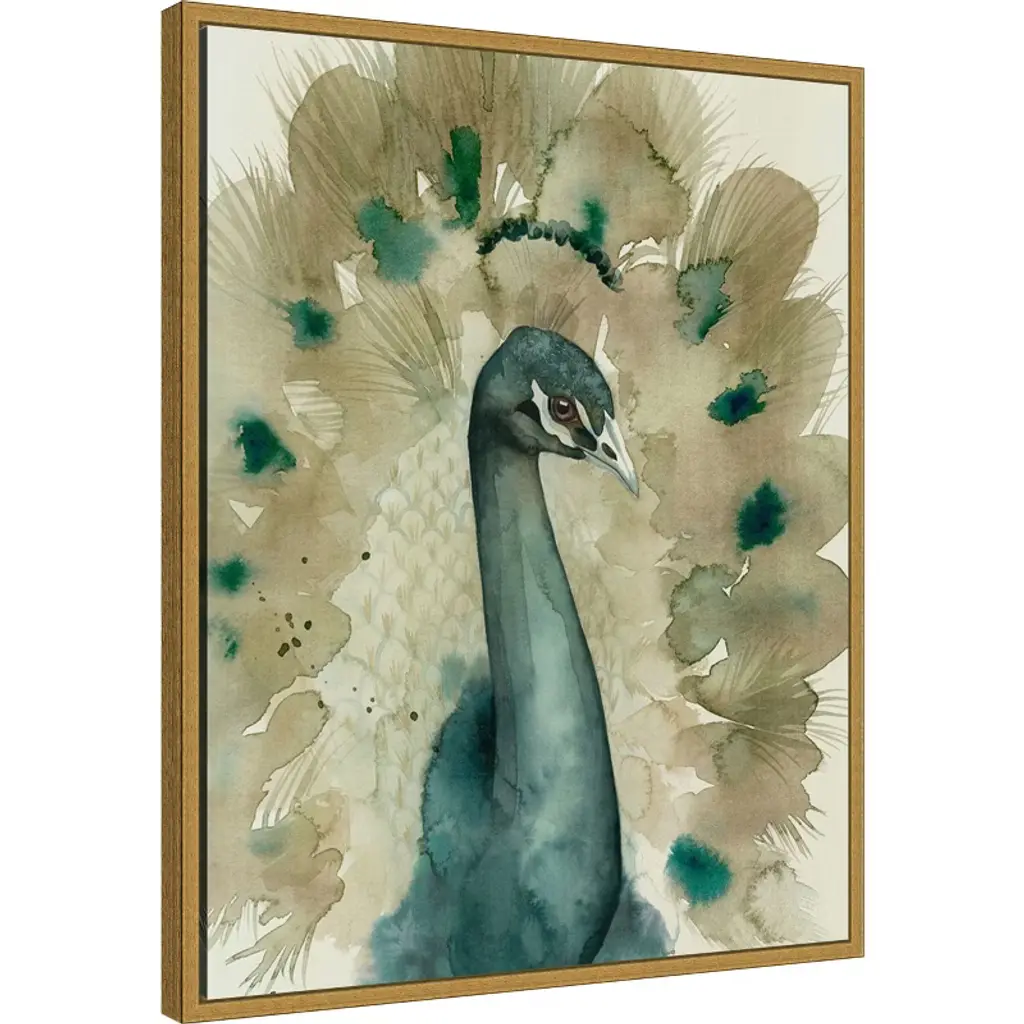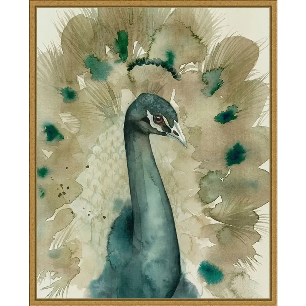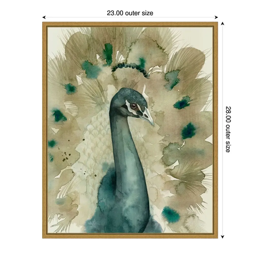The artwork features a peacock rendered in watercolor, with a mix of soft teal and earthy tones. The feathers form an abstract background, blending smoothly with the main subject. The peacock's regal posture and expressive eye add to the piece's serene and elegant feel. This canvas art print was created by Grace Popp and printed in Waunakee, WI. It is stretched across a solid surface to resist sagging. We use only premium, high-tension canvas. Our exclusive stretching techniques hide corner folds and provide a taut canvas surface. The artwork is authentically licensed. The canvas appears as if it is floating in the frame because it has a narrow gap between the edge of the canvas and the frame. Our canvas items are individually made using traditional custom framing techniques, it has the quality you would expect from your local frame shop.