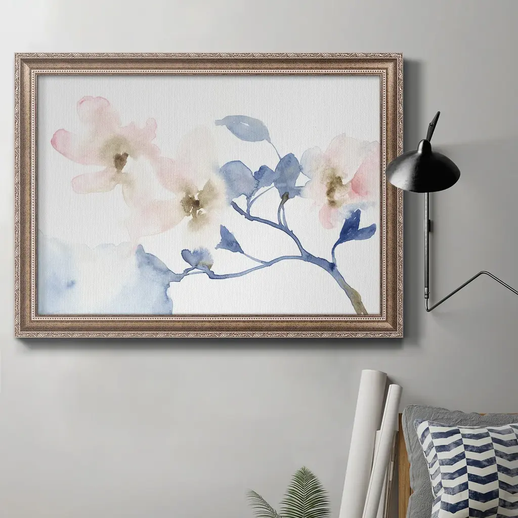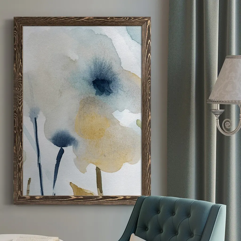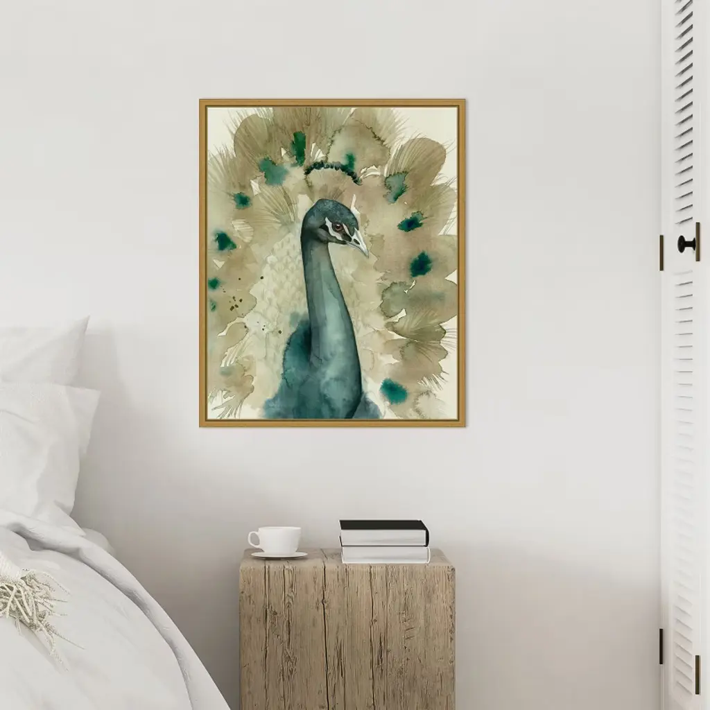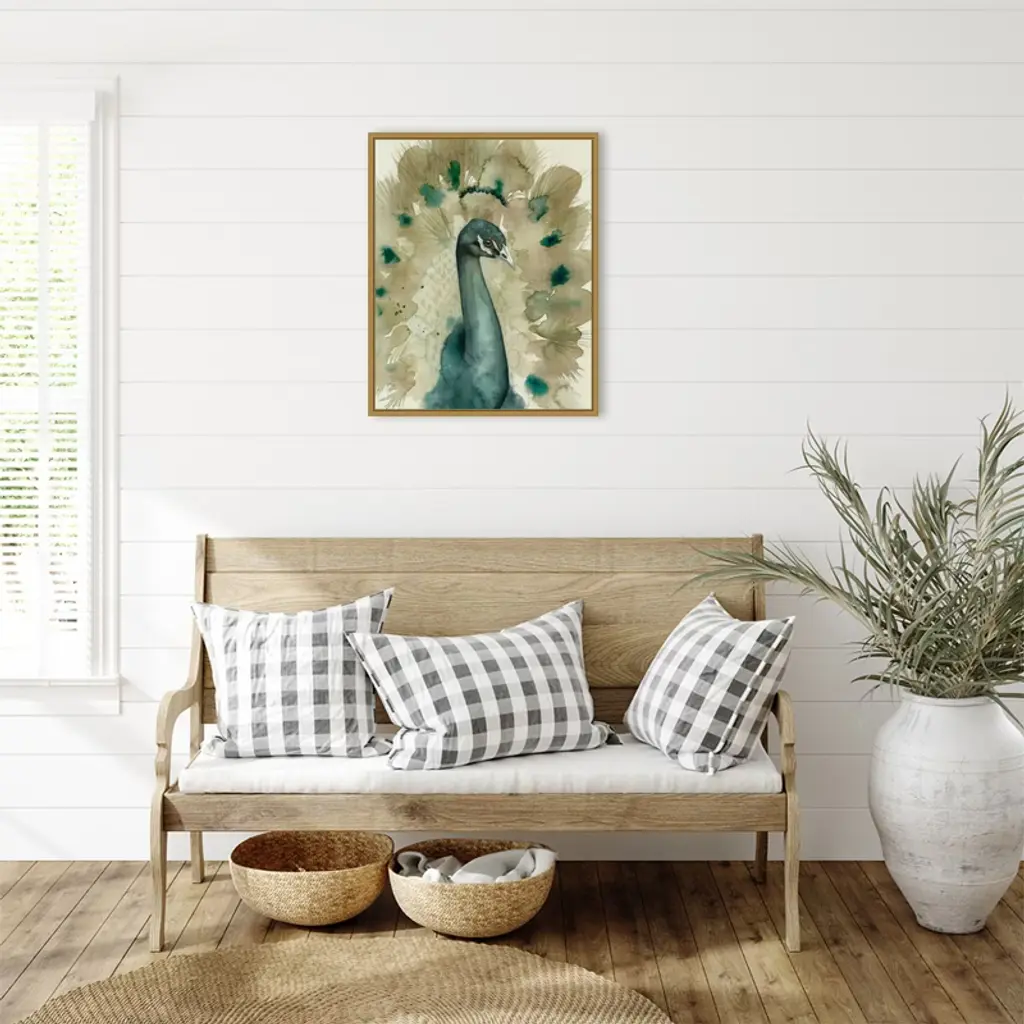 The artwork features a peacock rendered in watercolor, with a mix of soft teal and earthy tones. The feathers form an abstract background, blending smoothly with the main subject. The peacock's regal posture and expressive eye add to the piece's serene and elegant feel. This canvas art print was created by Grace Popp and printed in Waunakee, WI. It is stretched across a solid surface to resist sagging. We use only premium, high-tension canvas. Our exclusive stretching techniques hide corner folds and provide a taut canvas surface. The artwork is authentically licensed. The canvas appears as if it is floating in the frame because it has a narrow gap between the edge of the canvas and the frame. Our canvas items are individually made using traditional custom framing techniques, it has the quality you would expect from your local frame shop.