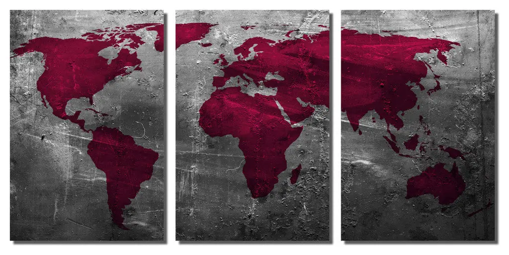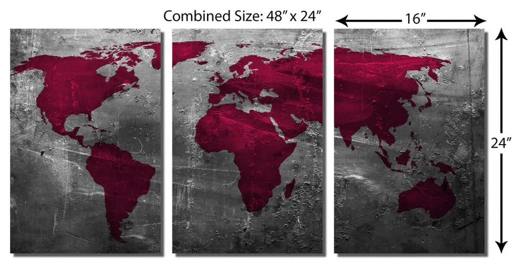 48"œ x 24"œ total size. Ready To Hang! (3 pieces - 16"œ x 24"œ each). 3 Panel Split (Triptych) Abstract art World Map Metal Print ft. shades of amaranth purple and gray colors. Modern metal wall art for home or office wall decor & interior design. Printed on Luxurious, HD aluminum glossy metal panels. Multi Panel art.. HD aluminum panels. Metal print wall art. Includes Shadow Wall Mount on the back.• Aluminum Metal Wall Art• Made in USA• Ready to hang - No assembly required• Shadow mount hardware on the back• 0.045"œ thick HD Aluminum Panels• Scratch resistant, glossy finish• Superb color clarity, luxurious prints• Epson printing process• For indoor or moisture rich environment use• Easy to clean. Gently wipe with microfiber cloth.