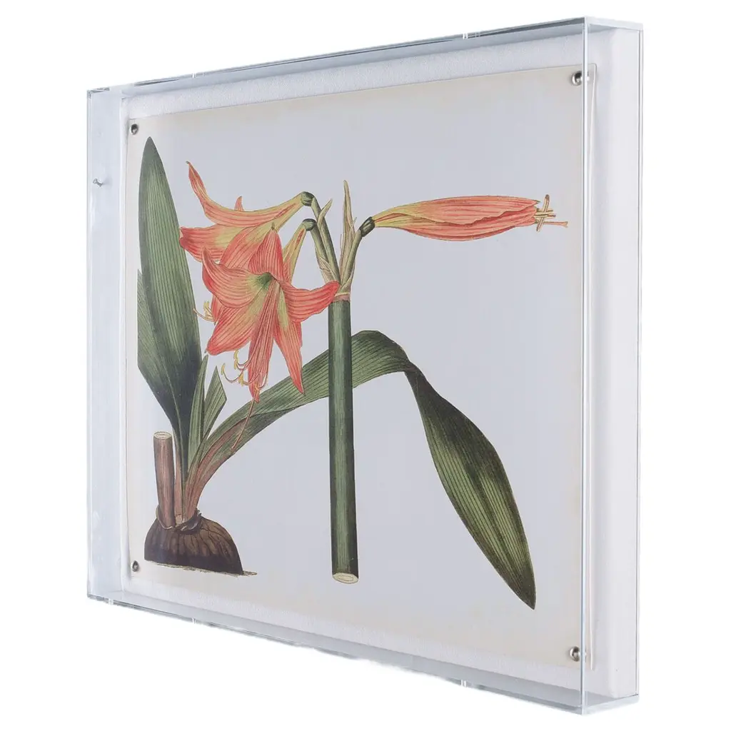 Our artwork collection features a giclee print mounted under a 2.5" deep lucite shadow box. Attached to a linen wrapped interior panel, the artwork is finished with black nail head in each corner. Each panel is sold individually. Artwork may be hung individually, as a pair or grouped as a family of four.