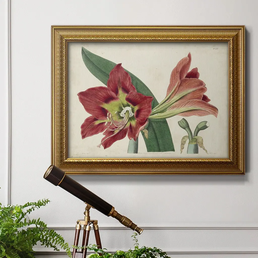 Amaryllis Splendor I Premium Framed Canvas- Ready to Hang A Premium Framed Canvas created to last. Framed in distressed wood and available in an array of sizes and colors Featuring a beveled a solid wood stretcher bar, each piece comes ready to hand 3 SIZES AVAILABLE 16''X20'' - Overall Size 18'X27'' - Overall Size 24''x36'' - Overall Size Each piece is made to order. Each piece comes with hanging hardware. Made in the USA Ready to Hang Giclee Paper Print Acrylic Glass Beveled Matt Board