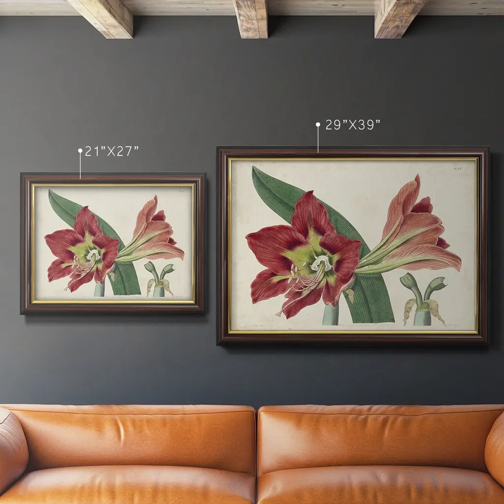Amaryllis Splendor I Premium Framed Canvas- Ready to Hang A Premium Framed Canvas created to last. Framed in distressed wood and available in an array of sizes and colors Featuring a beveled a solid wood stretcher bar, each piece comes ready to hand 3 SIZES AVAILABLE 16''X20'' - Overall Size 18'X27'' - Overall Size 24''x36'' - Overall Size Each piece is made to order. Each piece comes with hanging hardware. Made in the USA Ready to Hang Giclee Paper Print Acrylic Glass Beveled Matt Board