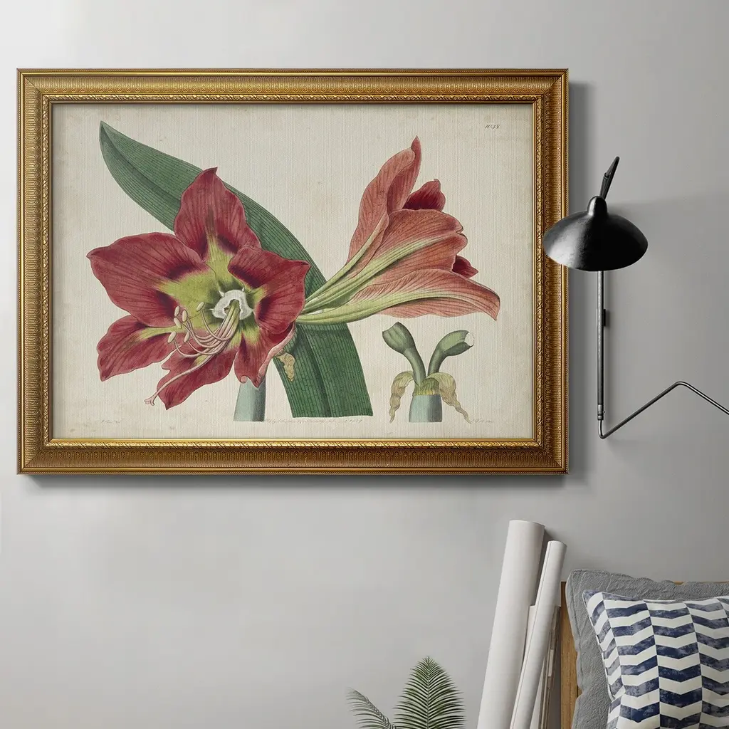 Amaryllis Splendor I Premium Framed Canvas- Ready to Hang A Premium Framed Canvas created to last. Framed in distressed wood and available in an array of sizes and colors Featuring a beveled a solid wood stretcher bar, each piece comes ready to hand 3 SIZES AVAILABLE 16''X20'' - Overall Size 18'X27'' - Overall Size 24''x36'' - Overall Size Each piece is made to order. Each piece comes with hanging hardware. Made in the USA Ready to Hang Giclee Paper Print Acrylic Glass Beveled Matt Board