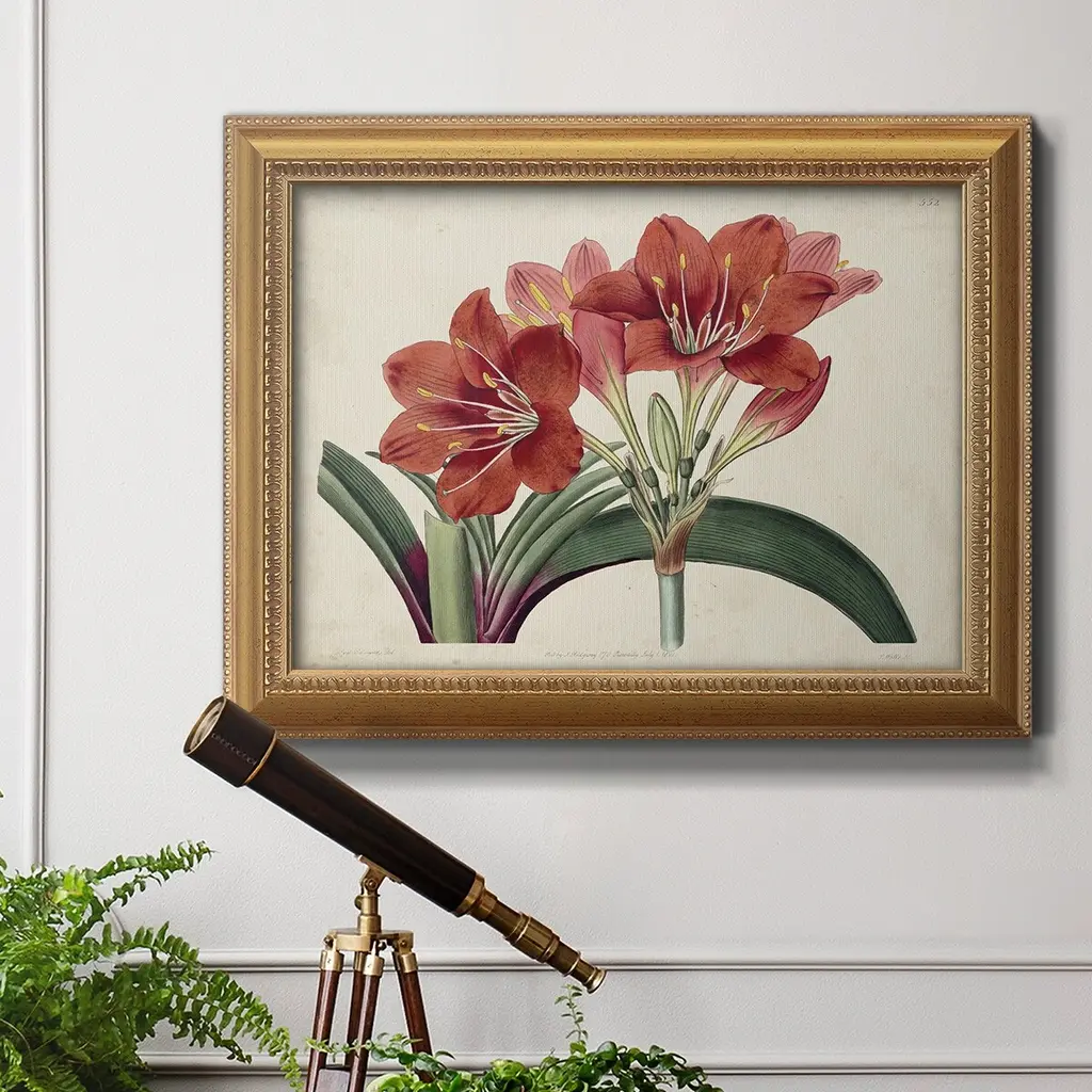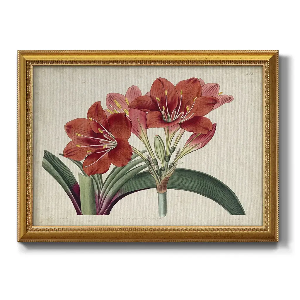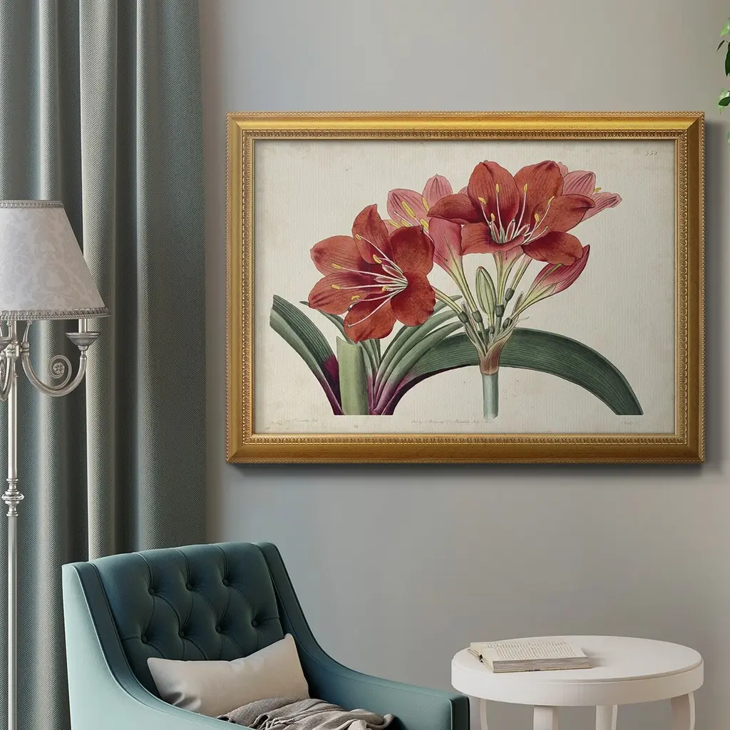 Amaryllis Splendor II Premium Framed Canvas- Ready to Hang A Premium Framed Canvas created to last. Framed in distressed wood and available in an array of sizes and colors Featuring a beveled a solid wood stretcher bar, each piece comes ready to hand 3 SIZES AVAILABLE 16''X20'' - Overall Size 18'X27'' - Overall Size 24''x36'' - Overall Size Each piece is made to order. Each piece comes with hanging hardware. Made in the USA Ready to Hang Giclee Paper Print Acrylic Glass Beveled Matt Board