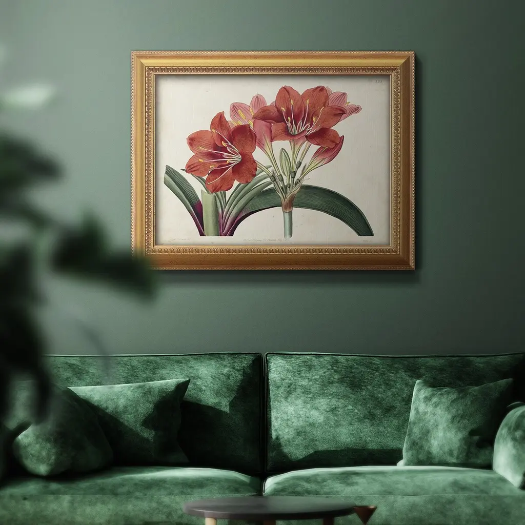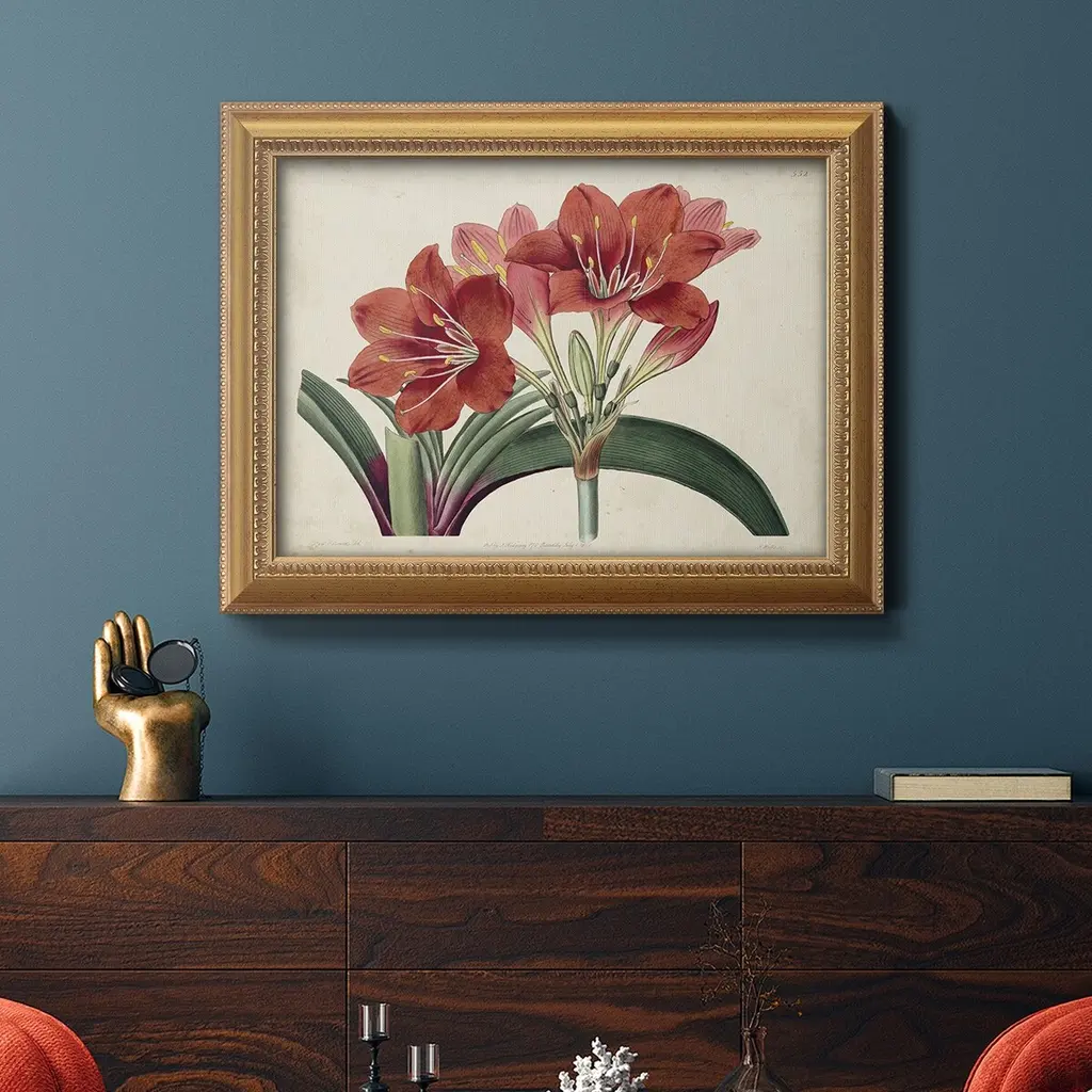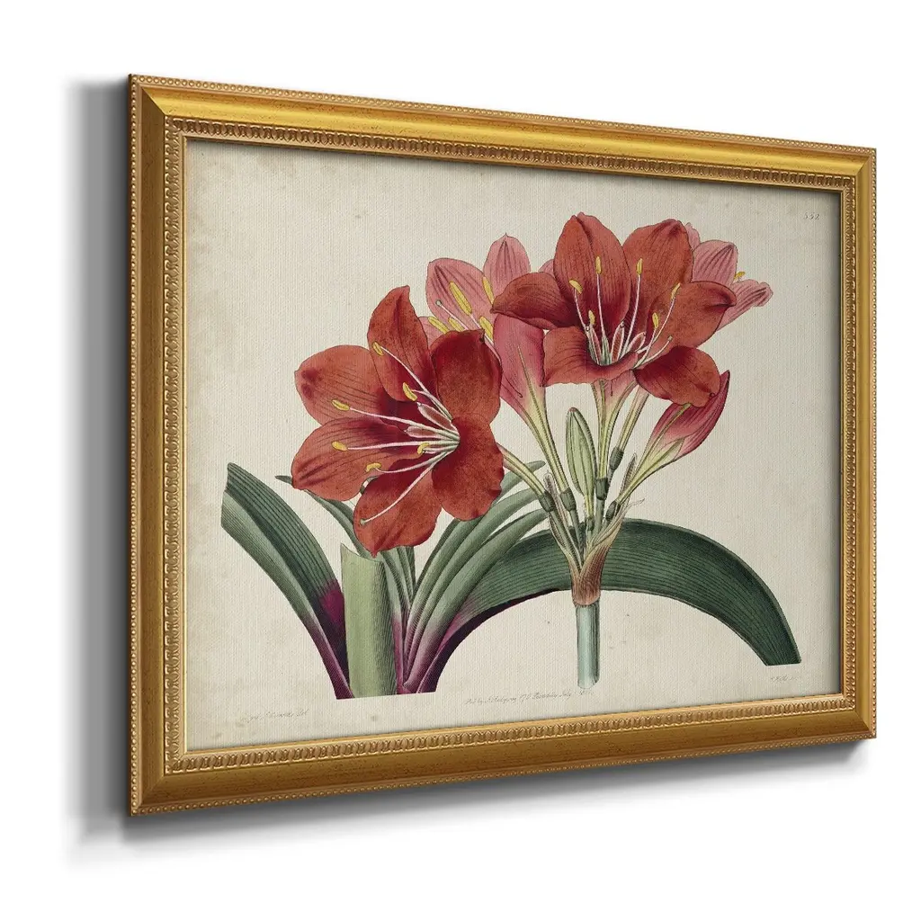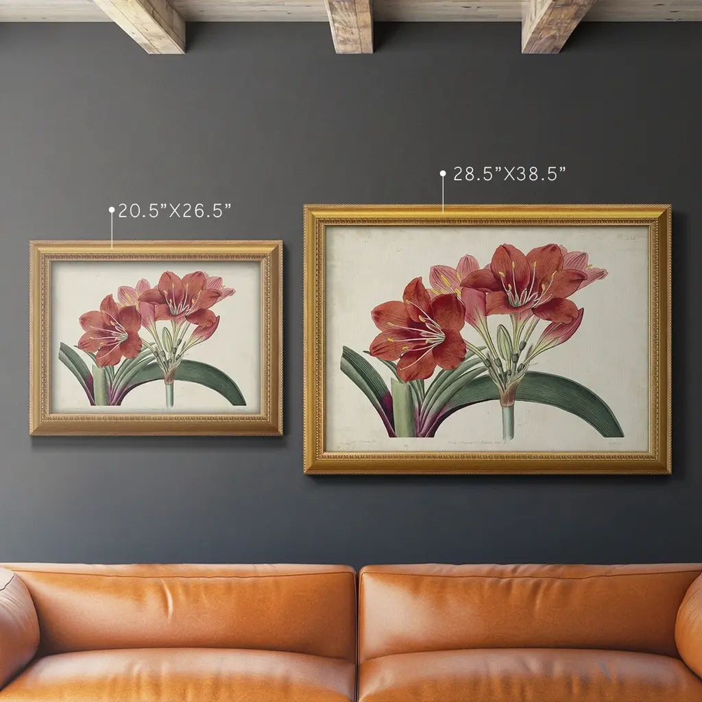 Amaryllis Splendor II Premium Framed Canvas- Ready to Hang A Premium Framed Canvas created to last. Framed in distressed wood and available in an array of sizes and colors Featuring a beveled a solid wood stretcher bar, each piece comes ready to hand 3 SIZES AVAILABLE 16''X20'' - Overall Size 18'X27'' - Overall Size 24''x36'' - Overall Size Each piece is made to order. Each piece comes with hanging hardware. Made in the USA Ready to Hang Giclee Paper Print Acrylic Glass Beveled Matt Board