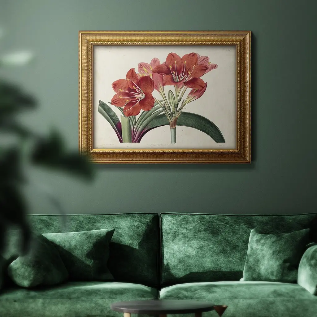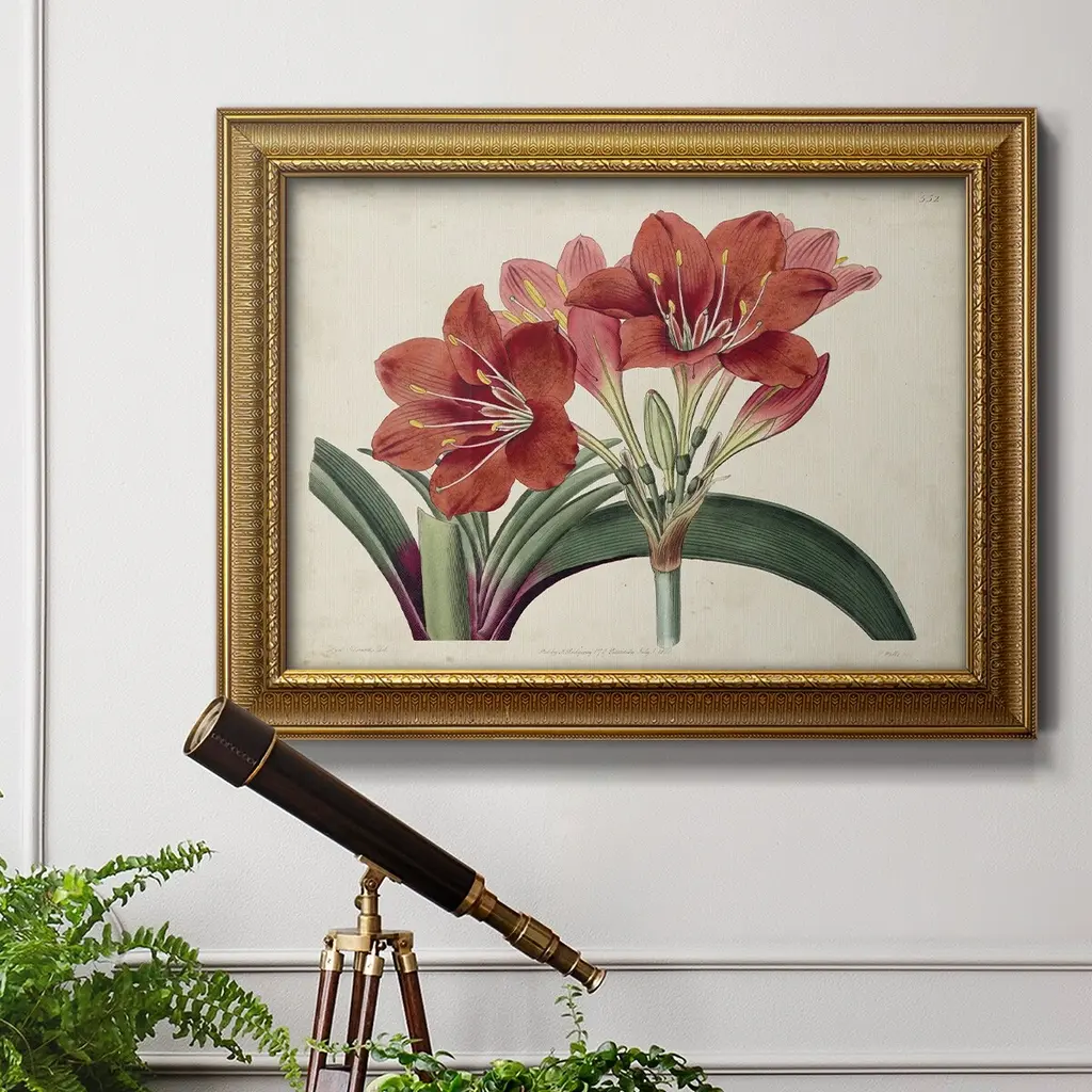 Amaryllis Splendor II Premium Framed Canvas- Ready to Hang A Premium Framed Canvas created to last. Framed in distressed wood and available in an array of sizes and colors Featuring a beveled a solid wood stretcher bar, each piece comes ready to hand 3 SIZES AVAILABLE 16''X20'' - Overall Size 18'X27'' - Overall Size 24''x36'' - Overall Size Each piece is made to order. Each piece comes with hanging hardware. Made in the USA Ready to Hang Giclee Paper Print Acrylic Glass Beveled Matt Board