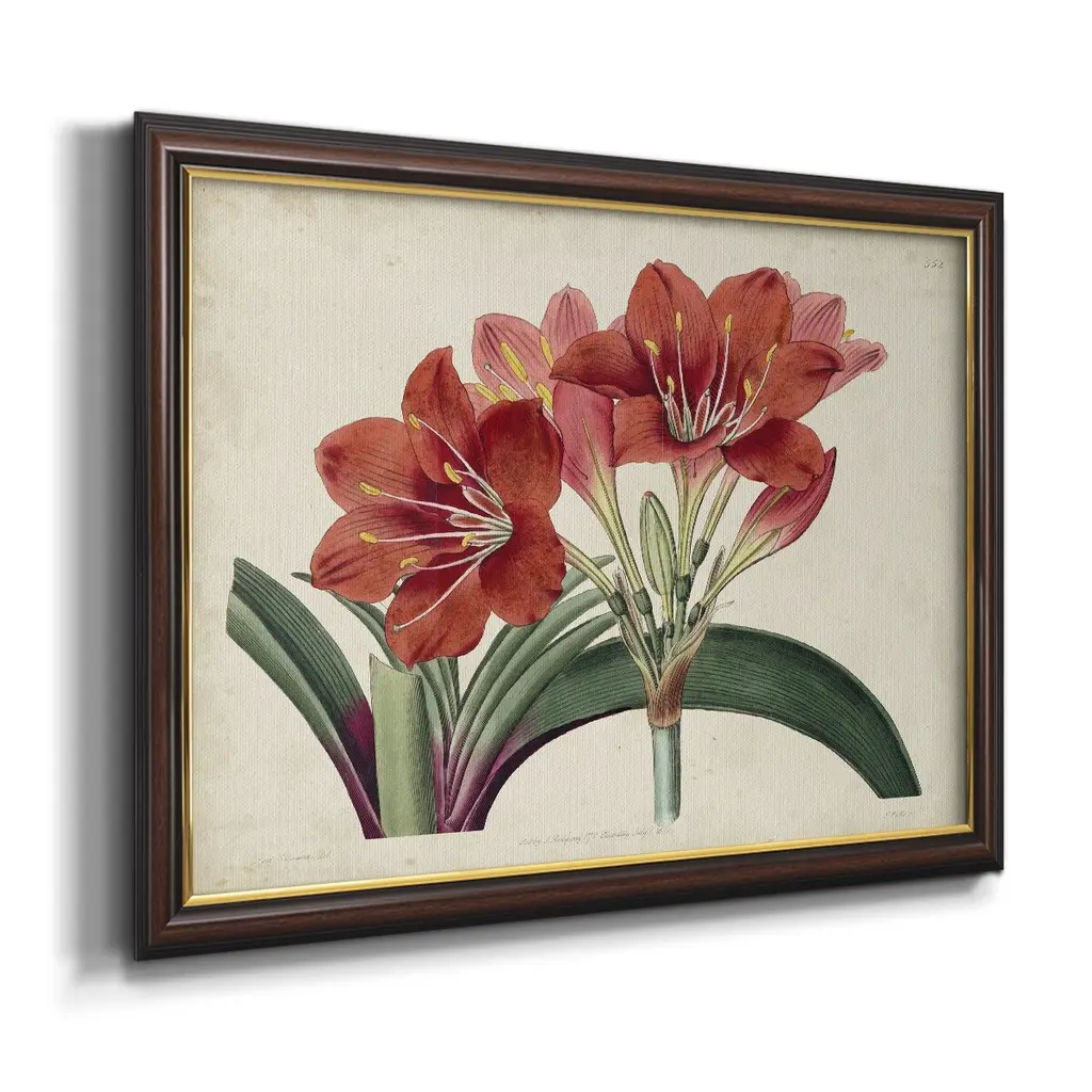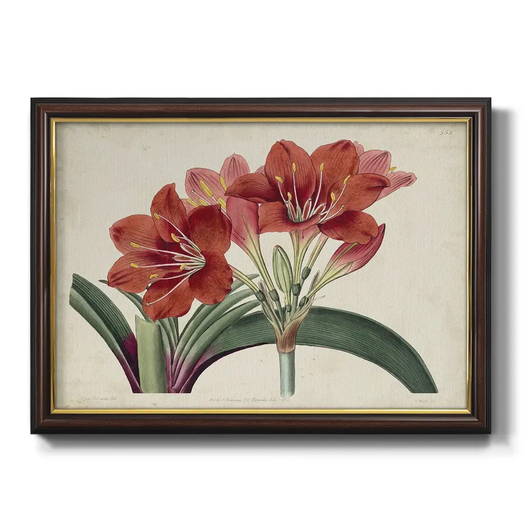 Amaryllis Splendor II Premium Framed Canvas- Ready to Hang A Premium Framed Canvas created to last. Framed in distressed wood and available in an array of sizes and colors Featuring a beveled a solid wood stretcher bar, each piece comes ready to hand 3 SIZES AVAILABLE 16''X20'' - Overall Size 18'X27'' - Overall Size 24''x36'' - Overall Size Each piece is made to order. Each piece comes with hanging hardware. Made in the USA Ready to Hang Giclee Paper Print Acrylic Glass Beveled Matt Board
