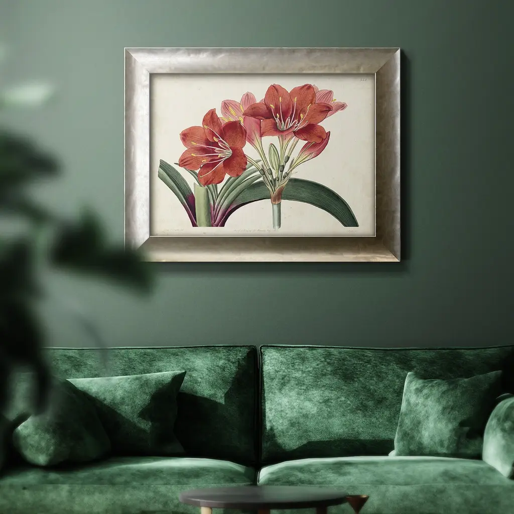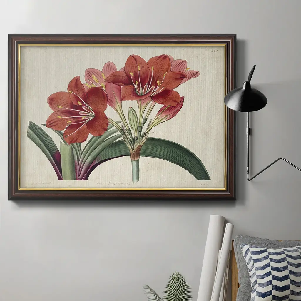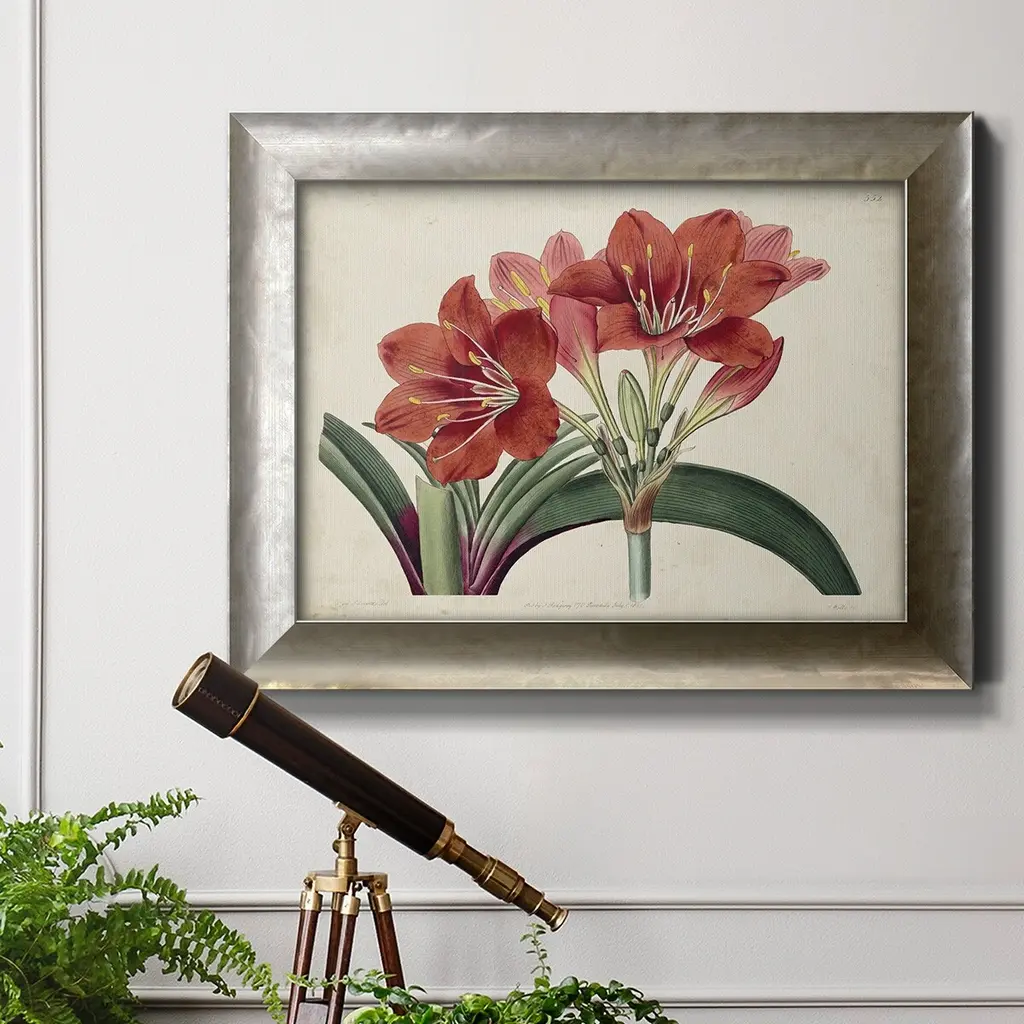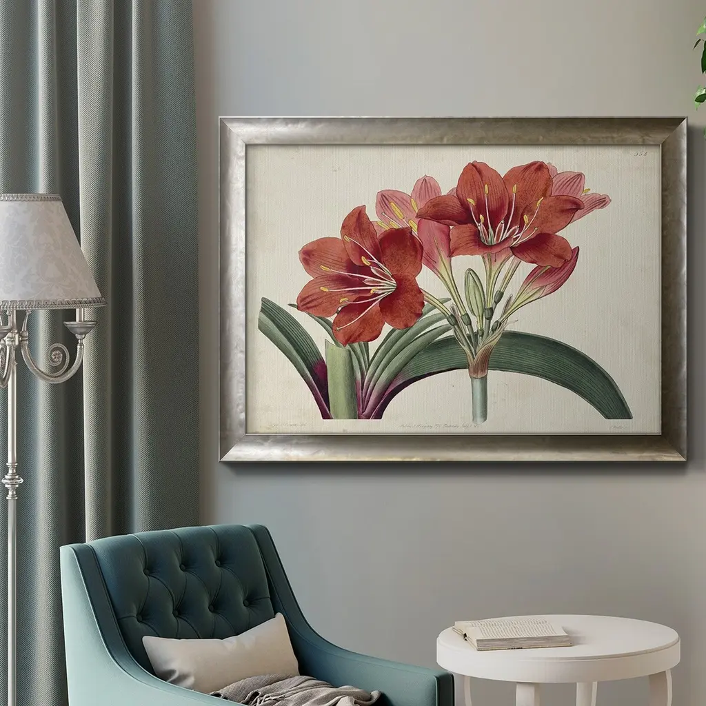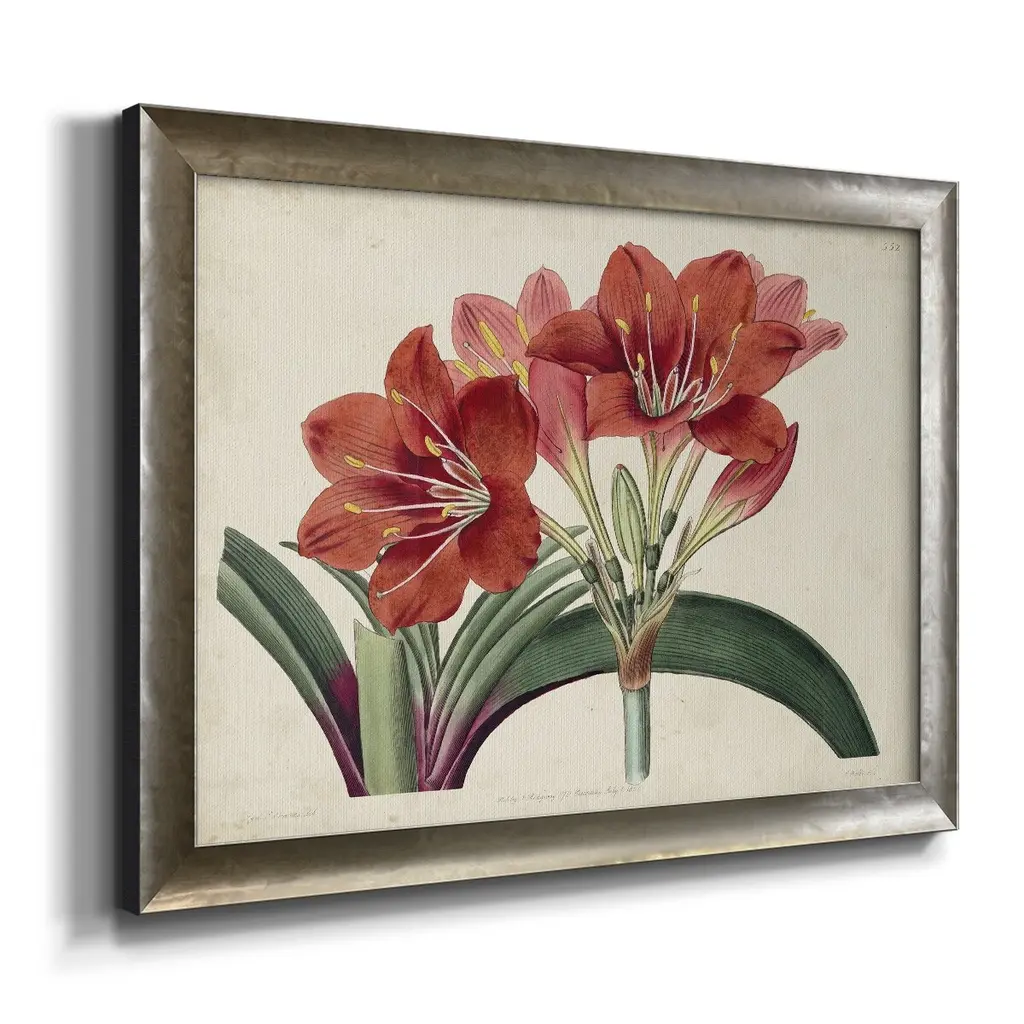 Amaryllis Splendor II Premium Framed Canvas- Ready to Hang A Premium Framed Canvas created to last. Framed in distressed wood and available in an array of sizes and colors Featuring a beveled a solid wood stretcher bar, each piece comes ready to hand 3 SIZES AVAILABLE 16''X20'' - Overall Size 18'X27'' - Overall Size 24''x36'' - Overall Size Each piece is made to order. Each piece comes with hanging hardware. Made in the USA Ready to Hang Giclee Paper Print Acrylic Glass Beveled Matt Board