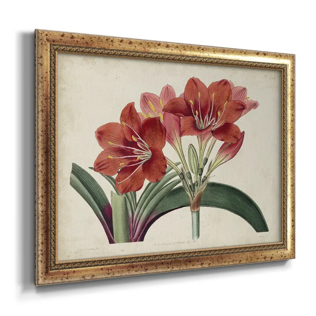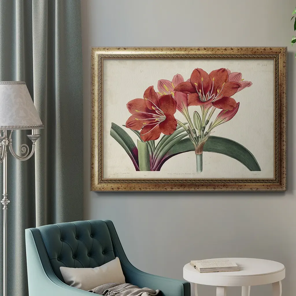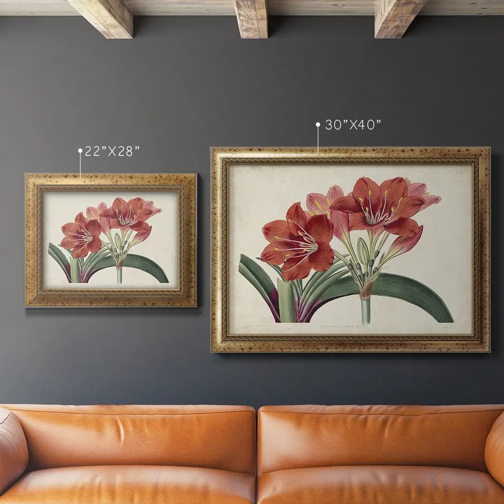 Amaryllis Splendor II Premium Framed Canvas- Ready to Hang A Premium Framed Canvas created to last. Framed in distressed wood and available in an array of sizes and colors Featuring a beveled a solid wood stretcher bar, each piece comes ready to hand 3 SIZES AVAILABLE 16''X20'' - Overall Size 18'X27'' - Overall Size 24''x36'' - Overall Size Each piece is made to order. Each piece comes with hanging hardware. Made in the USA Ready to Hang Giclee Paper Print Acrylic Glass Beveled Matt Board