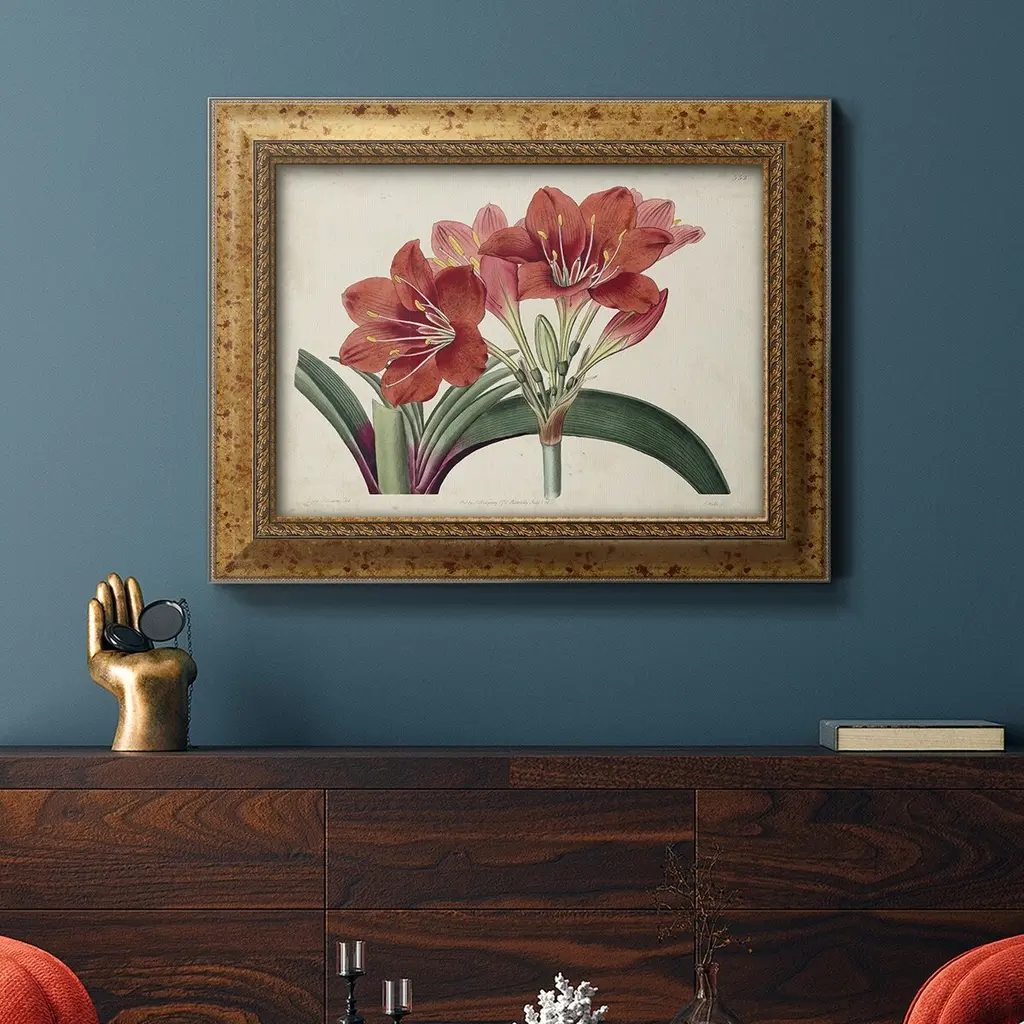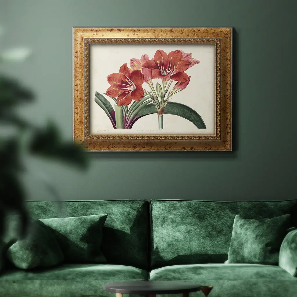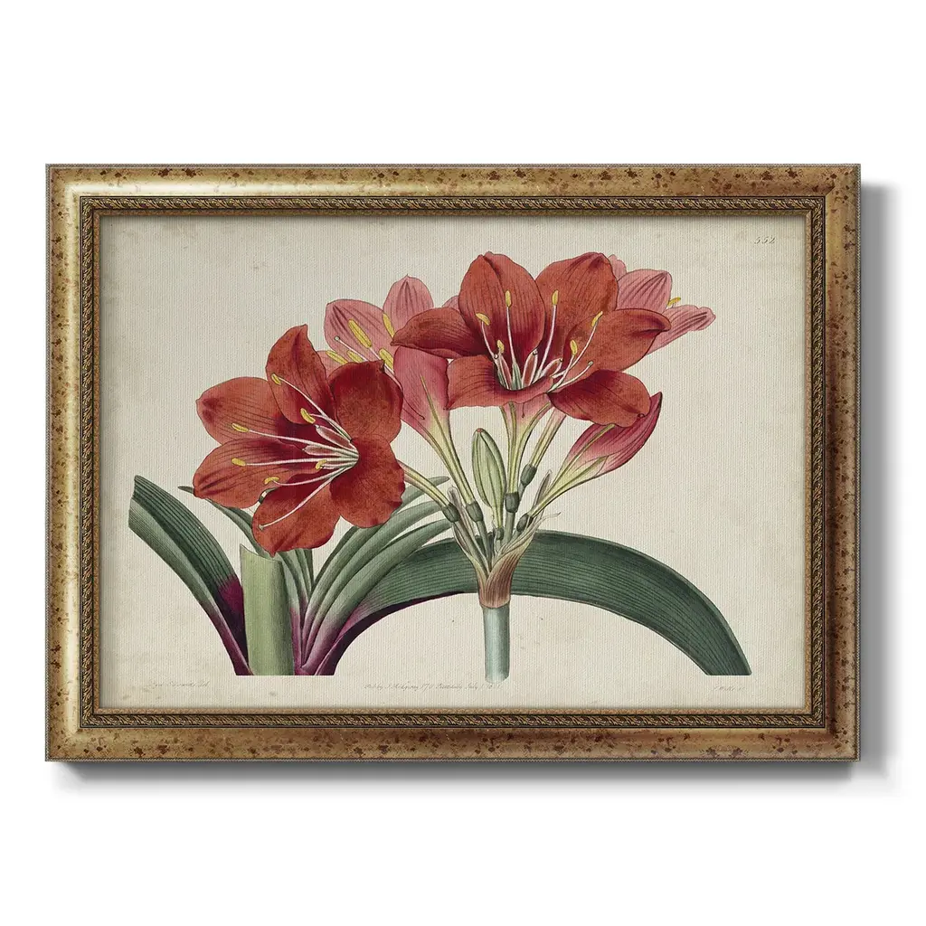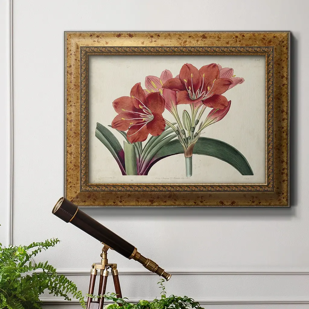 Amaryllis Splendor II Premium Framed Canvas- Ready to Hang A Premium Framed Canvas created to last. Framed in distressed wood and available in an array of sizes and colors Featuring a beveled a solid wood stretcher bar, each piece comes ready to hand 3 SIZES AVAILABLE 16''X20'' - Overall Size 18'X27'' - Overall Size 24''x36'' - Overall Size Each piece is made to order. Each piece comes with hanging hardware. Made in the USA Ready to Hang Giclee Paper Print Acrylic Glass Beveled Matt Board