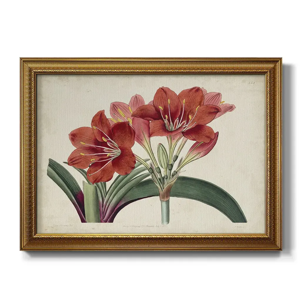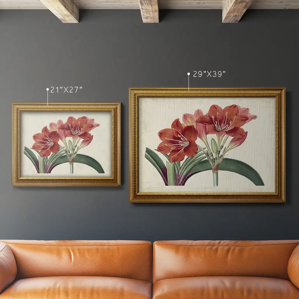 Amaryllis Splendor II Premium Framed Canvas- Ready to Hang A Premium Framed Canvas created to last. Framed in distressed wood and available in an array of sizes and colors Featuring a beveled a solid wood stretcher bar, each piece comes ready to hand 3 SIZES AVAILABLE 16''X20'' - Overall Size 18'X27'' - Overall Size 24''x36'' - Overall Size Each piece is made to order. Each piece comes with hanging hardware. Made in the USA Ready to Hang Giclee Paper Print Acrylic Glass Beveled Matt Board