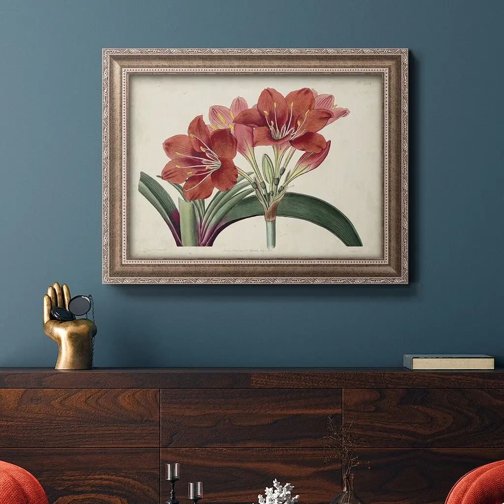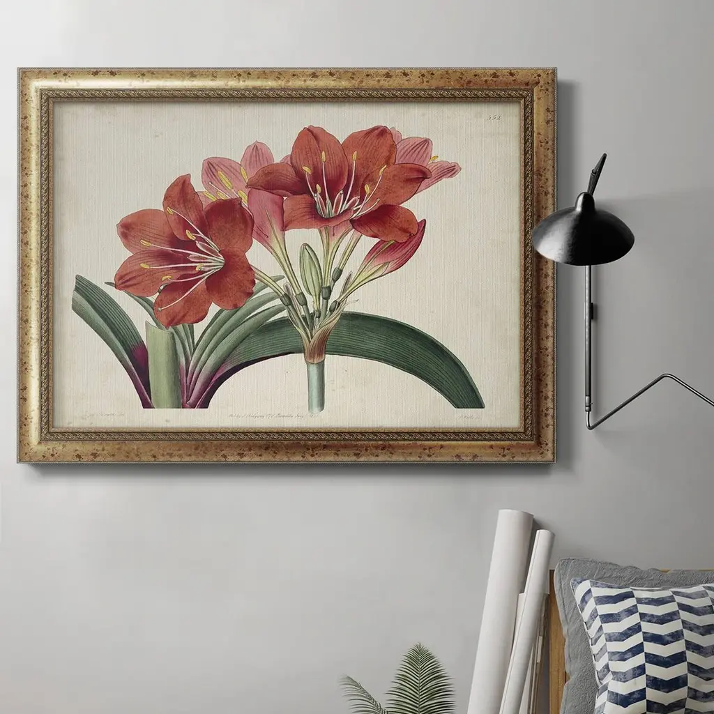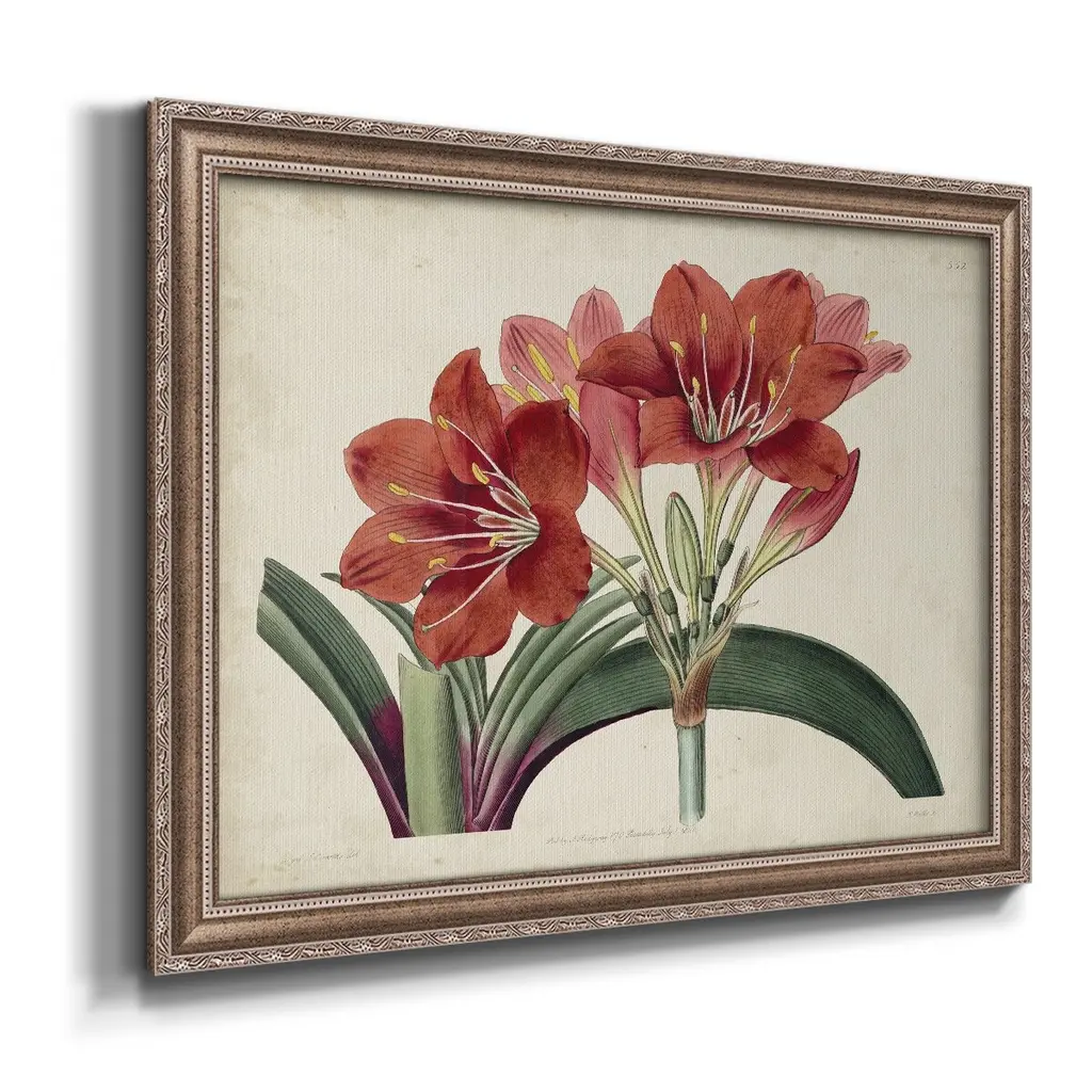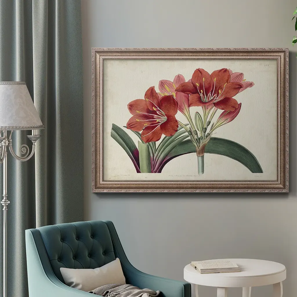Amaryllis Splendor II Premium Framed Canvas- Ready to Hang A Premium Framed Canvas created to last. Framed in distressed wood and available in an array of sizes and colors Featuring a beveled a solid wood stretcher bar, each piece comes ready to hand 3 SIZES AVAILABLE 16''X20'' - Overall Size 18'X27'' - Overall Size 24''x36'' - Overall Size Each piece is made to order. Each piece comes with hanging hardware. Made in the USA Ready to Hang Giclee Paper Print Acrylic Glass Beveled Matt Board