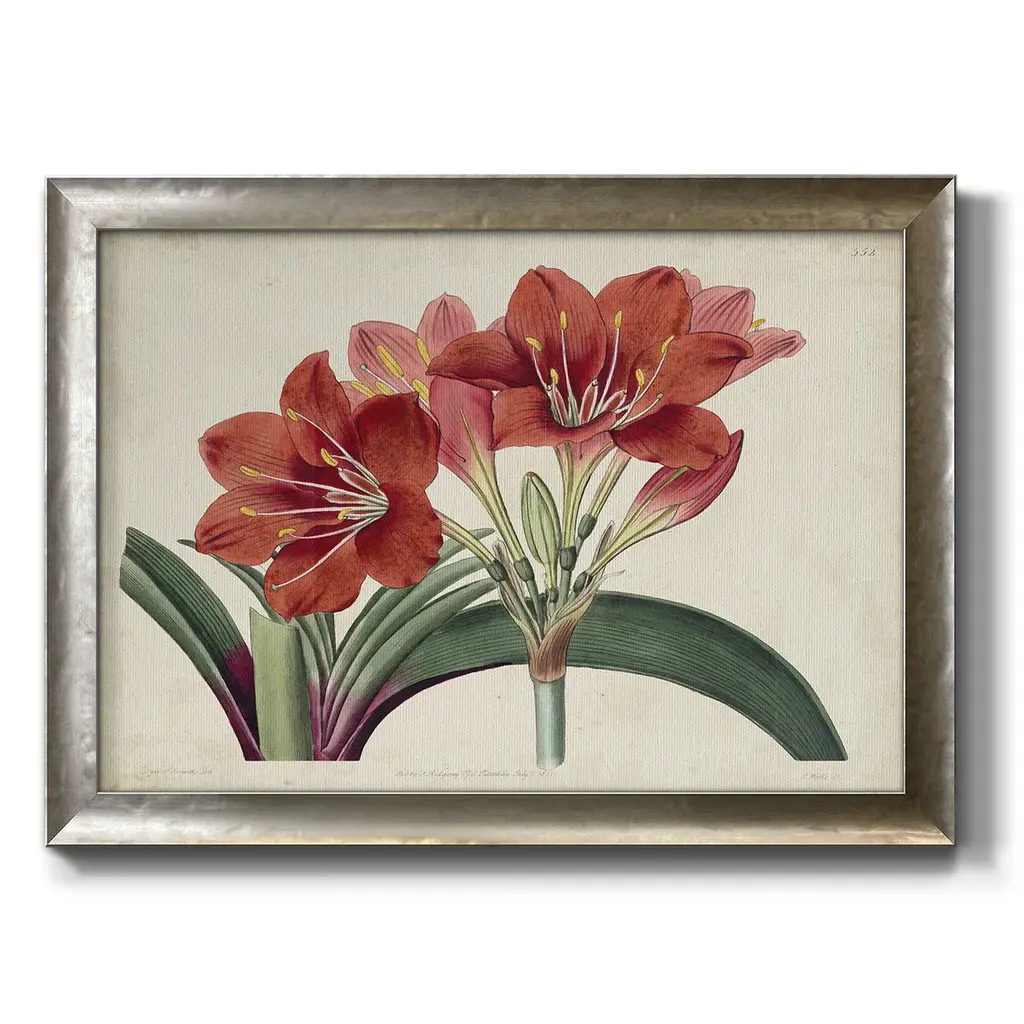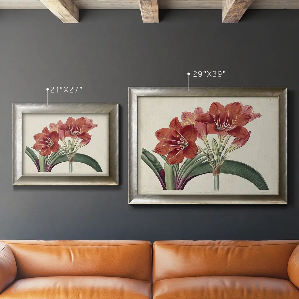 Amaryllis Splendor II Premium Framed Canvas- Ready to Hang A Premium Framed Canvas created to last. Framed in distressed wood and available in an array of sizes and colors Featuring a beveled a solid wood stretcher bar, each piece comes ready to hand 3 SIZES AVAILABLE 16''X20'' - Overall Size 18'X27'' - Overall Size 24''x36'' - Overall Size Each piece is made to order. Each piece comes with hanging hardware. Made in the USA Ready to Hang Giclee Paper Print Acrylic Glass Beveled Matt Board