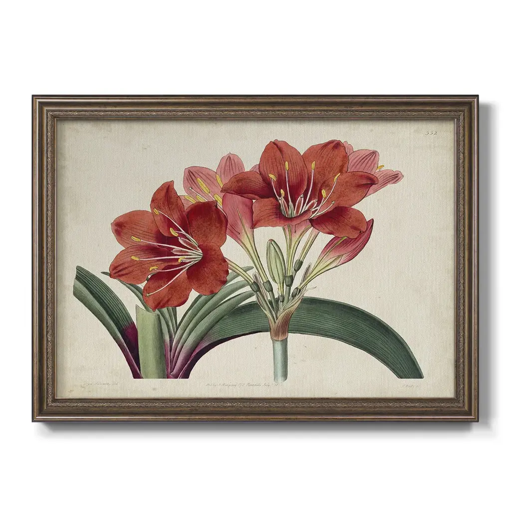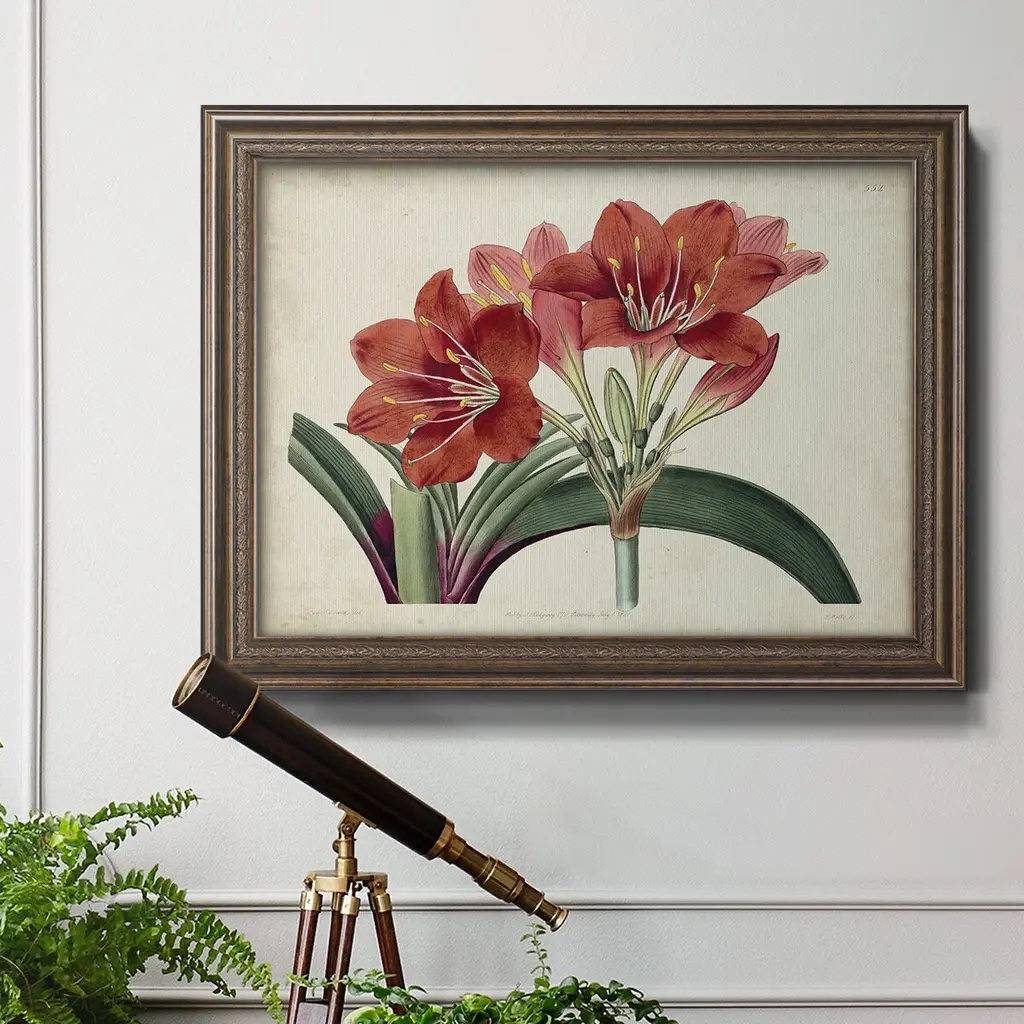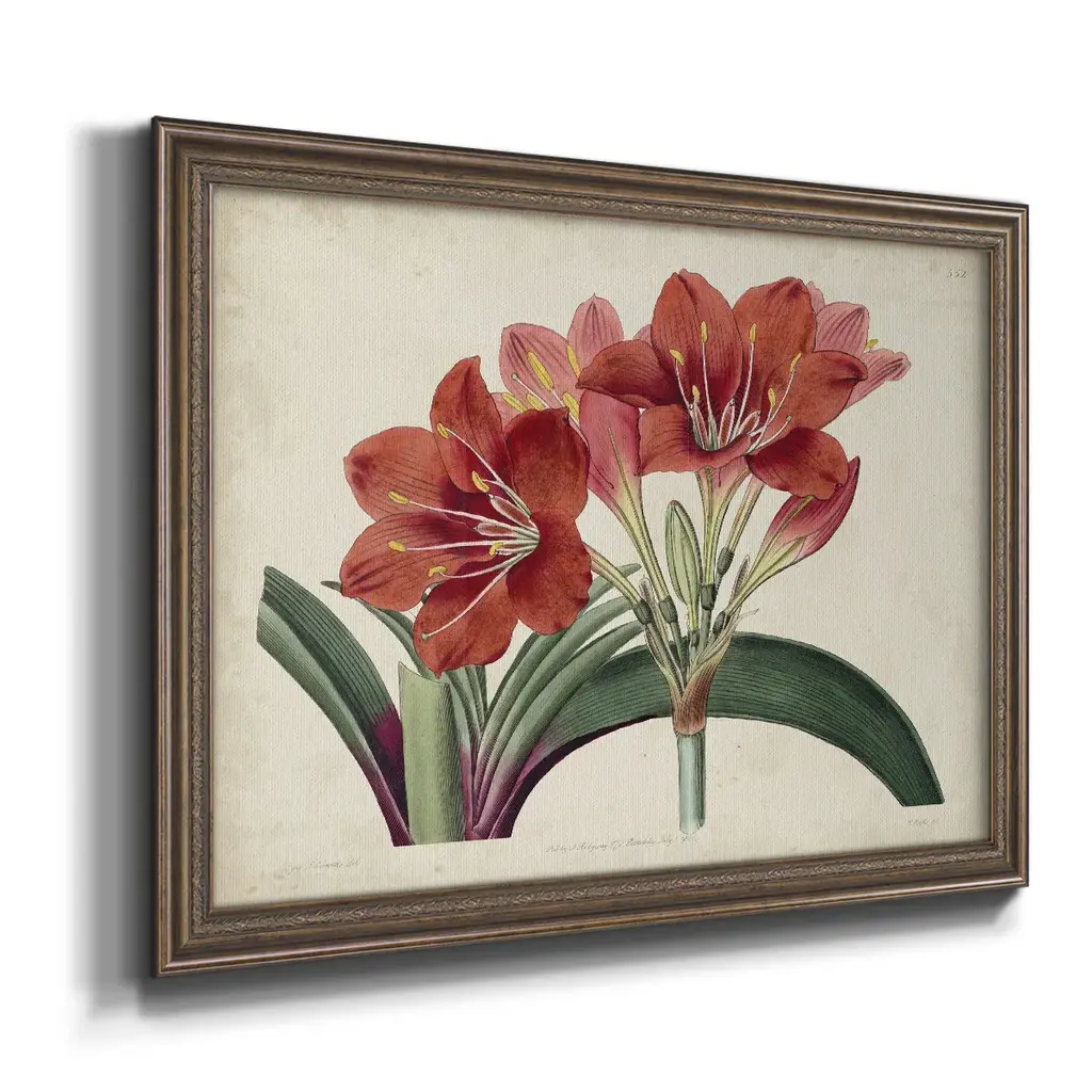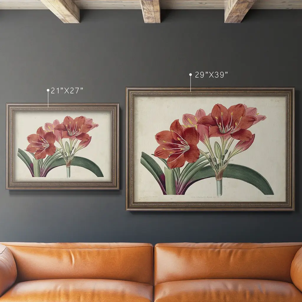 Amaryllis Splendor II Premium Framed Canvas- Ready to Hang A Premium Framed Canvas created to last. Framed in distressed wood and available in an array of sizes and colors Featuring a beveled a solid wood stretcher bar, each piece comes ready to hand 3 SIZES AVAILABLE 16''X20'' - Overall Size 18'X27'' - Overall Size 24''x36'' - Overall Size Each piece is made to order. Each piece comes with hanging hardware. Made in the USA Ready to Hang Giclee Paper Print Acrylic Glass Beveled Matt Board