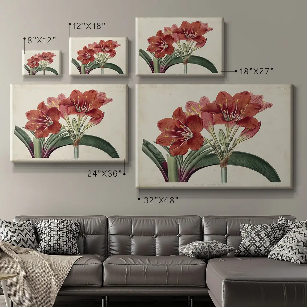 Amaryllis Splendor II Premium Gallery Wrapped Canvas - Ready to Hang A premium hand stretched gallery wrapped canvas print created to last. Featuring a beveled a solid wood stretcher bar, each piece comes ready to hand 6 SIZES AVAILABLE 8''X12'' - Overall Size 12''X18'' - Overall Size 18''X27'' - Overall Size 24''x36'' - Overall Size 32''x48'' - Overall Size 40''x60'' - Overall Size Each piece is made to order. Built to Last Each piece comes ready to hang Solid wood stretcher Fade and Water resistant Made domestically