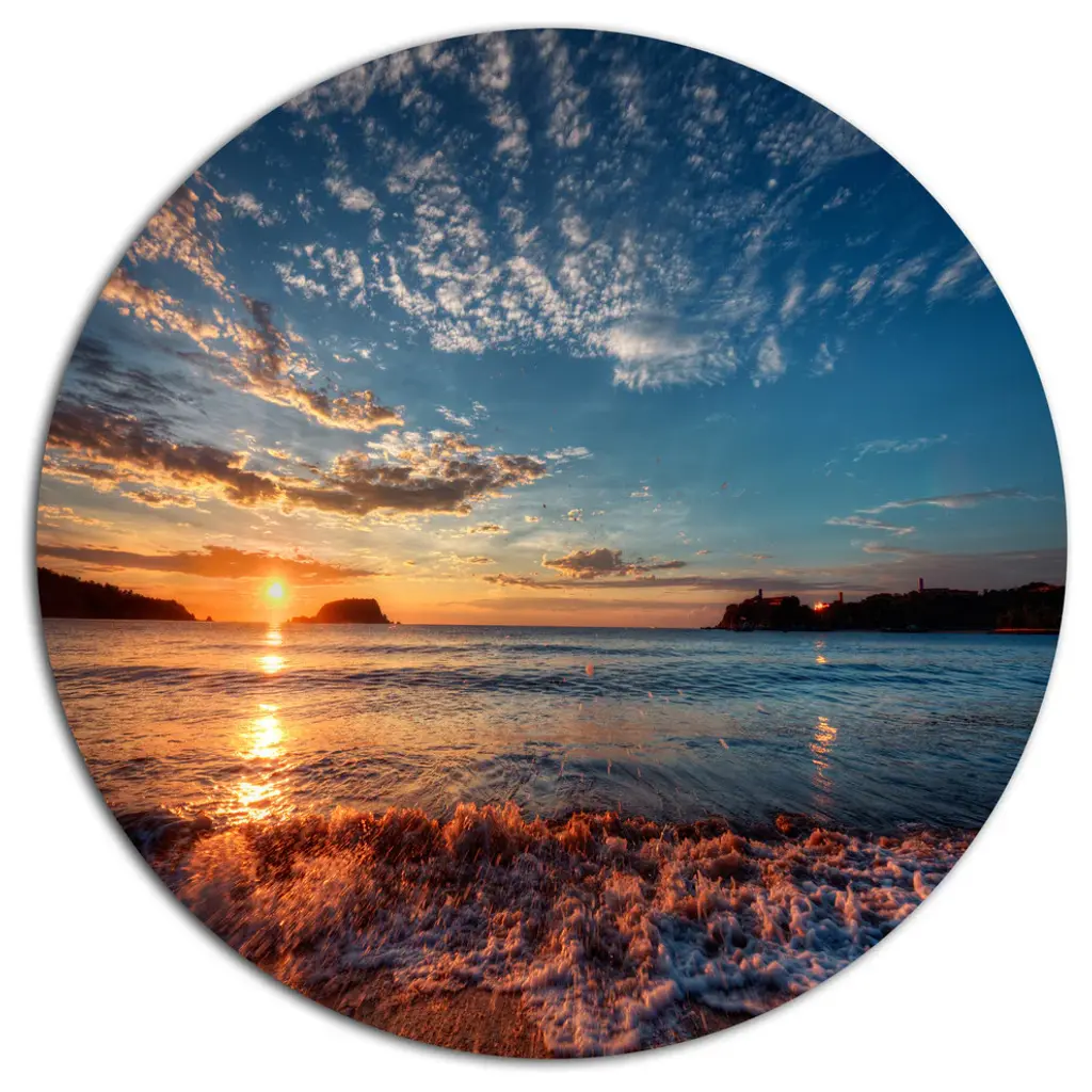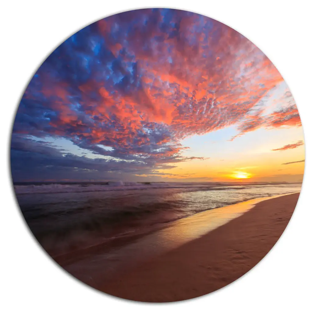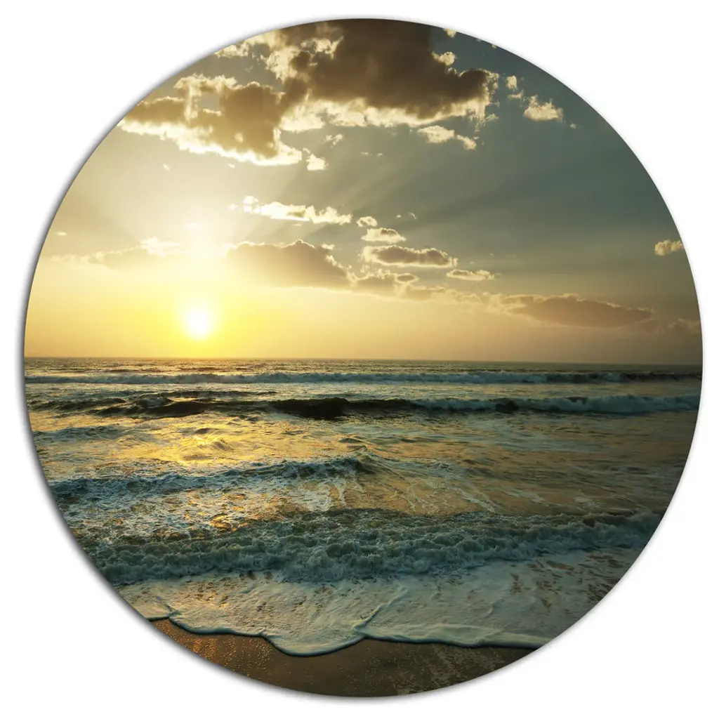 Bring Contemporary Abstraction to your home with this large Circle Metal wall art. This Amazing Beach with Beautiful Breaking Waves Metal Artwork makes it the focal point of any room or office. - White Gloss Coating ensures colors are extra vibrant with light reflection.- Aluminum grade Sheet Metal with 1 inch mounting frame on the back giving the illusion that the artwork is floating on the wall..- Mounting Brackets are included along with instructions.- High Quality Digital images are created directly into a glossy aluminum panel producing a stunning and captivating print into the glossy finish of the metal.- Water, Fire and Scratch resistant HD Aluminum panels.- Looks better than any photo paper and guaranteed to last at least 20 years- Easy to clean with a microfiber cloth. Colors are far superior to regular Canvas Art. - Easy to Hang